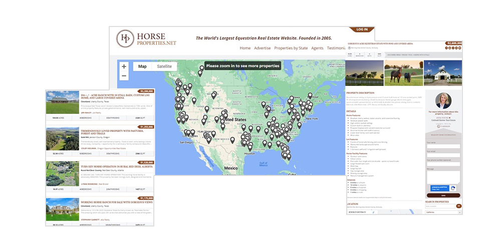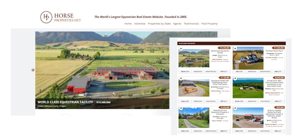 HorseProperties.Net® is the premier destination for equestrian properties. With millions of page views, excellent website engagement, and thousands of sessions, you can be assured of buyers actively searching for equine real estate.
