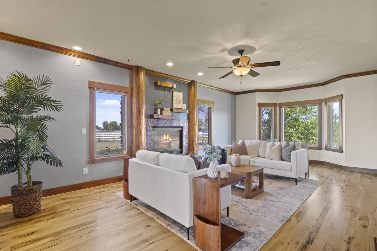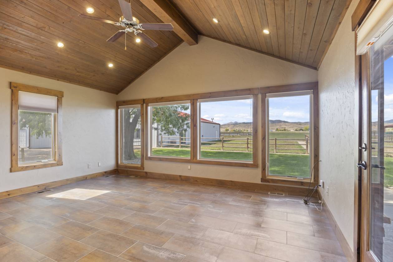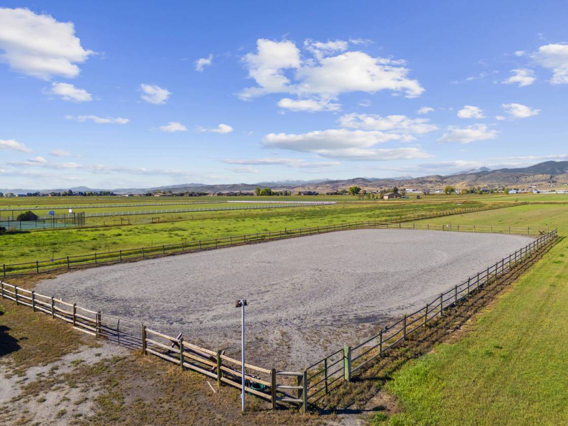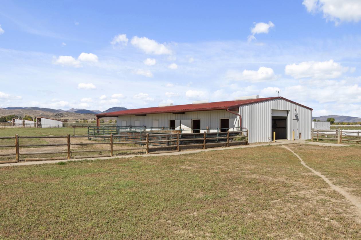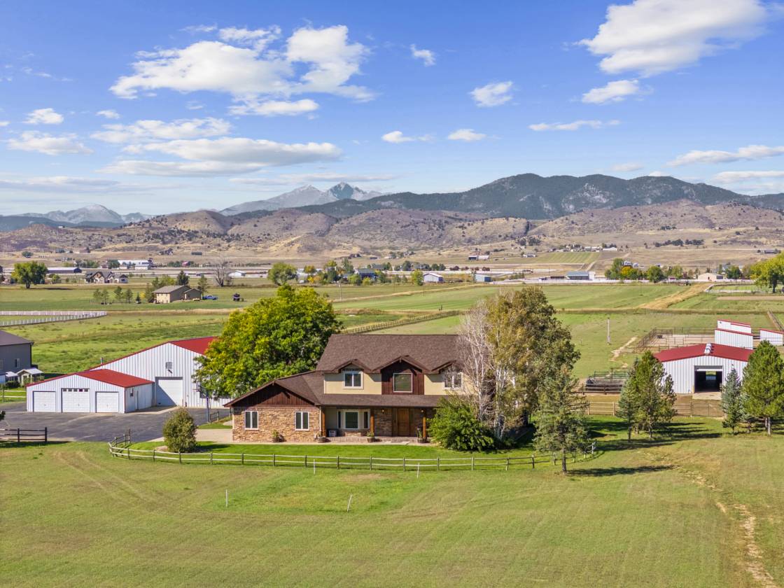 Welcome to your dream farmhouse retreat in Loveland, Colorado. This rare 4-bedroom, 3-bath horse property sits on an 8.75-acre lot with panoramic views of the Rockies. Open, light-filled layout highlighted by hardwood floors, fresh finishes, and thoughtful updates throughout. Relax by the fire in inviting living room, one of many cozy gathering areas. Across the hall find a 4th non-conforming bedroom great as a guest room or private office with nearby 3/4 bath. At the heart of the home is the gourmet kitchen-with granite countertops, stainless steel appliances, double ovens, and an oversized kitchen island. This space flows seamlessly into a large dining area with dedicated space for both eat-in and formal dining - all with gorgeous views. Whether you envision movie nights, a playroom, or a creative studio, the large recreation room offers flexibility with built-in workspaces for remote work, homework stations, or crafting projects. The sunroom is a highlight-wrapped in windows and filled with natural light, it offers breathtaking views that make it the perfect spot to watch a sunrise or sunset. Upstairs find an expansive primary suite, your private haven with a gas fireplace that adds warmth and charm and luxurious 5-piece bathroom with dual vanities, soaking tub, walk-in shower, and custom walk-in closet. Second and third bedrooms with a shared full bath complete the top floor. Step outside onto the patio with pergola and fire pit. Horse lovers will find everything they need including a 6-stall barn, arena, multiple loafing sheds and heated tack room - all with nearby trails for riding. A standout feature of this property is the huge workshop, which provides space for RV or boat storage or room for up to six additional vehicles as well as space for a home-based business, hobby workshop, or creative studio. Water rights included. Easy access to shopping, dining, schools, and healthcare, as well as quick connections to Fort Collins, Longmont, and I-25.