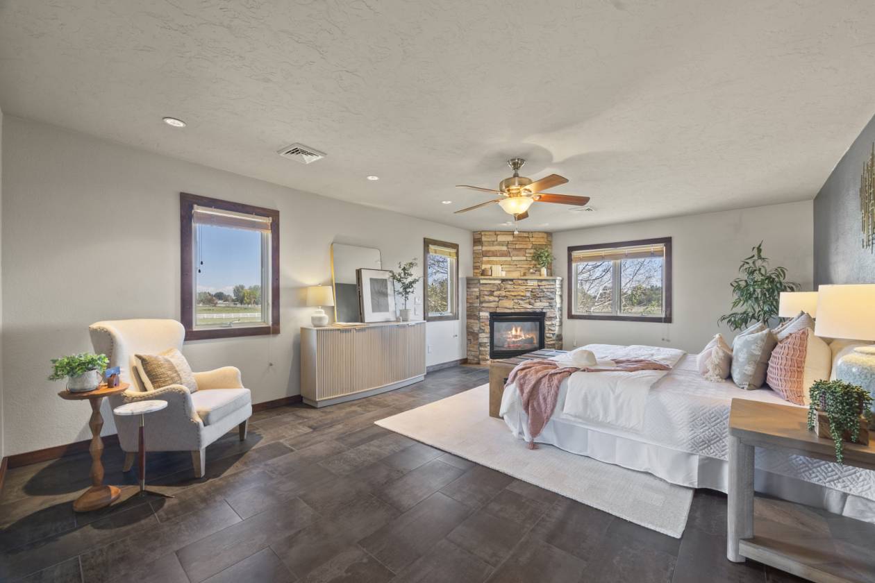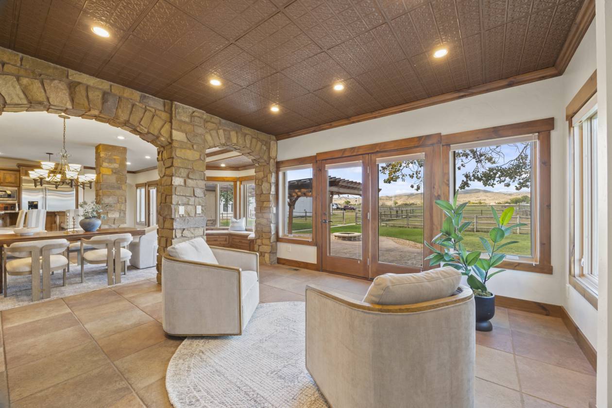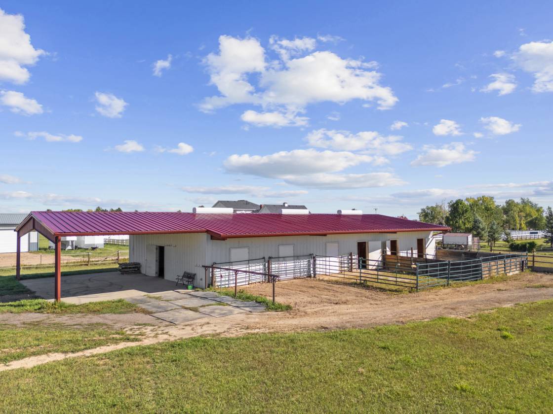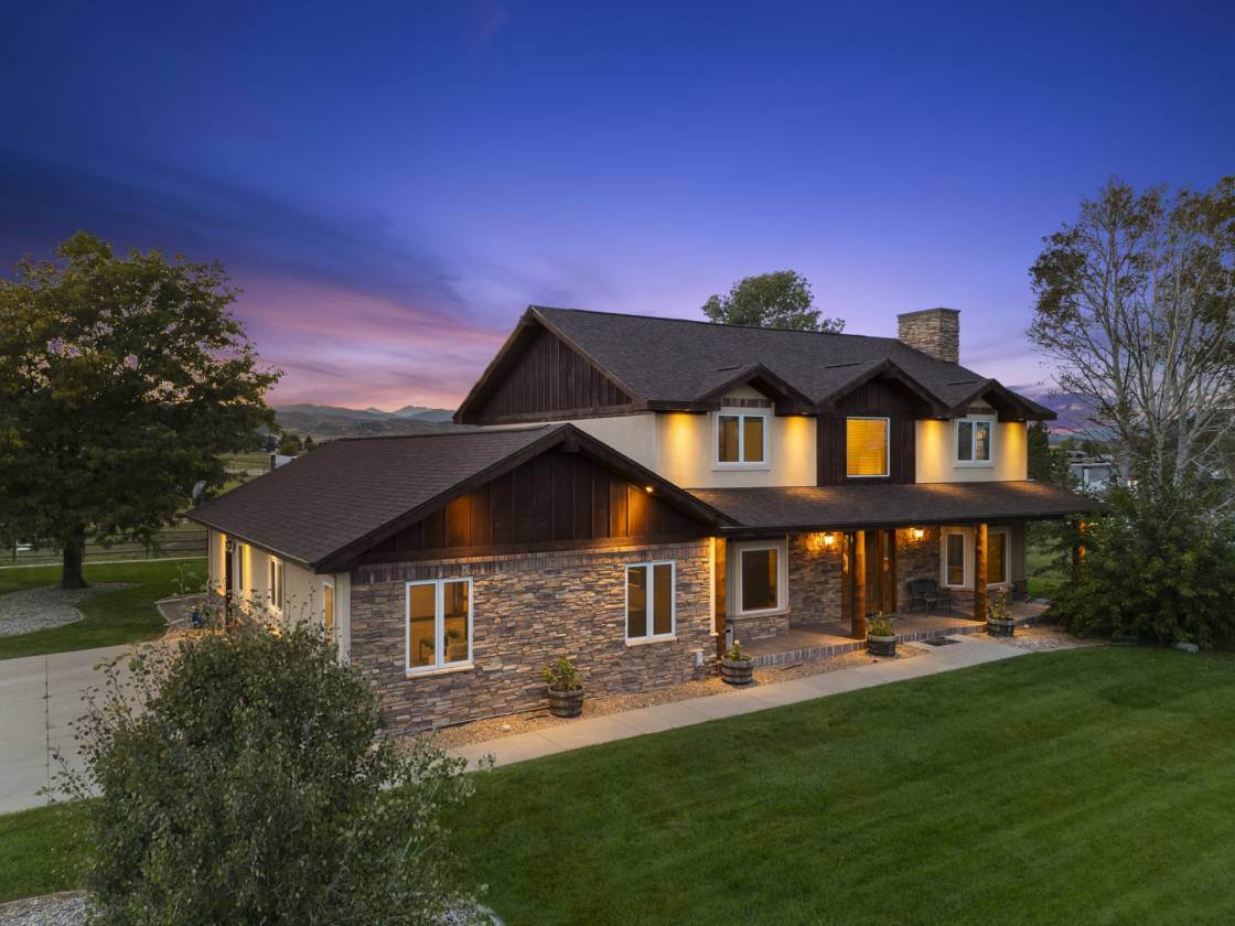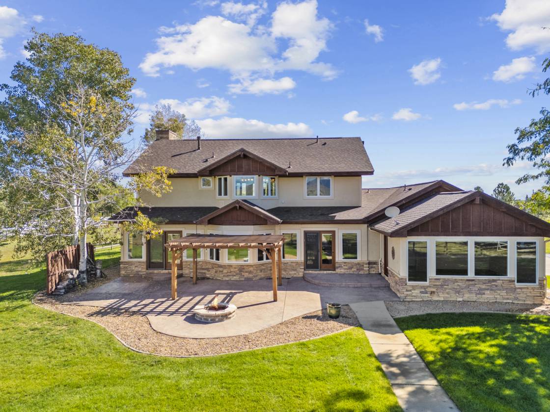 Welcome to your dream farmhouse retreat in Loveland, Colorado. This rare 4-bedroom, 3-bath horse property sits on an 8.75-acre lot with panoramic views of the Rockies. Open, light-filled layout highlighted by hardwood floors, fresh finishes, and thoughtful updates throughout. Relax by the fire in inviting living room, one of many cozy gathering areas. Across the hall find a 4th non-conforming bedroom great as a guest room or private office with nearby 3/4 bath. At the heart of the home is the gourmet kitchen-with granite countertops, stainless steel appliances, double ovens, and an oversized kitchen island. This space flows seamlessly into a large dining area with dedicated space for both eat-in and formal dining - all with gorgeous views. Whether you envision movie nights, a playroom, or a creative studio, the large recreation room offers flexibility with built-in workspaces for remote work, homework stations, or crafting projects. The sunroom is a highlight-wrapped in windows and filled with natural light, it offers breathtaking views that make it the perfect spot to watch a sunrise or sunset. Upstairs find an expansive primary suite, your private haven with a gas fireplace that adds warmth and charm and luxurious 5-piece bathroom with dual vanities, soaking tub, walk-in shower, and custom walk-in closet. Second and third bedrooms with a shared full bath complete the top floor. Step outside onto the patio with pergola and fire pit. Horse lovers will find everything they need including a 6-stall barn, arena, multiple loafing sheds and heated tack room - all with nearby trails for riding. A standout feature of this property is the huge workshop, which provides space for RV or boat storage or room for up to six additional vehicles as well as space for a home-based business, hobby workshop, or creative studio. Water rights included. Easy access to shopping, dining, schools, and healthcare, as well as quick connections to Fort Collins, Longmont, and I-25.