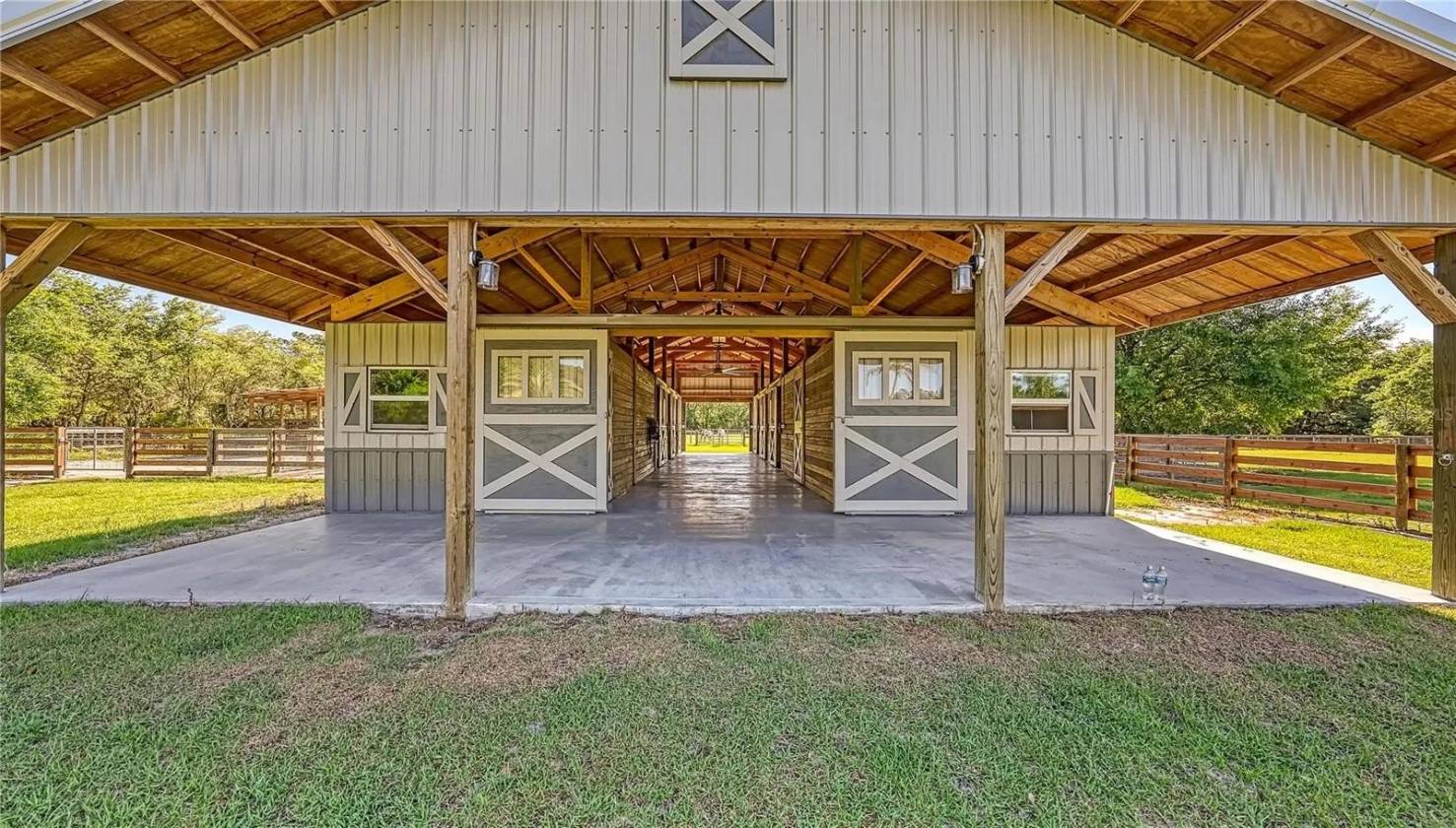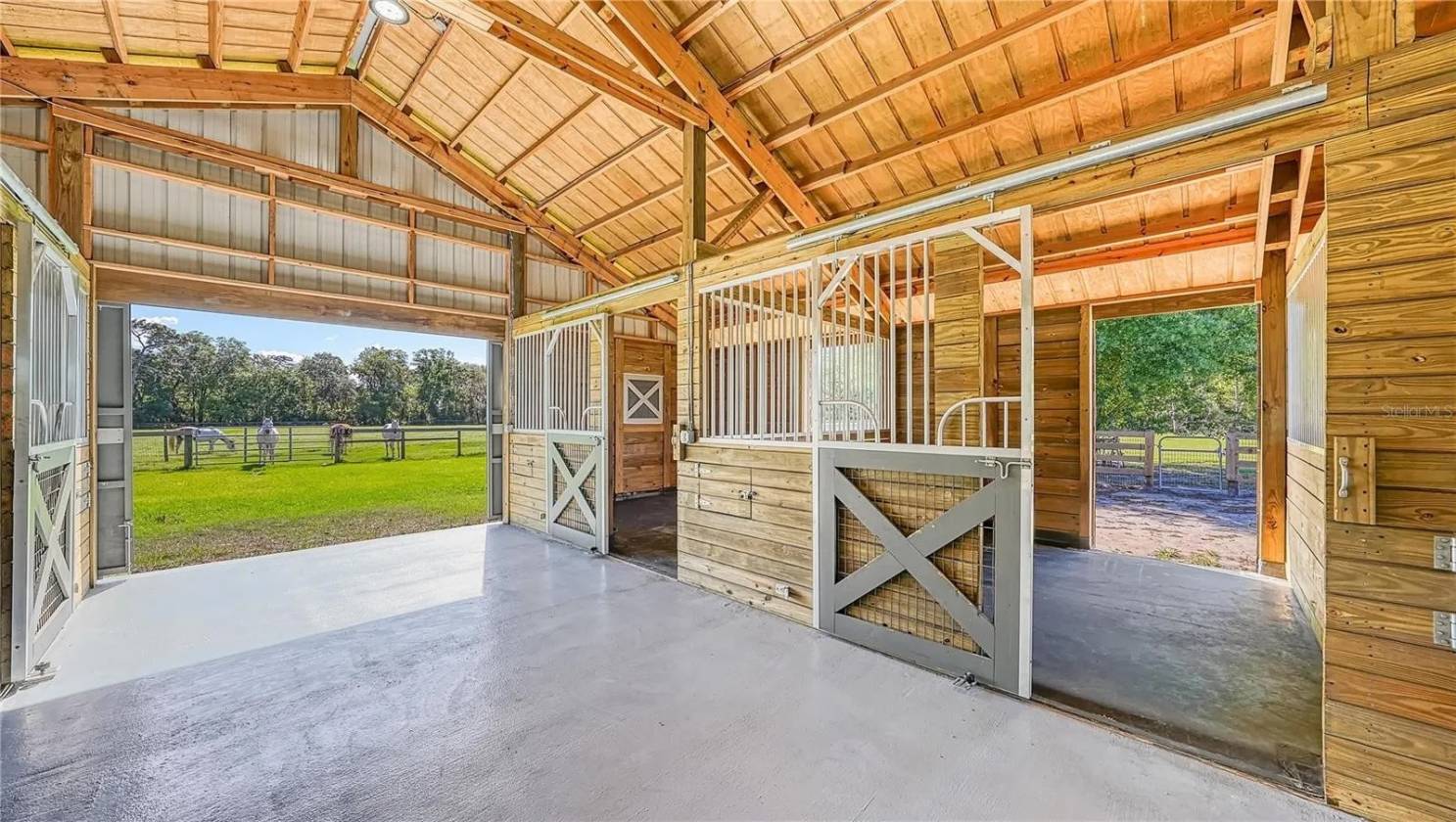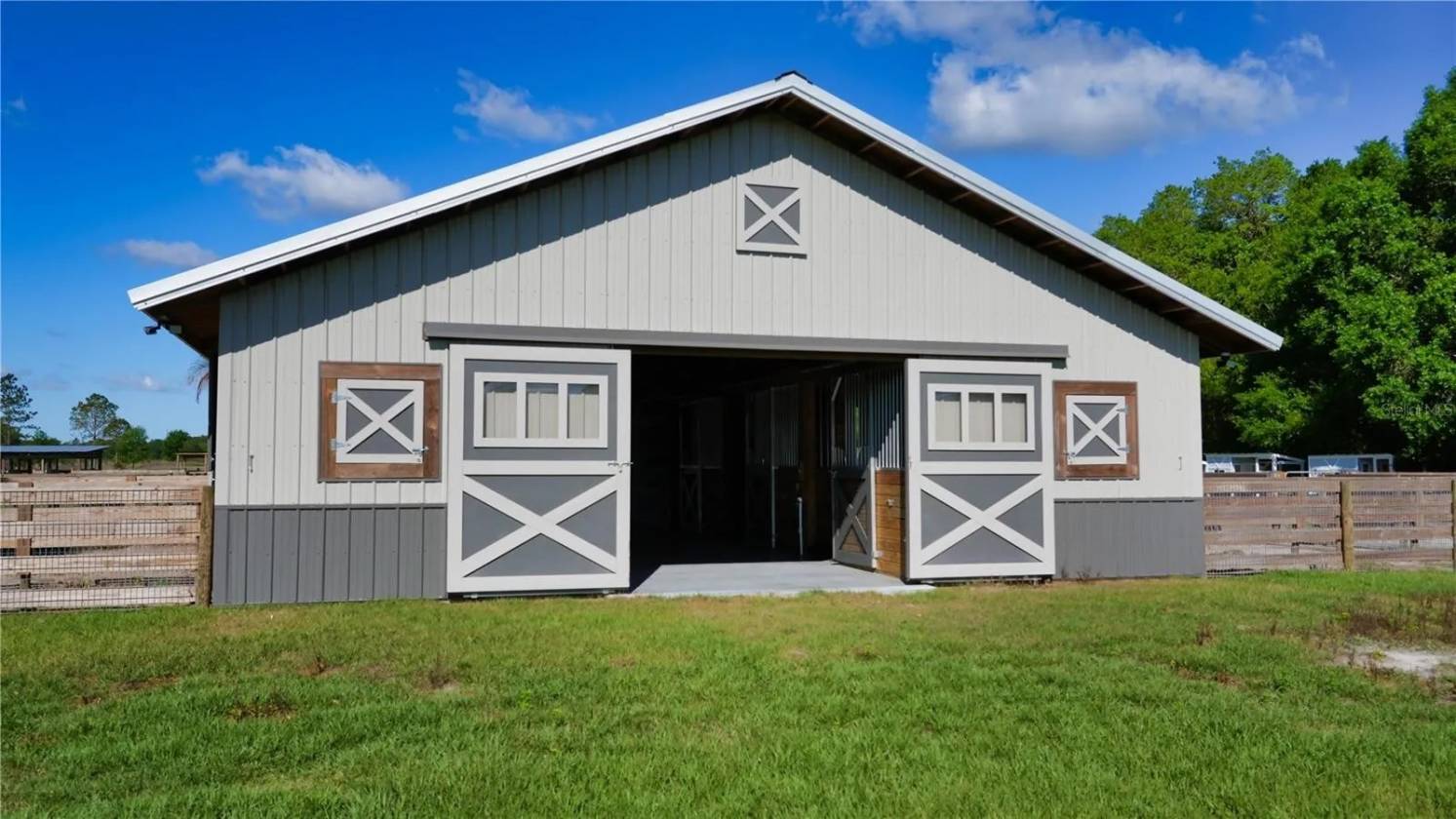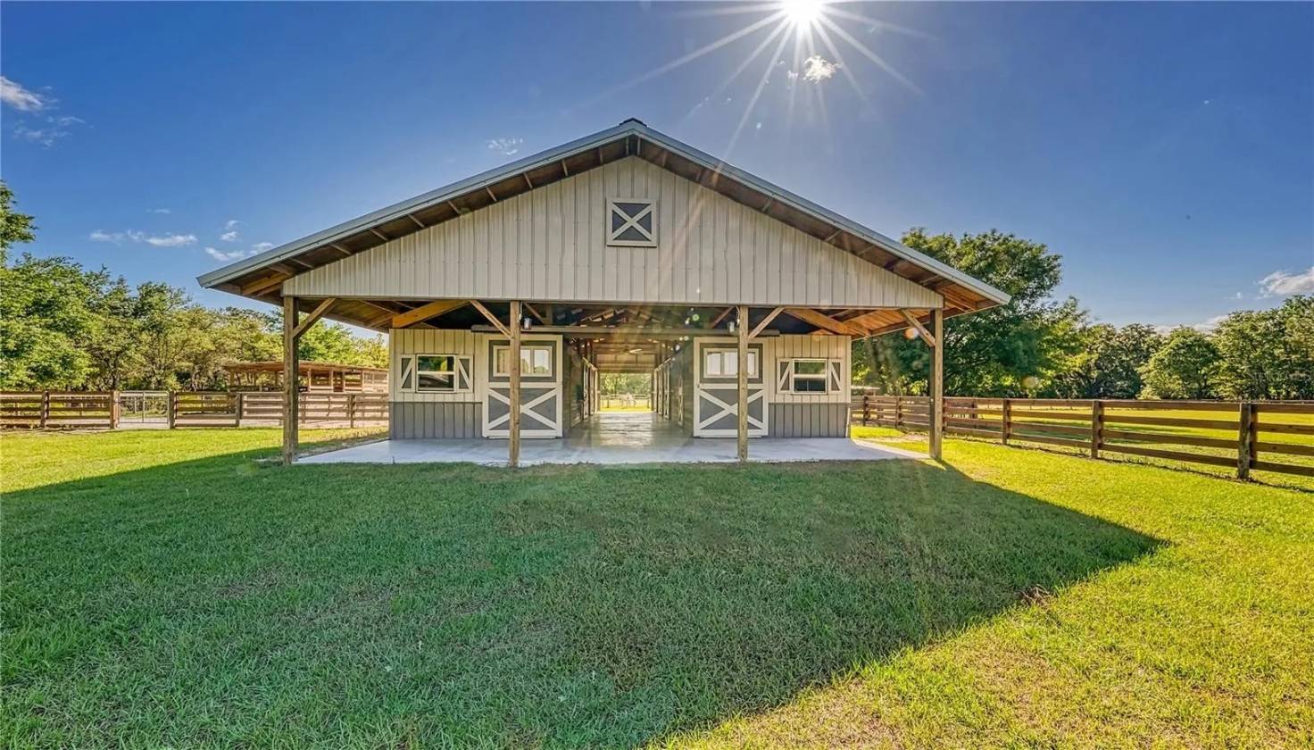 Two Florida-style barns and three shed-style barns provide an additional 12 stalls and an extra tack room, offering ample space for equine care and management.