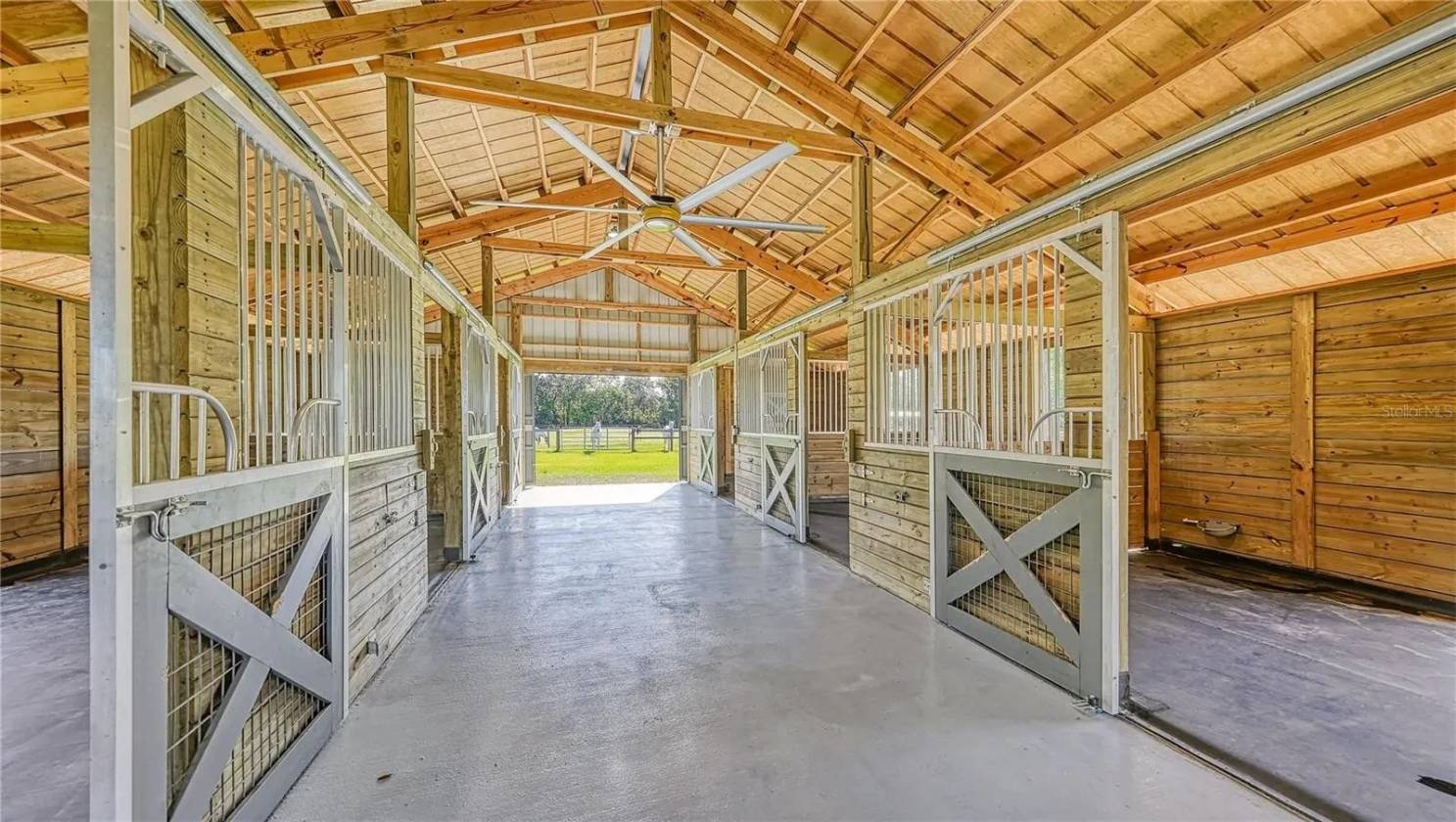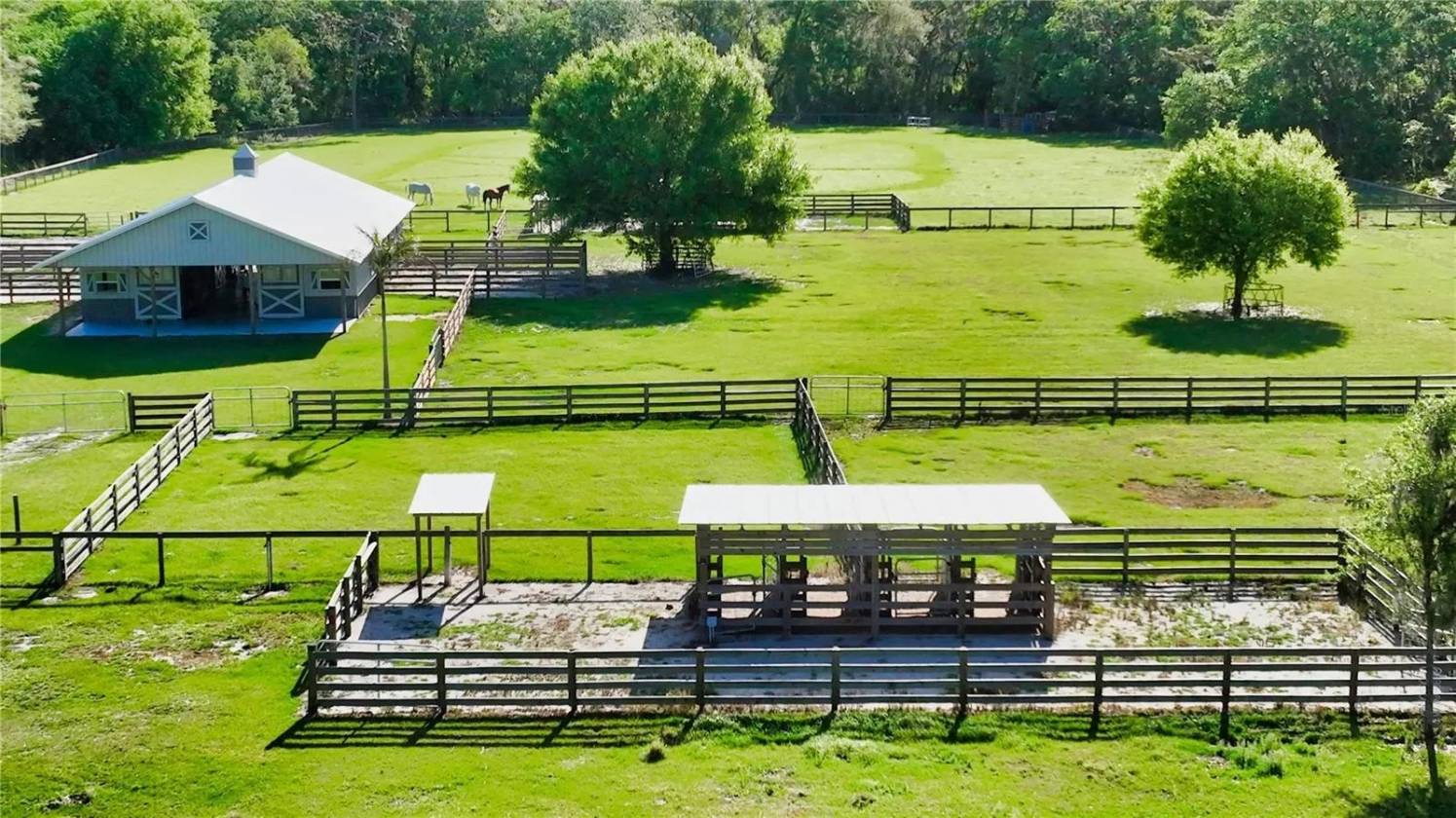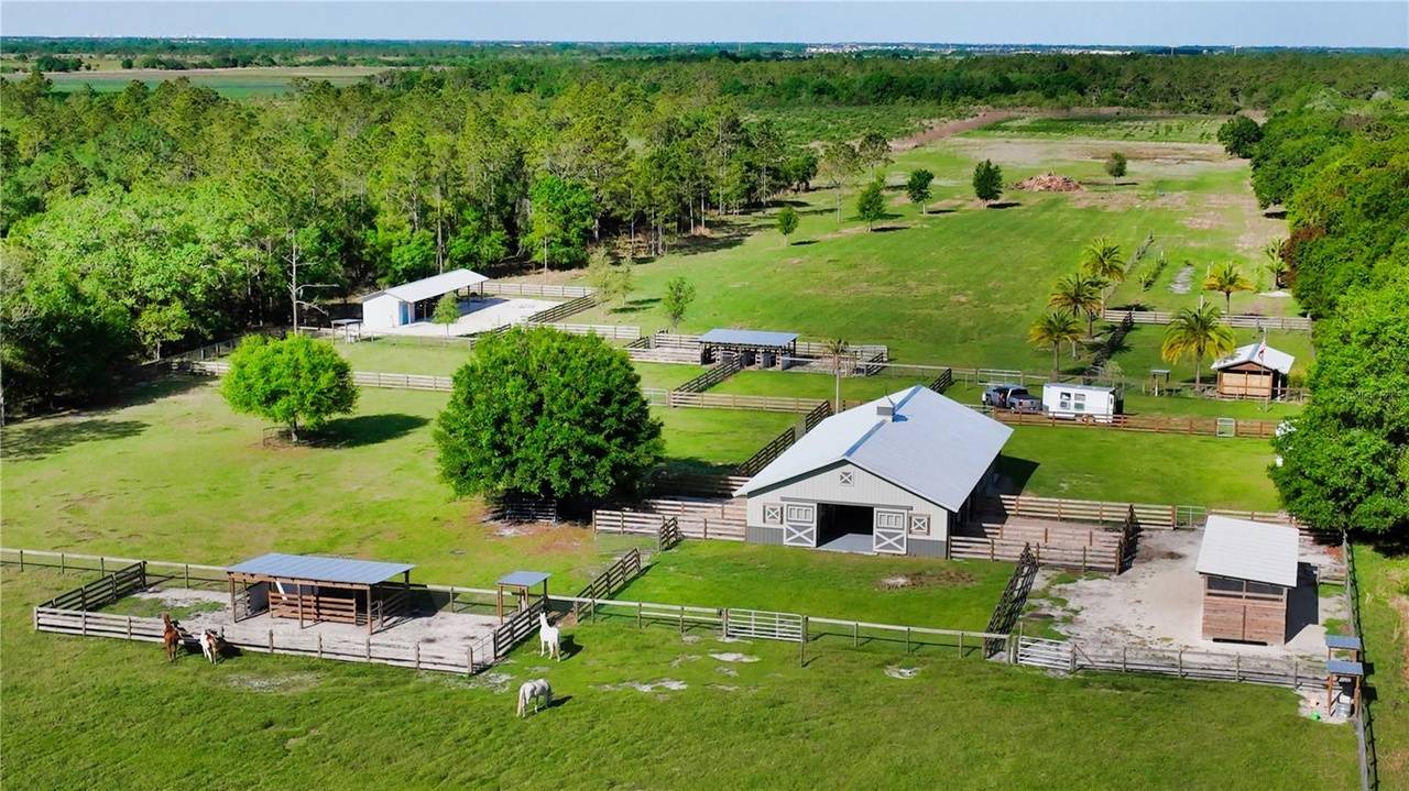 Two Florida-style barns and three shed-style barns provide an additional 12 stalls and an extra tack room, offering ample space for equine care and management.