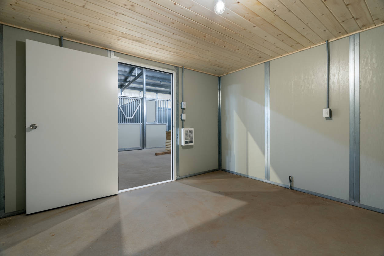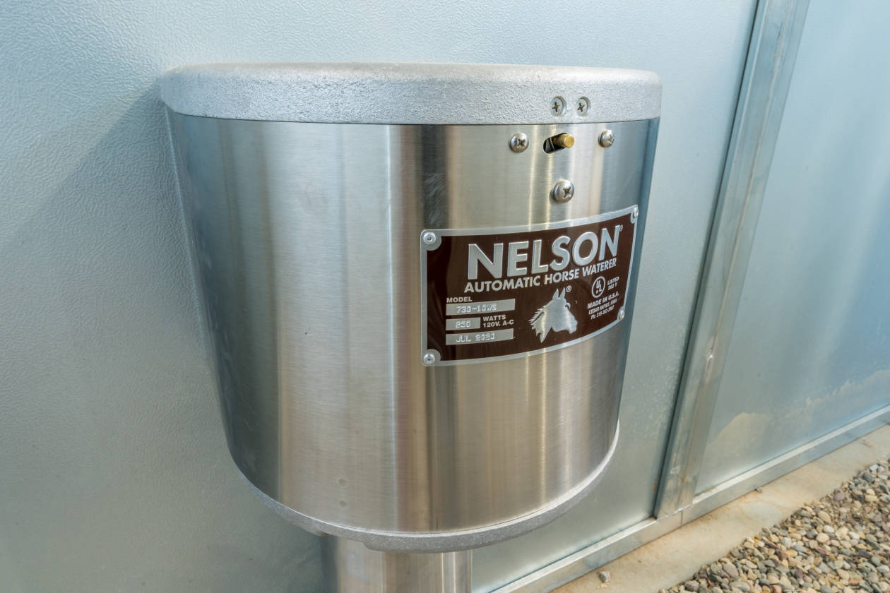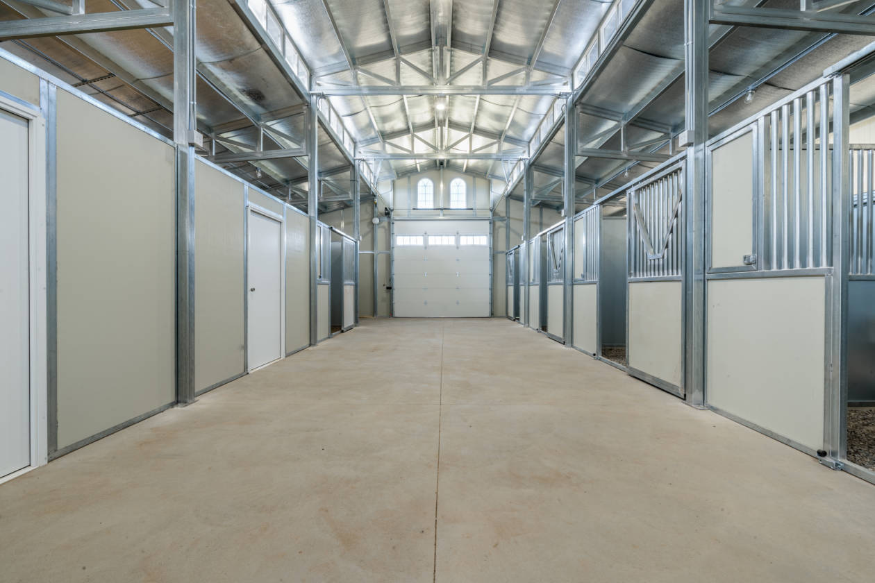 • The raised center barn is a seven stall barn 7 12x12 stalls), 6 stall have doors that would open to 12x40 pens. Beyond those pens, would have been a 100 x160 turnout area. Each stall has automated and heated Nelson waterers and rubber floor mats. The barn also has an enclosed tack room and feed room. The center aisle is 16 ft across. There is also a grooming bay that could be set up with water for a wash bay. The barn electric lighting and door openers are installed. It is wired to add fans and a heater but they are not installed. The barn is an MD Barn and designed to be fire resistant.