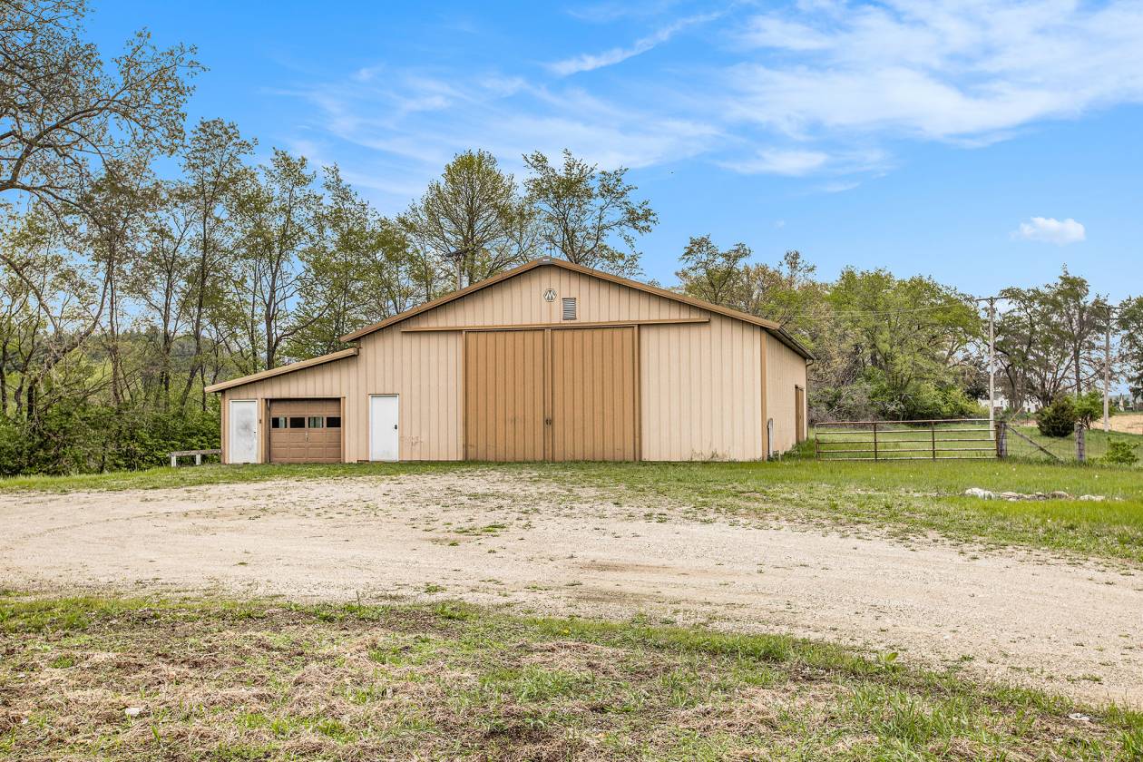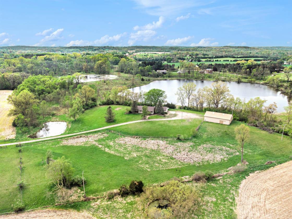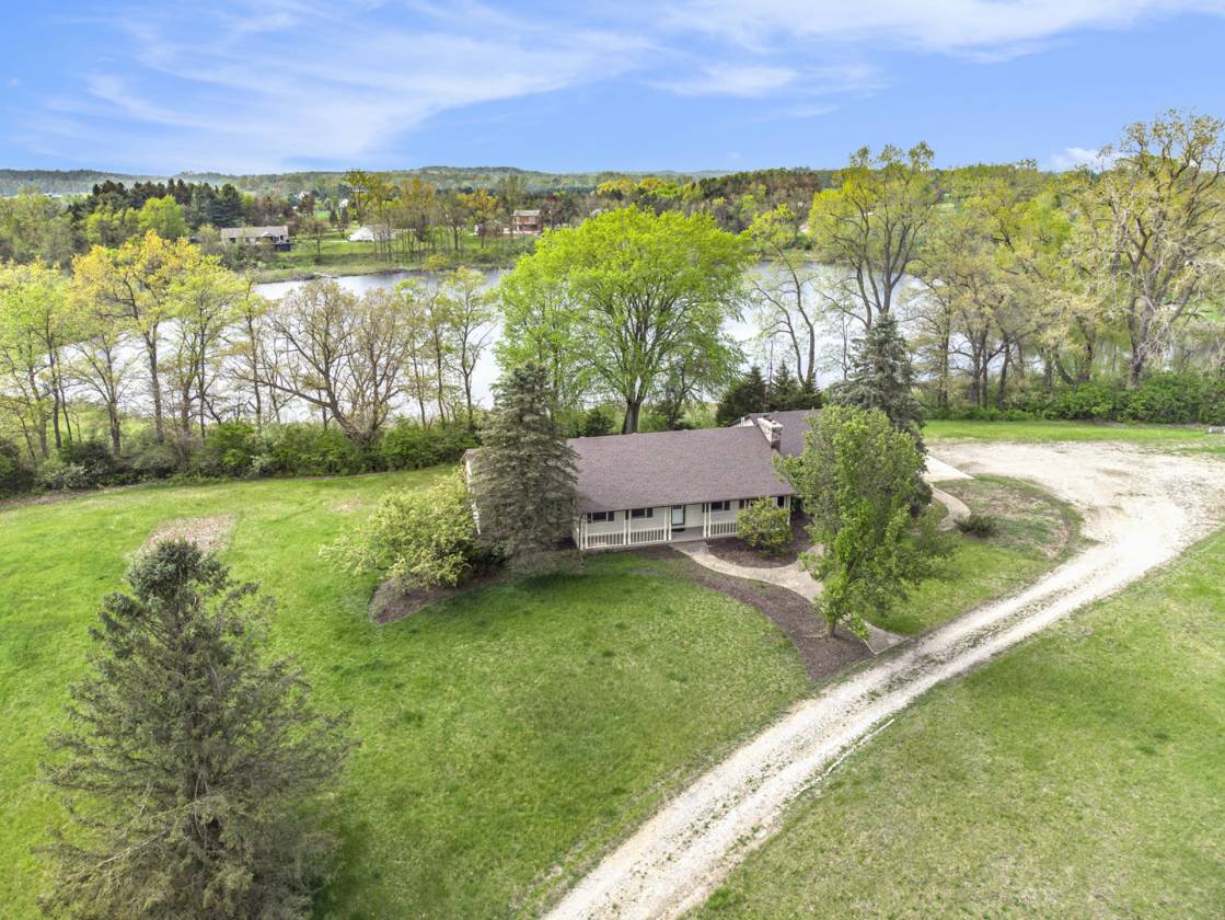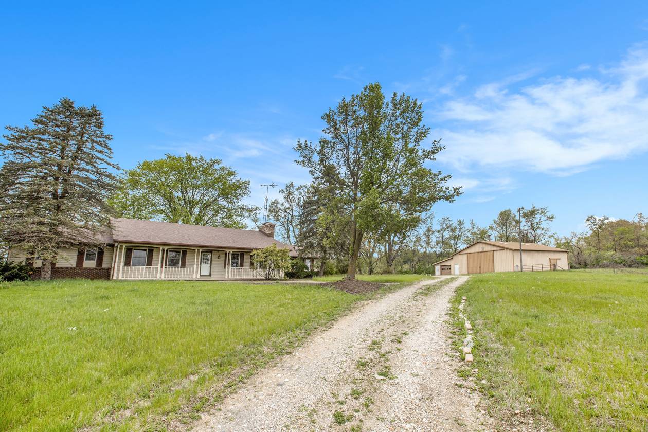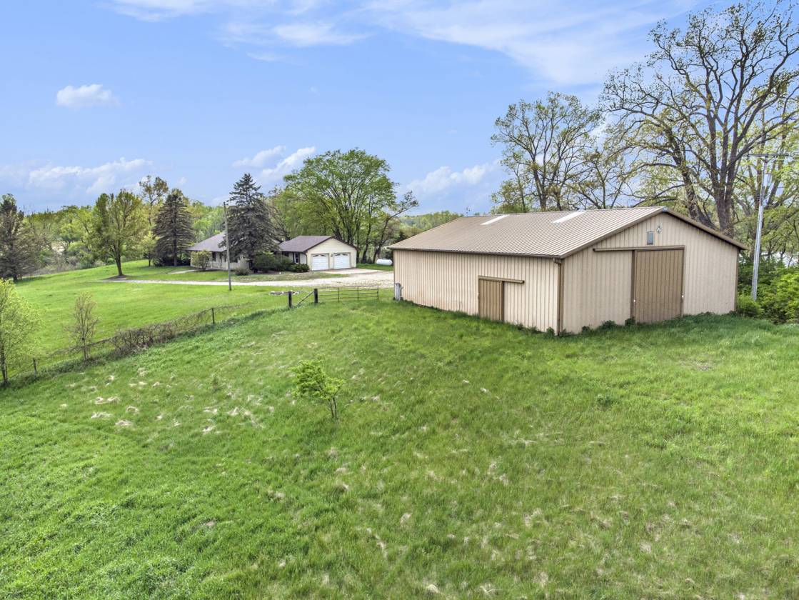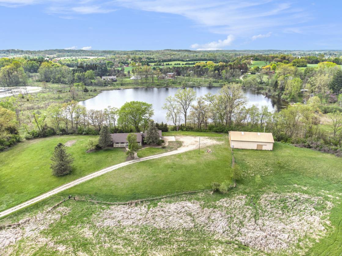 This is one-of-a-kind, incomparable property located just south of Manchester features frontage on a private lake. The panoramic water views are breathtaking from this nicely maintained ranch with 600 feet of lake frontage. Lake is electric motor only with restrictions. The property also includes a custom built 40 x 60 Morton Pole Barn with additional 16 x 45 shop space, 3 horse stalls, and multiple fenced areas for horses. The home is a 3 bedroom, 2 1/2 bath ranch and features a comfortable living room with fireplace, large kitchen and eating space, nice primary bedroom suite with attached bath, 2 good sized additional bedrooms, and a finished basement with two finished rooms.