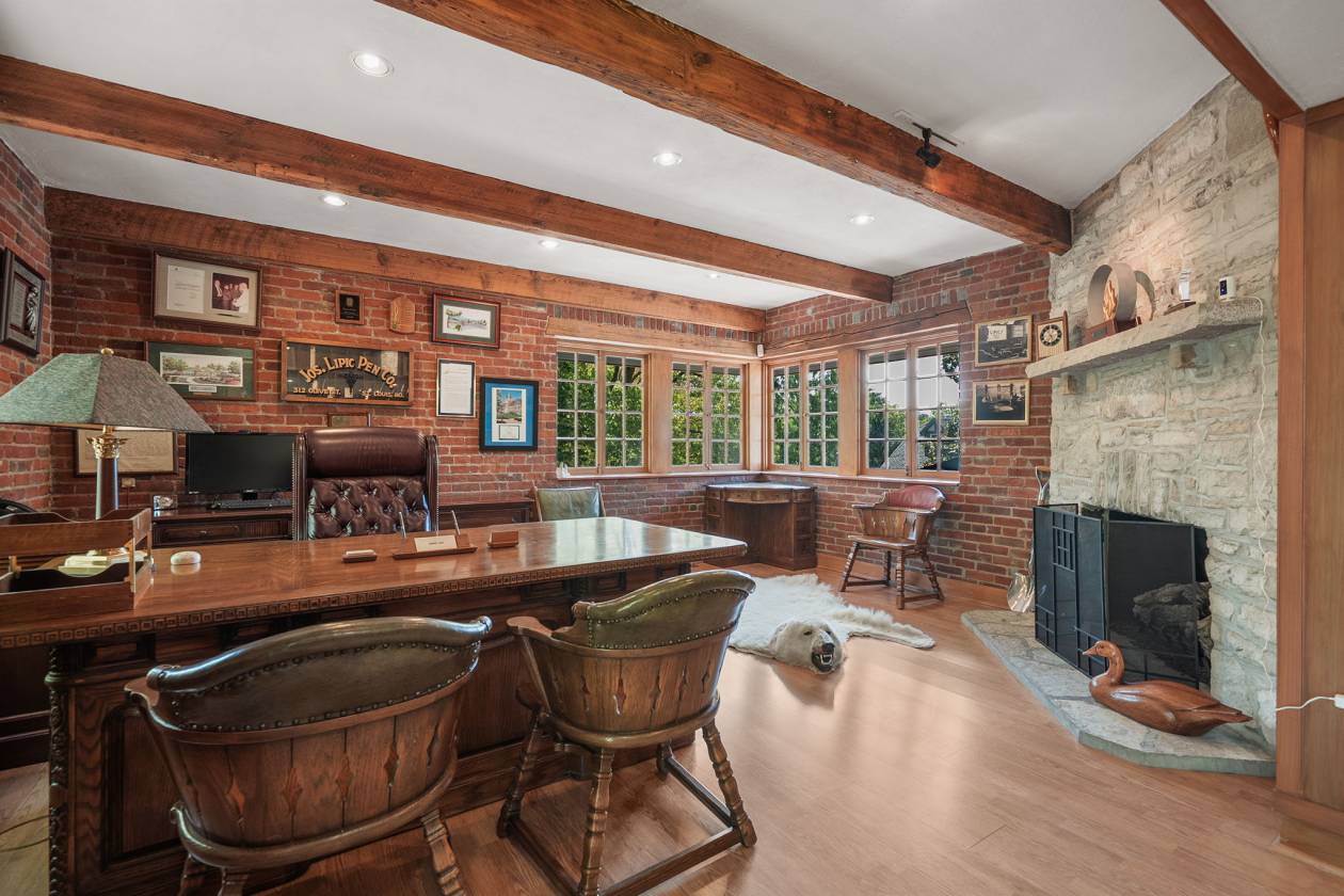 Beyond the main residence, the estate includes a separate guest house that functions beautifully as an office, suite, or meeting space. With two bathrooms, a fireplace, and a single-car garage, it also boasts an architectural addition designed in the style of William Bernoudy, apprentice to Frank Lloyd Wright.