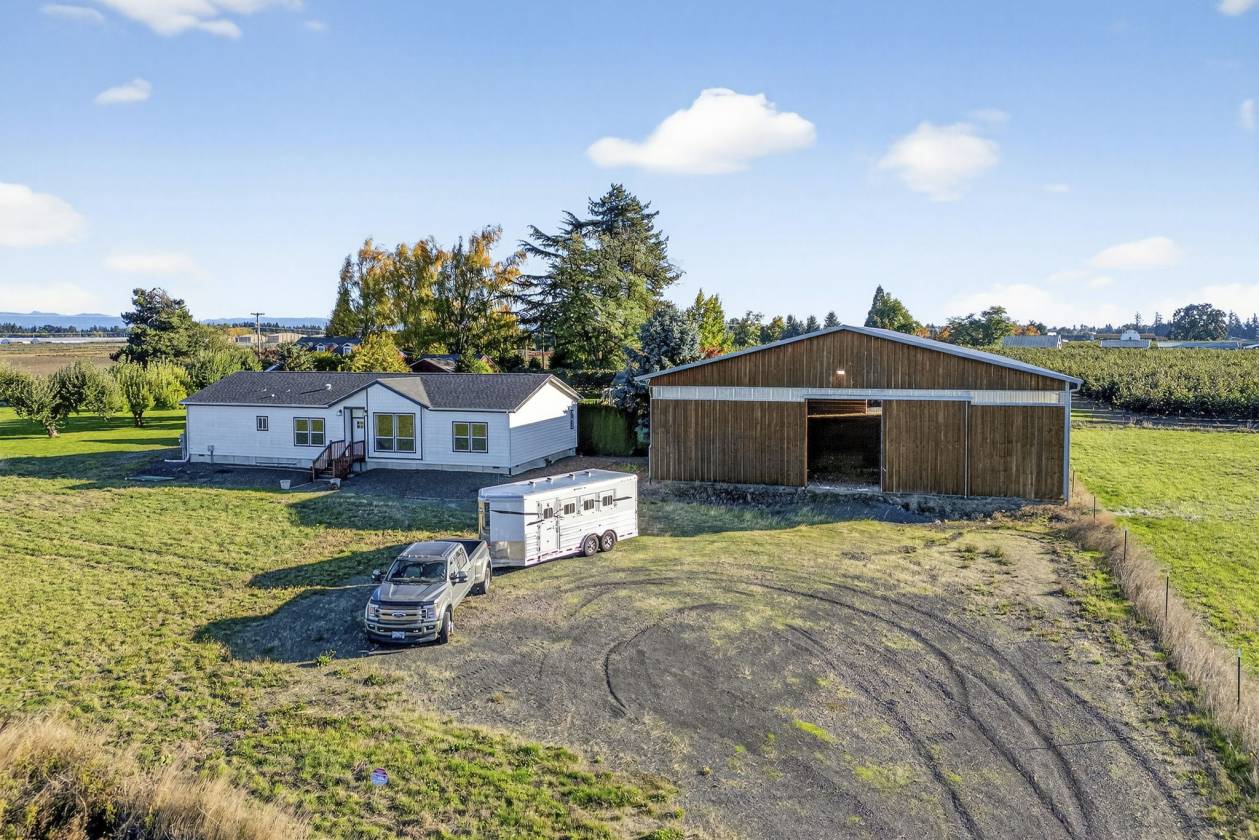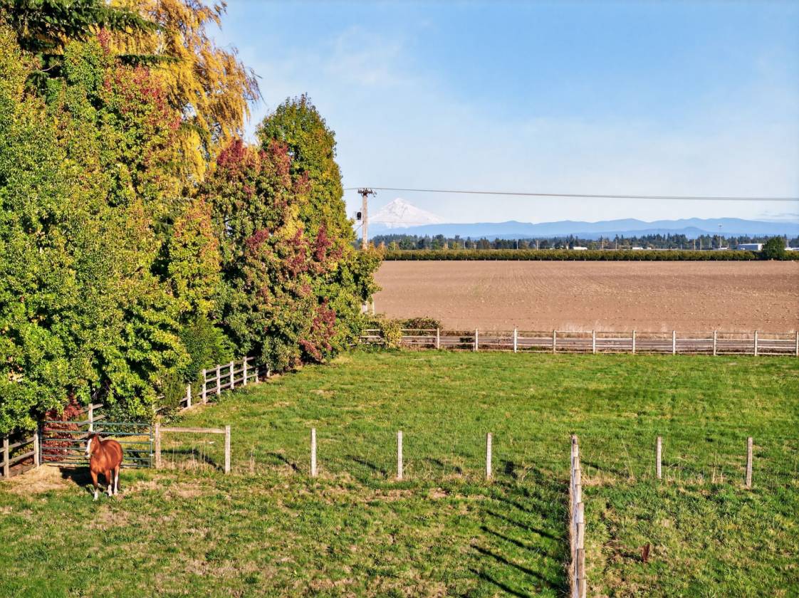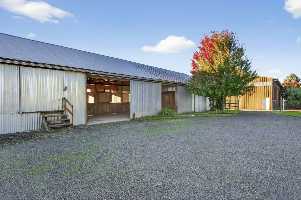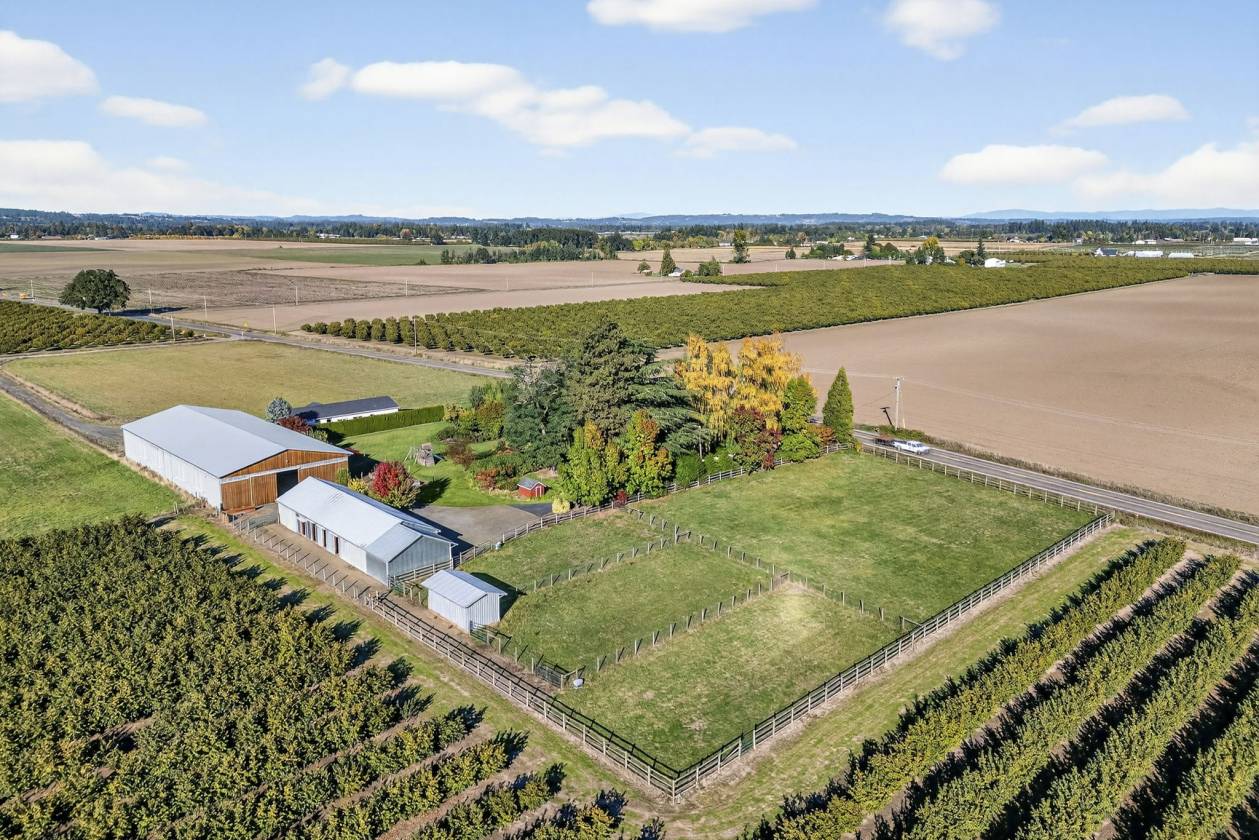 Discover a rare and exceptional offering in charming Aurora, Oregon —three contiguous and legally recorded parcels, all approved and ready for development.This remarkable property features two existing homes on 6.7 acres of flat,usable land with stunning Mount Hood views and impressive mature landscaping. The well-maintained 1930s 3bedroom, 2bath home spans 2,831sqft and exudes timeless charm with era-specific details such as coved ceilings,window seat benches,hardwood floors,brick accents,and plentiful canning storage.Updates include a primary suite on the main level with a walk-in closet,fresh paint,and beautifully maintained gardens creating a private, enchanting atmosphere—perfect for relaxing or inspiring your imagination.The second residence is a meticulously kept 2020 manufactured home,offering 4bedrooms and 2baths across 2,040sqft of modern, single-level living.It’s move-in ready and ideal for multi-generational living or rental income.The property is complemented by a charming country barn with four functional stalls and attached runs, a tack room, hay storage, and an enclosed chicken coop, providing excellent amenities for your farm and livestock needs.Multiple cross-fenced pastures, productive apple orchards,and grapevines further enhance the farm-to-table ambiance.Horse enthusiasts will appreciate the top-tier 70x140 indoor arena, suitable for all disciplines and available for year-round riding and training. The flat,level terrain makes management easy and offers convenience for daily activities.Situated just minutes from I-5,Newberg,Wilsonville, and local city amenities,this estate offers versatile living options,excellent development potential,and top-of-the-line riding facilities—all within a peaceful,scenic setting with breathtaking Mount Hood views.Whether you’re seeking tranquility, income opportunities,or outdoor recreation,this property is a truly rare find. Sale Includes:22235 Butteville Rd, both 22412 & 22462 Double Delight