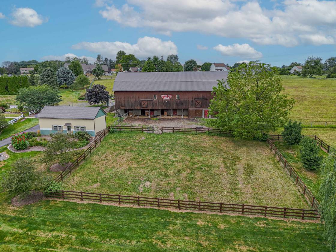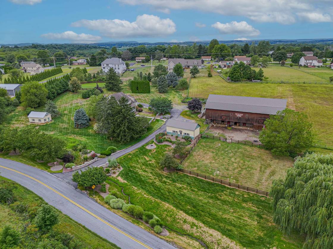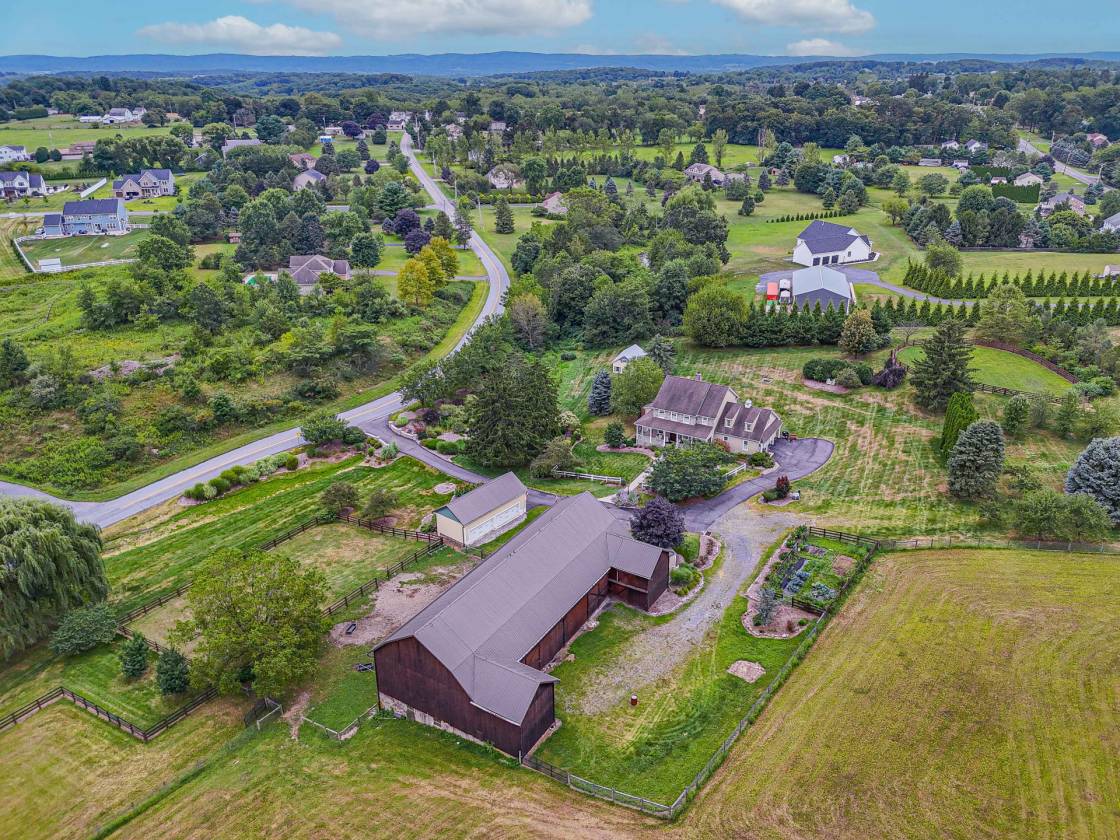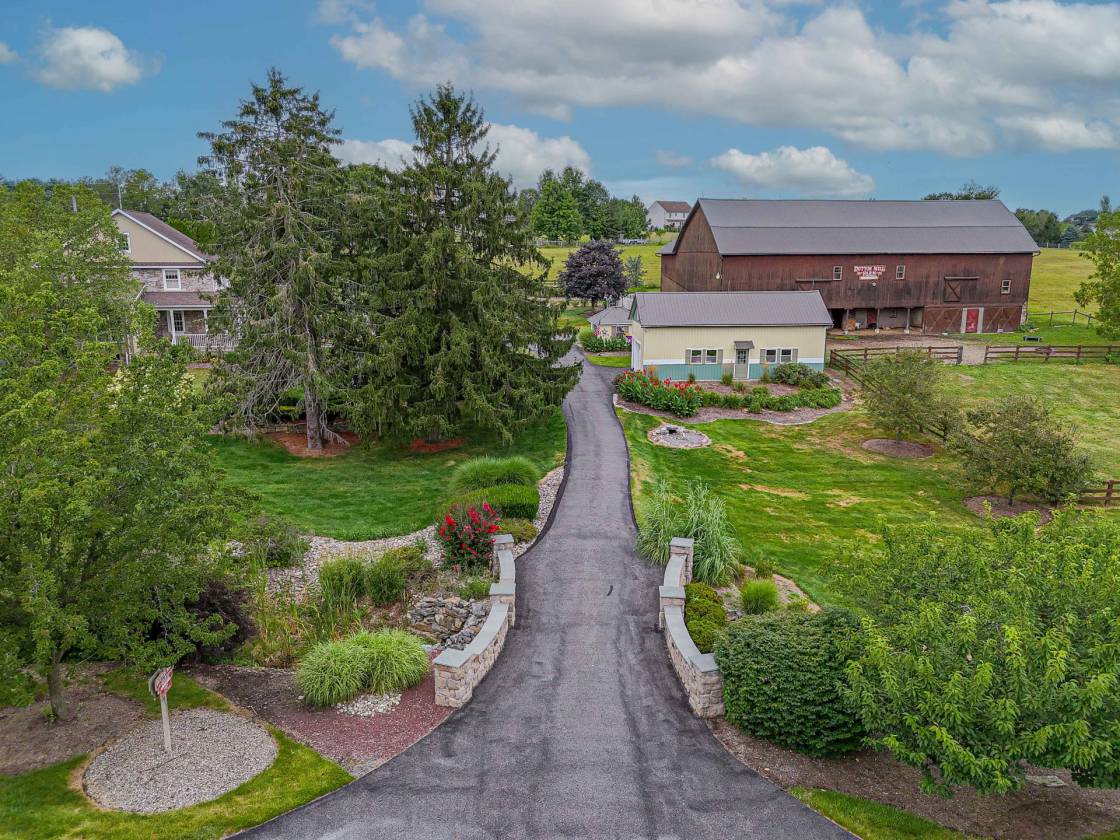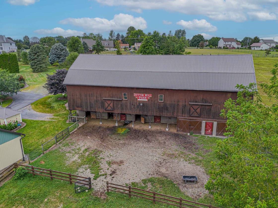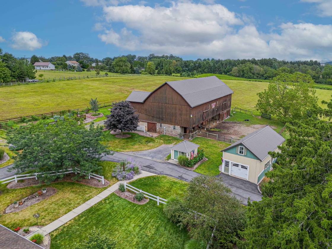 Welcome to Dutton Mill – A Modern Farmhouse Retreat in Fogelsville nestled on 10 manicured acres. The 3,200 sq ft. home features 4 bedrooms, two are primary suites, and 3.5 baths, built in 2010 and fully renovated with meticulous attention to detail. Step inside to discover a light-filled interior with soaring 16-foot ceilings where classic farmhouse character meets contemporary design. The open-concept main level is flooded with natural light & features a spacious living area w/ a gas fireplace set in stone with a reclaimed red oak beam mantel from the original barn, a sunroom and dining area. The chef’s kitchen is a true centerpiece boosting weathered granite island, s/s appliances, a Viking 6 burner gas stove, handcrafted backsplash, rustic brick flooring, & a spacious walk-in pantry, perfect for everyday meals & entertaining. Outdoors, the wraparound front porch invites you to start your day w/ sunrise views, while the private covered back patio off the first-floor primary suite offers a serene space to unwind w/ picturesque farm vistas. For equestrian enthusiasts or hobby farmers, the property is fully equipped w/ a 3-stall barn, fenced pastures, a riding ring, and dedicated pump house—making it a true working farm. Attached 2-car garage + 4-car detached garage. Surrounded by mature landscaping, a stream, manicured gardens & a fruit orchard. Dutton Mill presents an exceptional opportunity to embrace peaceful rural living without compromising on modern comforts.