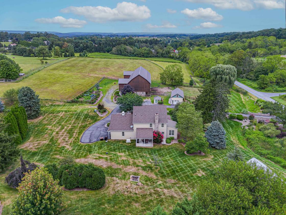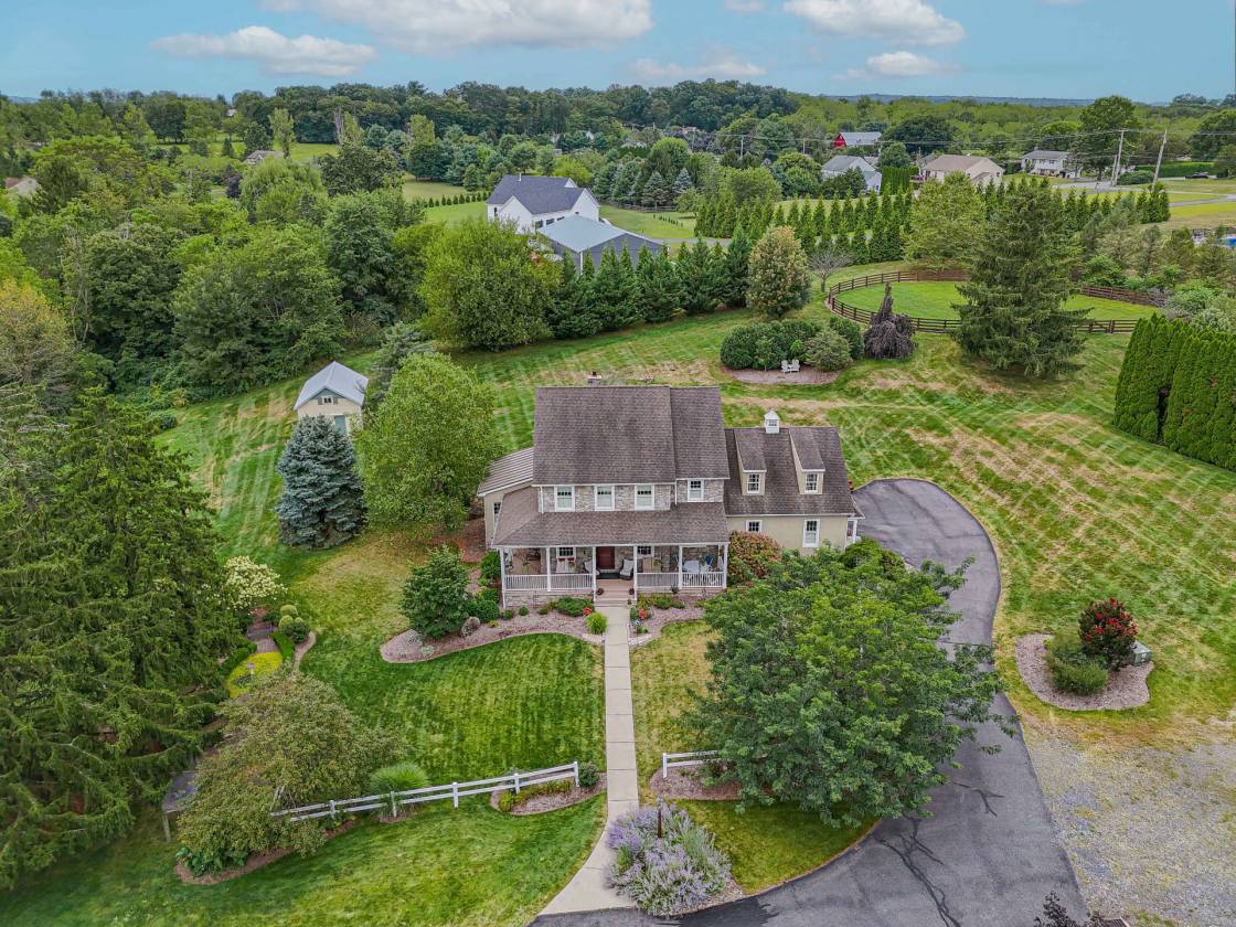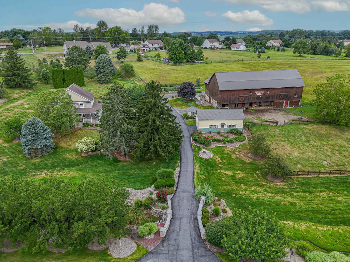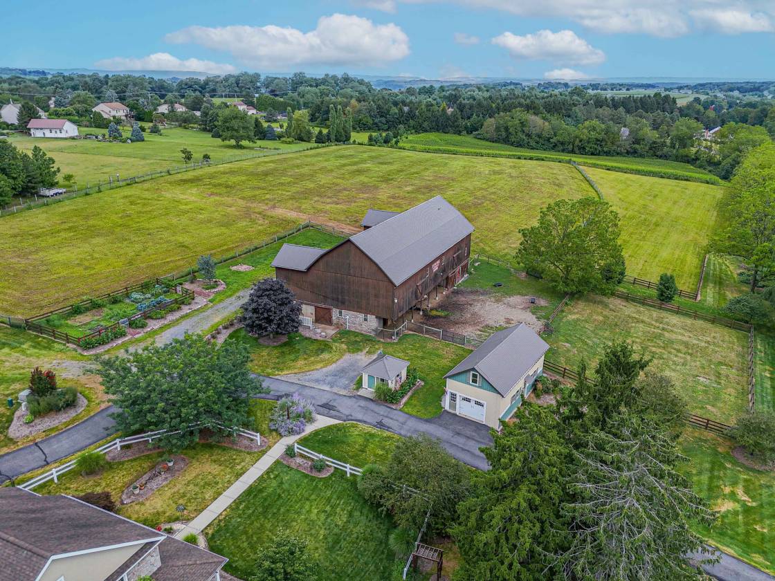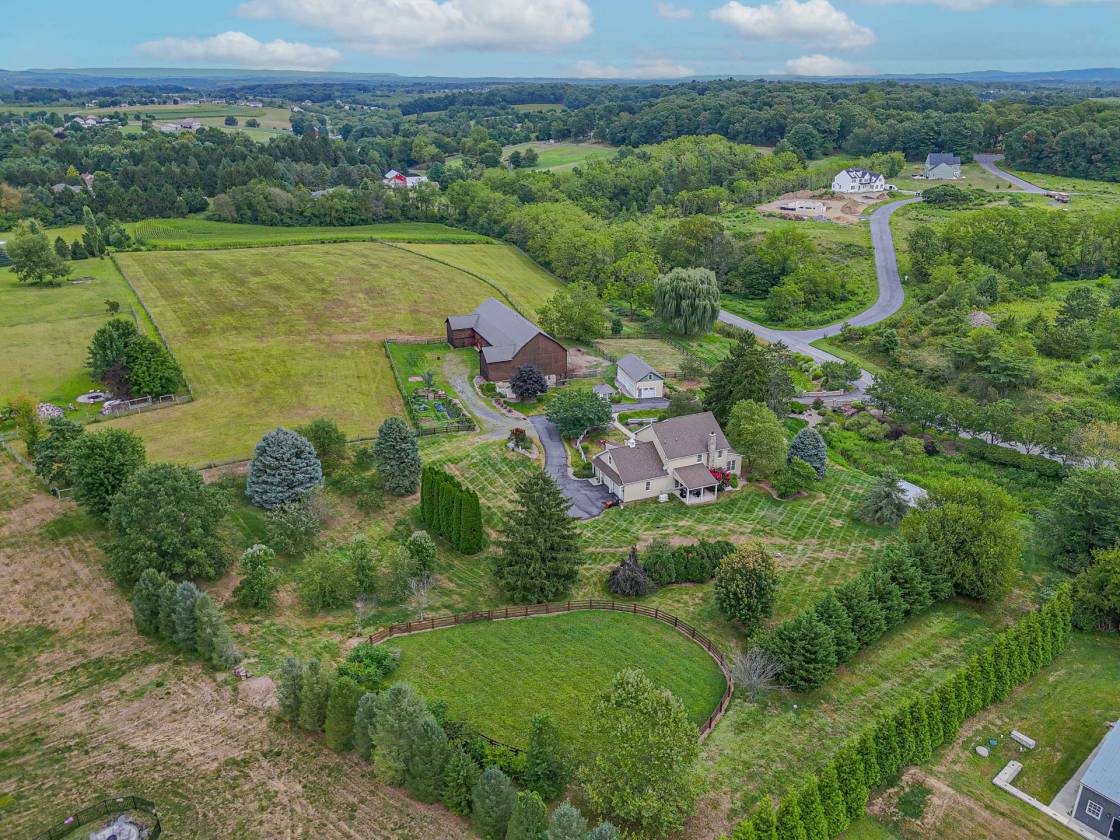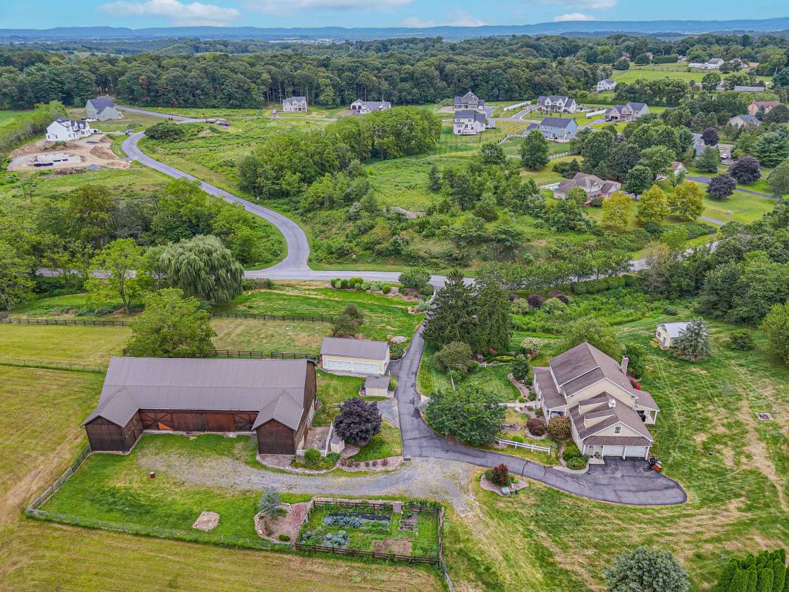 Welcome to Dutton Mill – A Modern Farmhouse Retreat in Fogelsville nestled on 10 manicured acres. The 3,200 sq ft. home features 4 bedrooms, two are primary suites, and 3.5 baths, built in 2010 and fully renovated with meticulous attention to detail. Step inside to discover a light-filled interior with soaring 16-foot ceilings where classic farmhouse character meets contemporary design. The open-concept main level is flooded with natural light & features a spacious living area w/ a gas fireplace set in stone with a reclaimed red oak beam mantel from the original barn, a sunroom and dining area. The chef’s kitchen is a true centerpiece boosting weathered granite island, s/s appliances, a Viking 6 burner gas stove, handcrafted backsplash, rustic brick flooring, & a spacious walk-in pantry, perfect for everyday meals & entertaining. Outdoors, the wraparound front porch invites you to start your day w/ sunrise views, while the private covered back patio off the first-floor primary suite offers a serene space to unwind w/ picturesque farm vistas. For equestrian enthusiasts or hobby farmers, the property is fully equipped w/ a 3-stall barn, fenced pastures, a riding ring, and dedicated pump house—making it a true working farm. Attached 2-car garage + 4-car detached garage. Surrounded by mature landscaping, a stream, manicured gardens & a fruit orchard. Dutton Mill presents an exceptional opportunity to embrace peaceful rural living without compromising on modern comforts.