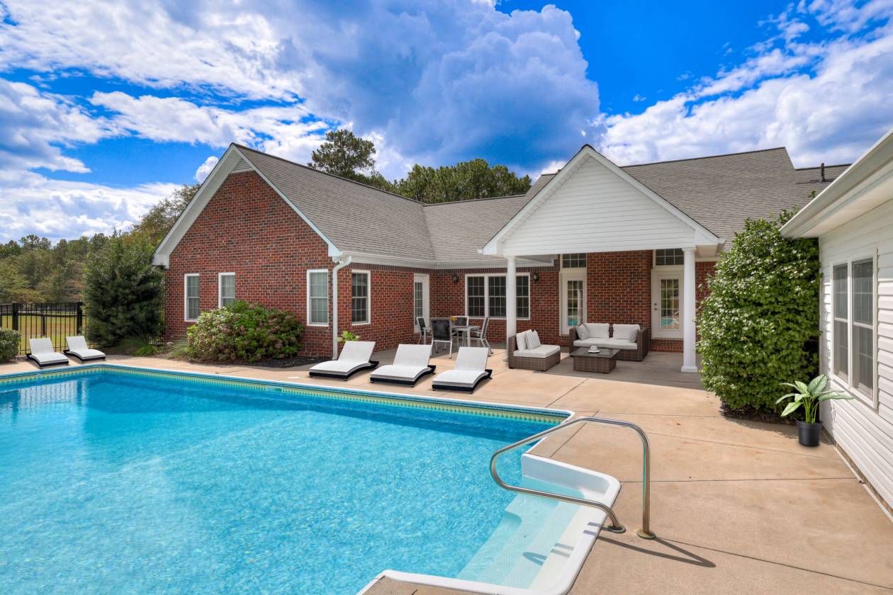 Boasting 4 bedrooms and 4 baths, the large main-level primary suite overlooks the pool area and hot tub. There is a gracious formal dining room and expansive kitchen as well as great room with soaring ceilings and fireplace.