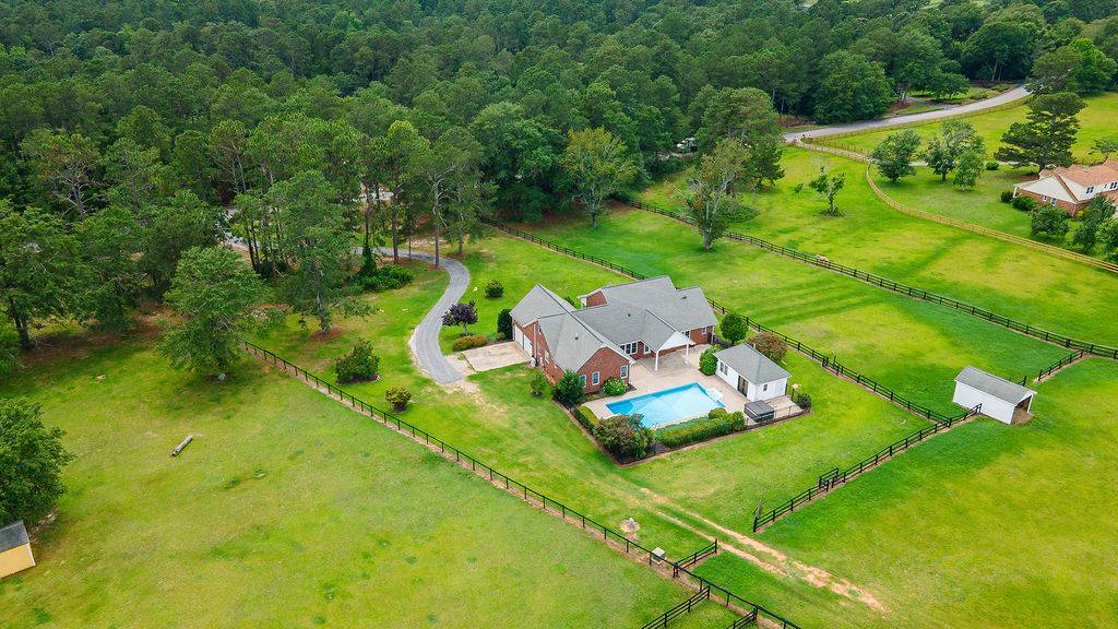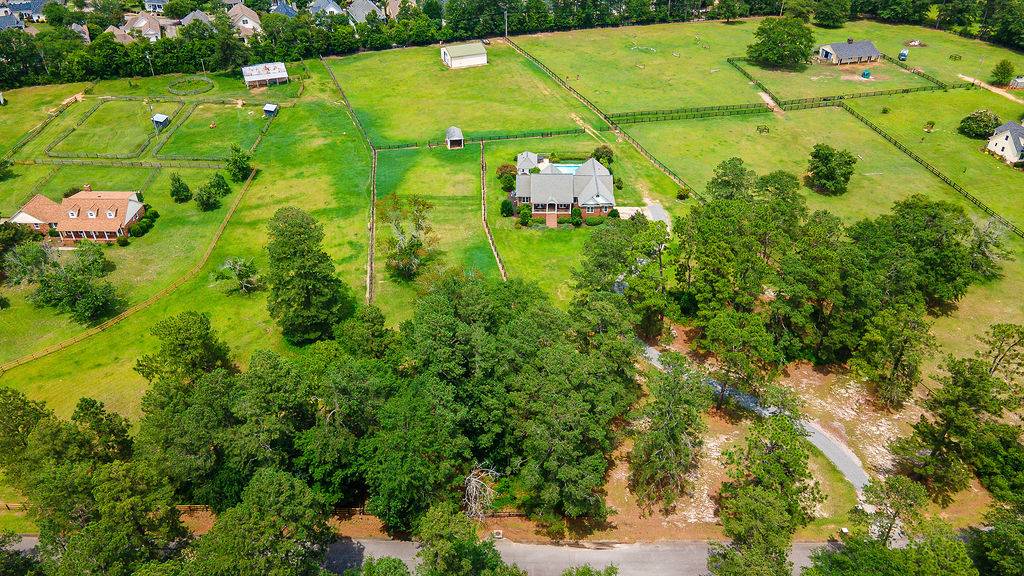 Welcome to 155 Hunting Hills Drive, an inviting sporting property on 4 acres in Aiken SC’s popular Hunting Hills neighborhood where residents can ride their horses, walk their dogs and take healthy hikes. This lovely estate property is located on a private cul-de-sac that offers residents the peace and quiet of country living within minutes of the esteemed ‘Village at Woodside’: an exceptional community where you can live, work, eat and play within steps of your front door. There are several tasty eateries tucked into this little oasis — The Village Cafe (farm to table); an Asian-Fusion cafe and an authentic Italian bistro. The salon and spa welcomes clients to enjoy its therapeutic and feel good services; there are bocce courts, local retail and a fitness center as well.