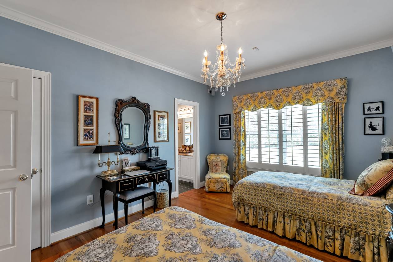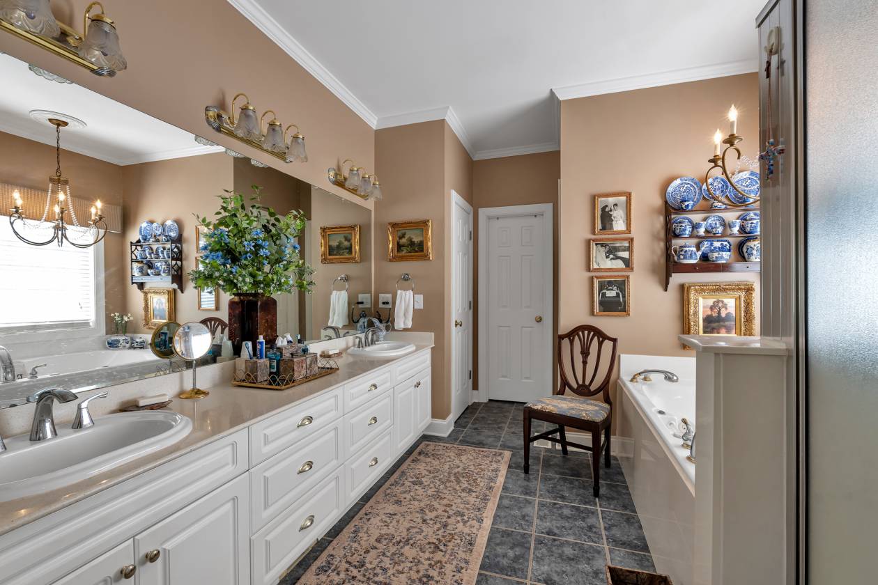 Inside, elegant details—coffered ceilings, rich hardwood floors, and a flowing open layout—create a warm, welcoming feel. The formal dining room sets the stage for gatherings, while the expansive family room brings in natural light and fine architectural character. A well-appointed kitchen with breakfast area provides everyday function and style. The owner’s suite is a true retreat with private fireplace, jetted garden tub, separate shower, and dual vanity.