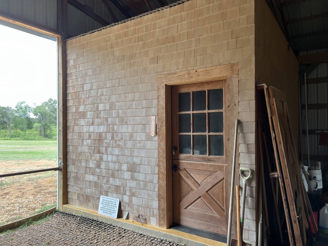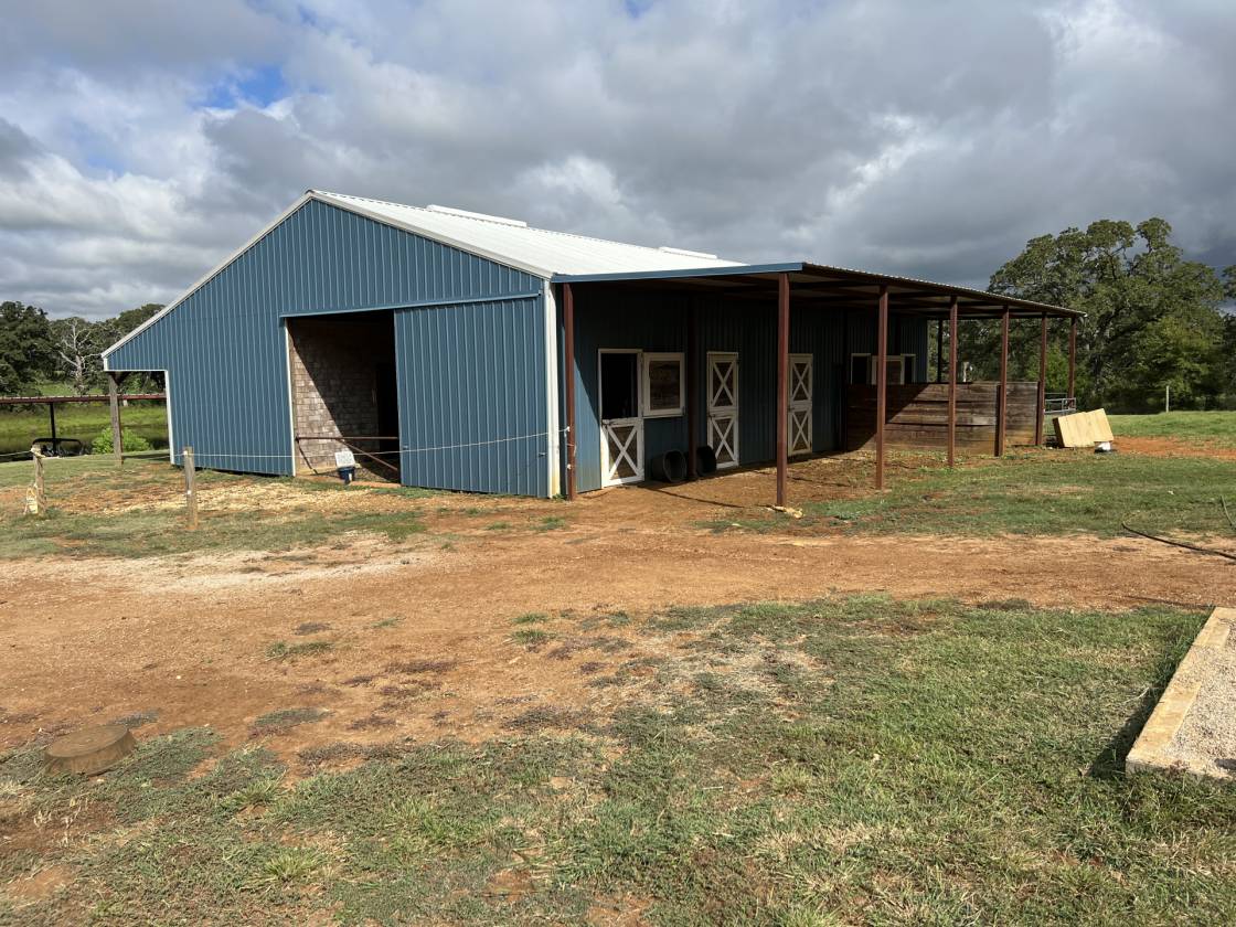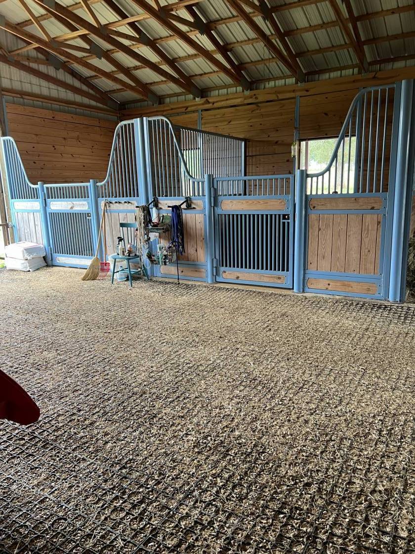 Barn is 60x 40 with steel 12-16' extensions both long sides. 2 large stalls currently exist but doors/space exist for 3 more . Large finished tack room concrete floor with lots of additional open space that could be built out into a foreman's apt or buyers choice. Floor is matted gravel, stalls have additional solid mats.