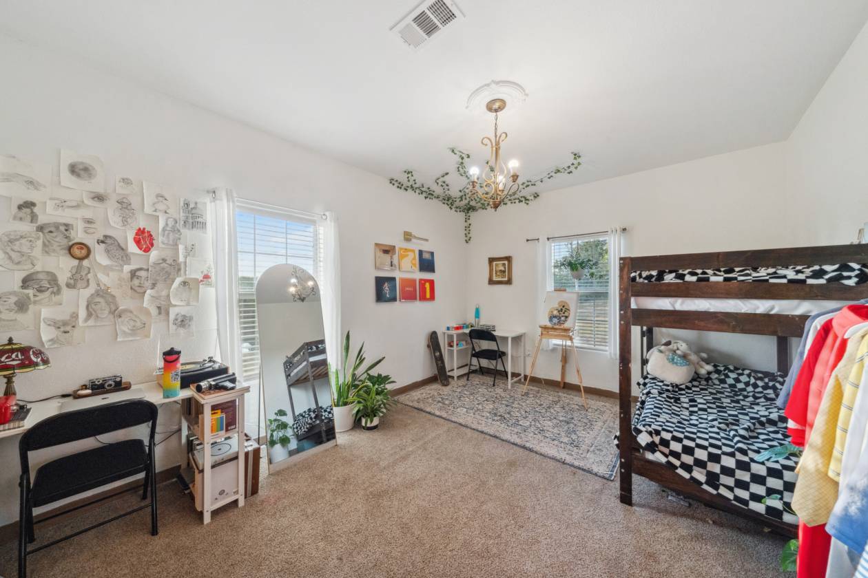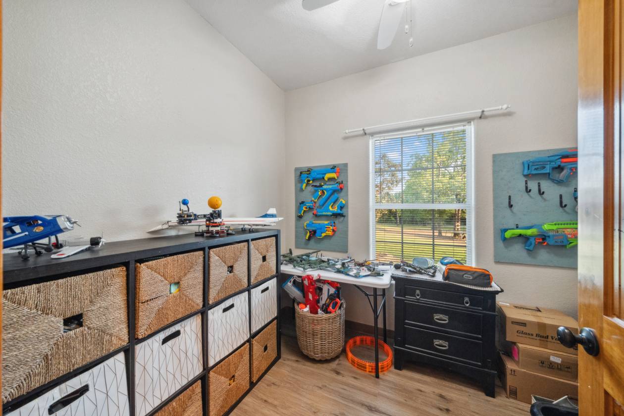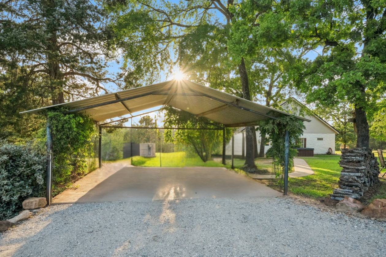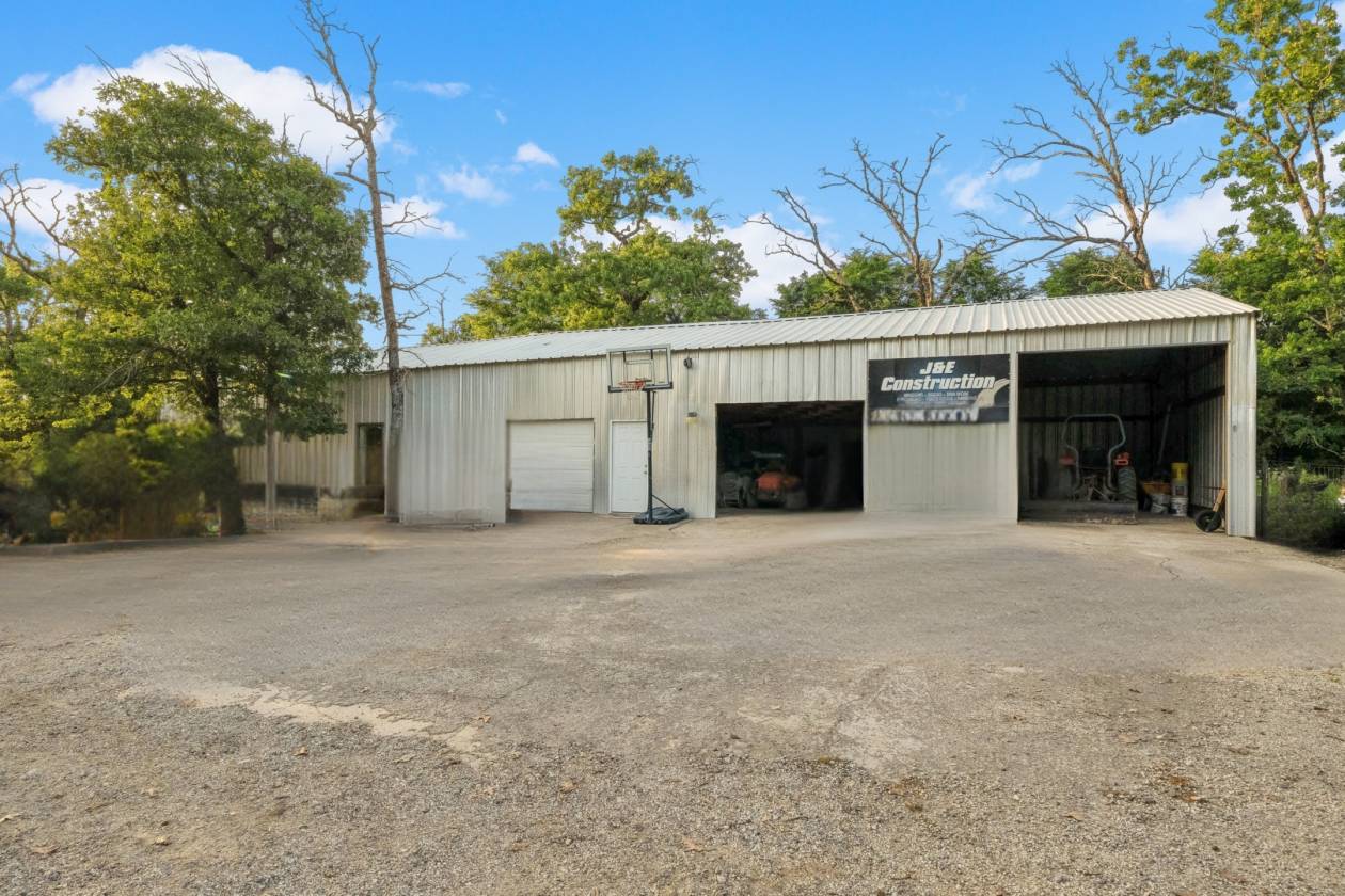 Welcome to this breathtaking custom-built Austin stone home nestled on 14.66 wooded acres, where a striking stone entry with charming wagon wheel décor sets the tone for rustic elegance. Beautifully landscaped front porch beneath durable metal roof welcomes you into the spacious 4-bed, 3-bath home featuring open-concept living, built-ins, and dining area that flows effortlessly into well-appointed kitchen w/breakfast bar & ample counter space. Master suite offers ensuite bath and walk-in shower, complemented by two additional bedrooms downstairs, while upstairs hosts fourth bedroom, full bath & walk-in attic with spray foam insulation. Property includes large metal shop with attached 2-bed, 1-bath guest house, peaceful pond with covered pier, full fencing, 2-car carport and spa ideal for entertaining. With partially completed tiny house/hunting cabin ready for your personal touch and both city utilities and private well, this home perfectly blends country charm with modern convenience.