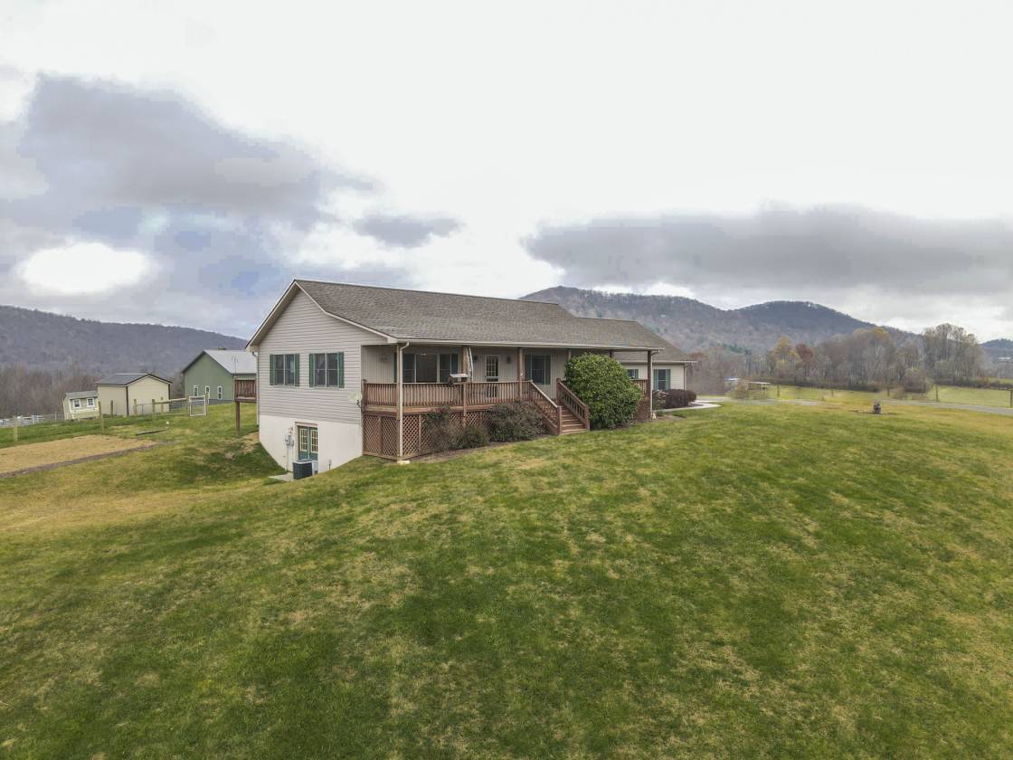 Enjoy the mountain sunsets from the large covered front porch from the top of a knoll with long range views. The home has an open concept with the living room, dining and kitchen areas combined. Three bedrooms, two full baths. Master bedroom has en suite full bath and laundry. Hardwood and ceramic tile flooring throughout. Full unfinished walk-out basement and attached 2 car garage. The are approximatley 8.5 aceres of open pasture that is fenced and crossfenced for your horses and livestock. The new 40'x80' boasts a large workshop with concrete floor on one side and space for housing animals on the other side. Large overhead doors allow for RV storage as well. Located just 2 miles from the Blue Ridge Parkway and convenient to the Chateau Morrisette Winery & the Buffalo Mountain Preserve.