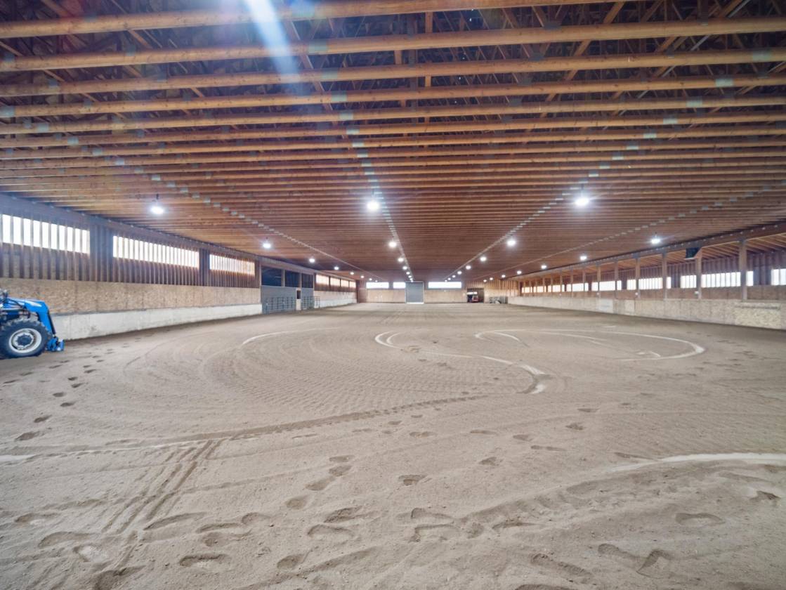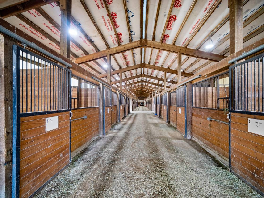 At the heart of the property is a massive 29,000± square-foot indoor arena equipped with brand-new LED lighting, making it an ideal venue for events and training year-round. Complementing the arena is a 10,000± square foot feeder barn with 30 indoor stalls and over 16 outdoor paddocks, each with power, water, and shelter. A 160’ x 270’ outdoor arena expands your event and riding possibilities, and a 10,000± square-foot hay barn (new construction) ensures ample storage.