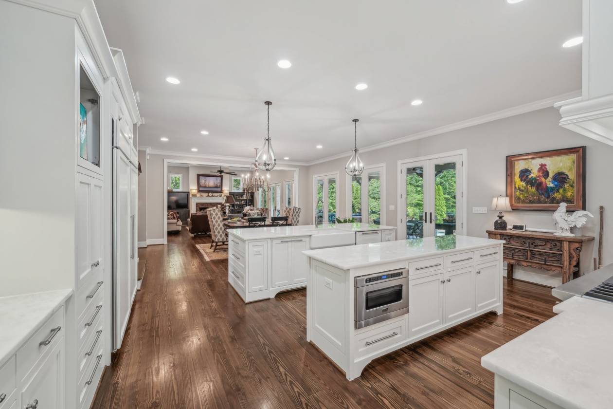 - Double oversized islands with Italian marble countertops and built-in microwave—ideal for prepping, hosting, and casual dining.