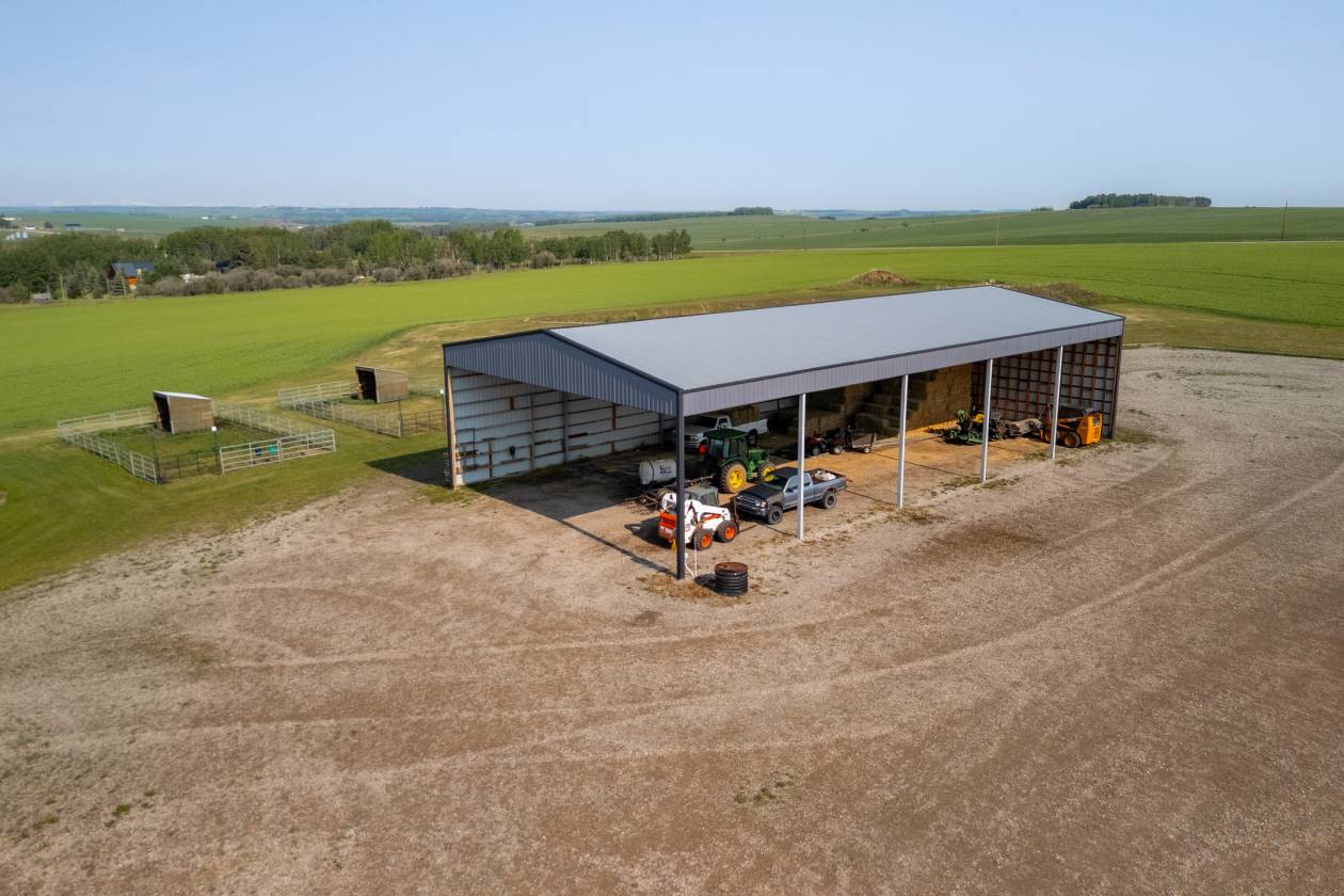 - Large hay shed, workshop, and multiple outbuildings