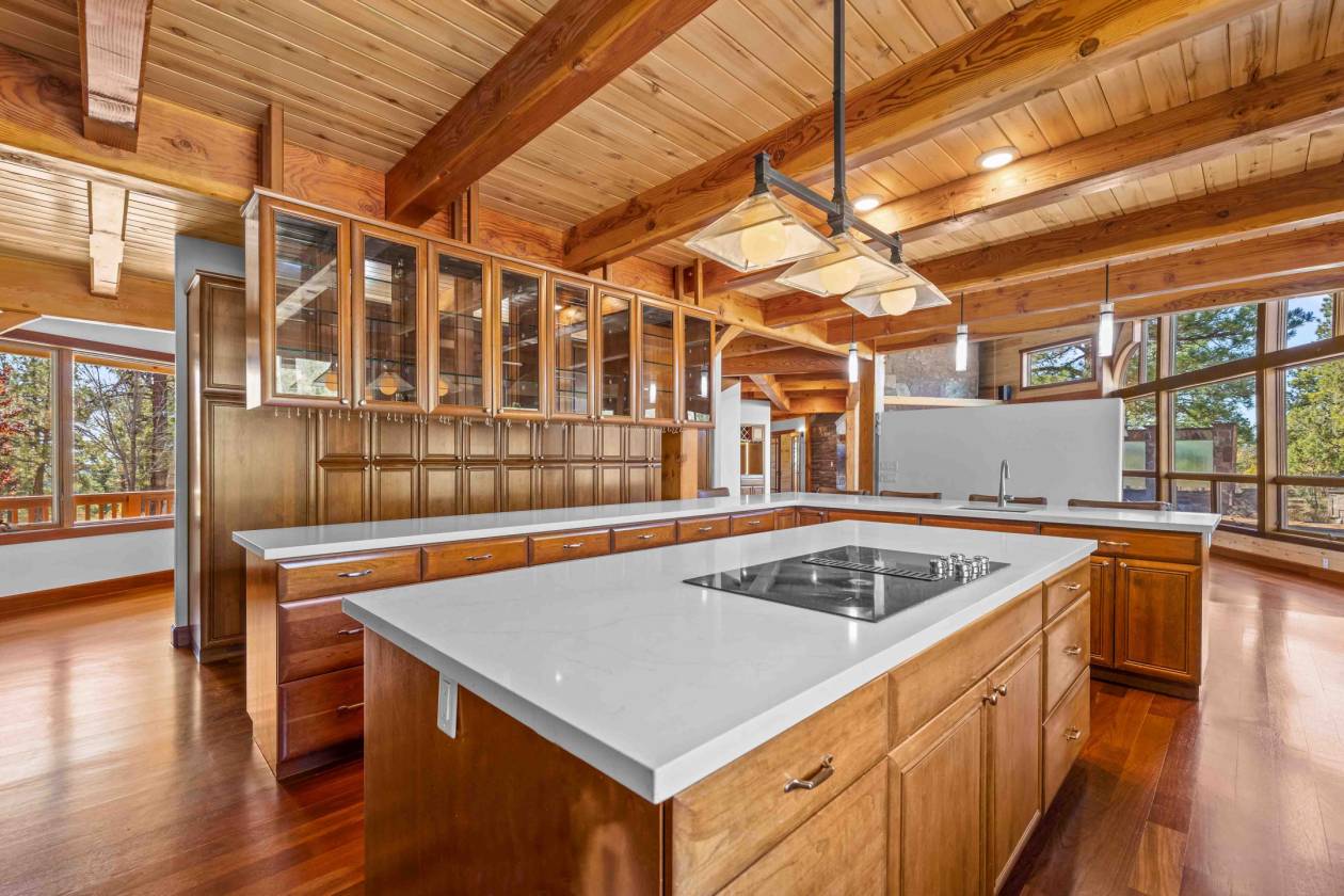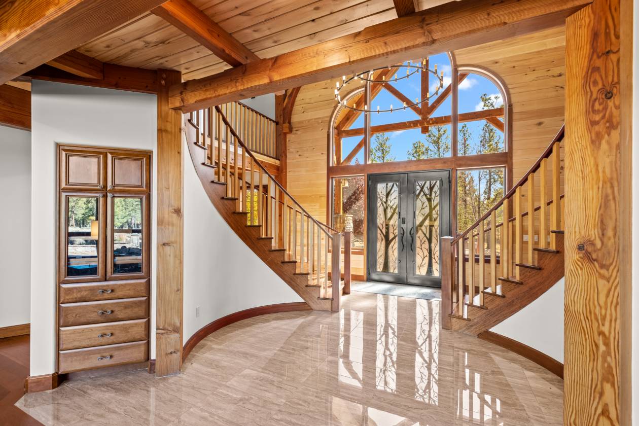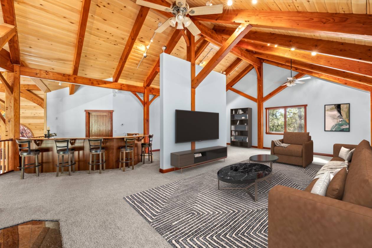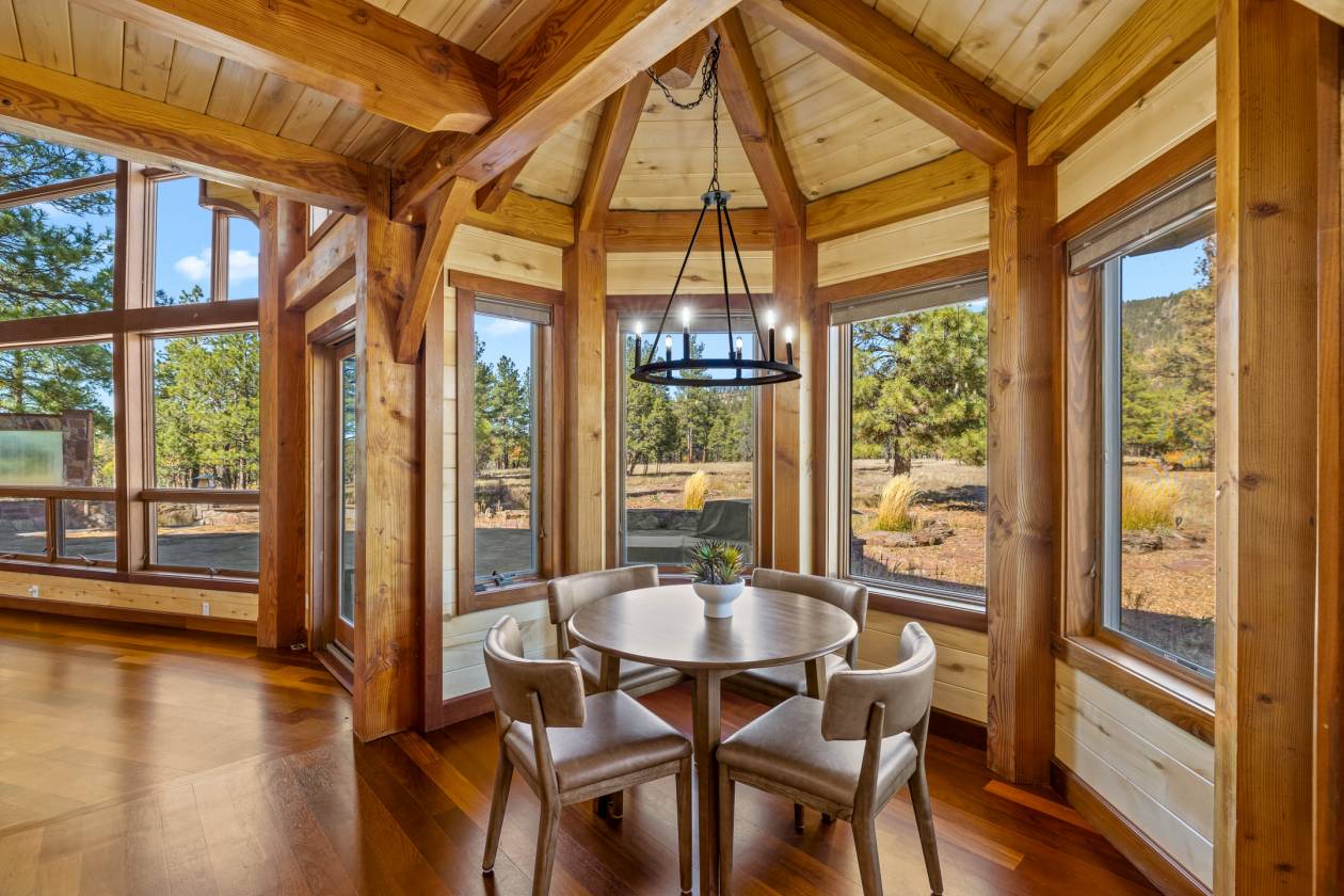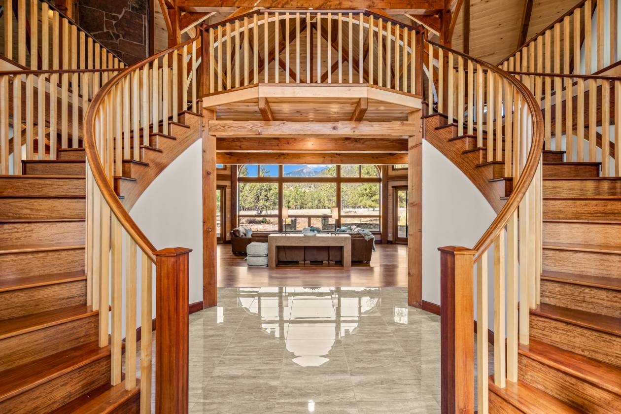 Welcome to 150 Flat Rock Ridge, a stunning custom Timber Frame home on 6 beautiful acres with majestic mountain views in Lockett Ranches. This is a one-of-a-kind setting for your dream equestrian estate. Created by an engineer as a loving gift to his wife and family, this 6,000 sf masterpiece is both home & work of art. The entryway is breathtaking with extraordinary views framed by double curved staircases and beams above. The greatroom is the essence of indoor/outdoor design; a 35-foot vaulted ceiling & picture windows allow you to experience natural beauty - the first greens of spring, the lush vibrance of summer, glorious autumn palettes and white, snow capped mountains from every vantage point in your home. The spacious kitchen with breakfast area is upgraded with quartz counters & new appliances. It will be the favorite setting for your friendsand family to gather, enjoying both your culinary delights and the unique, luxurious rustic beauty of the home. Timber Frame construction is the pinnacle of custom construction, where hand-cut interlocking timbers are joined with pegs and intricate joints. Timber Frame is energy efficient and allows for design creativity. Re-imagine interior spaces, easily add or remove walls, let your artistry shine and curate your personalized, custom retreat. Do you imagine entertaining in a private, luxury mountain lodge? Relax, play pool or cards, have fun at the bar, and cheer for your teams in your large and open upper-level entertainment area with dramatic beams, a fireplace and full bar. Are you inspired to customize? Effortlessly re-design the space by adding interior walls - Timber Frame construction makes it easy. The outdoor living areas must be experienced in person to be appreciated. Sit quietly or host a party of 50 on your back patio in the presence of fields, birds, ponderosa pines and Mount Humphreys. Are you an equestrian lover? With 6 stunning acres you can create the equestrian paradise of your dreams. More than six types of wood were carefully chosen for each feature. The timber frame itself is old growth Douglas fir; the ceilings are Aspen (a nod to our location); floors and trim are all Jatoba, aka. Brazilian Cherry, one of the hardest choices for wood flooring; interior doors are Alder. The custom cabinets are Cherry and the balusters are Maple. A shared deep aquifer well, radiant heat, a 4 car tandem garage & additional RV garage with cleanout and hookups, EV charging and large fenced dog run make this home not only beautiful but highly practical. IMPORTANT NOTE: there is a 1700 sf +/- finished bonus room above the garage that is NOT included in the square footage of the listing! Create your shop, gym, art studio or extra living space - there is plenty of space for creative design! This spectacular home inspires endless possibilities in one of Northern Arizona's most picturesque settings.