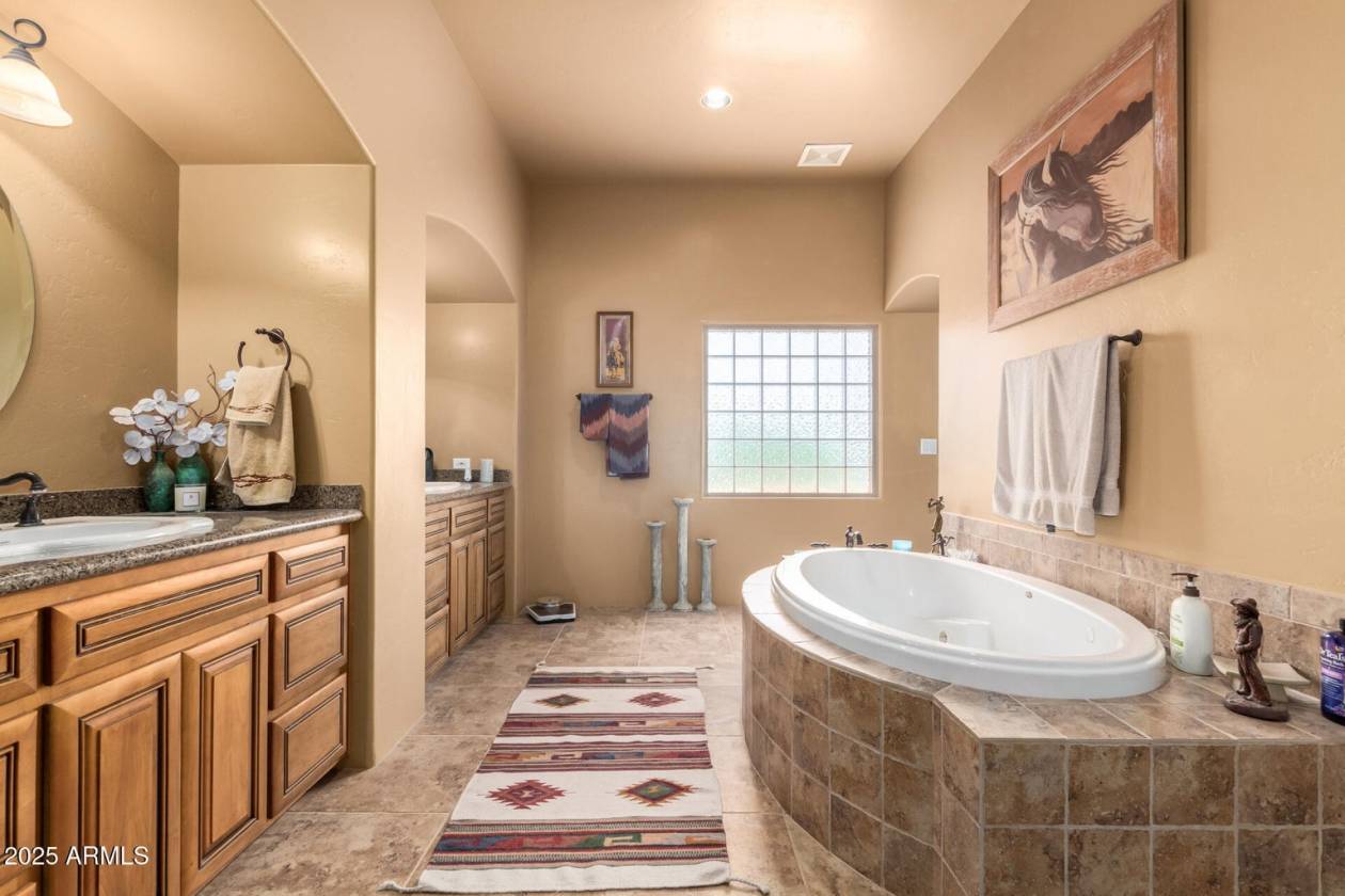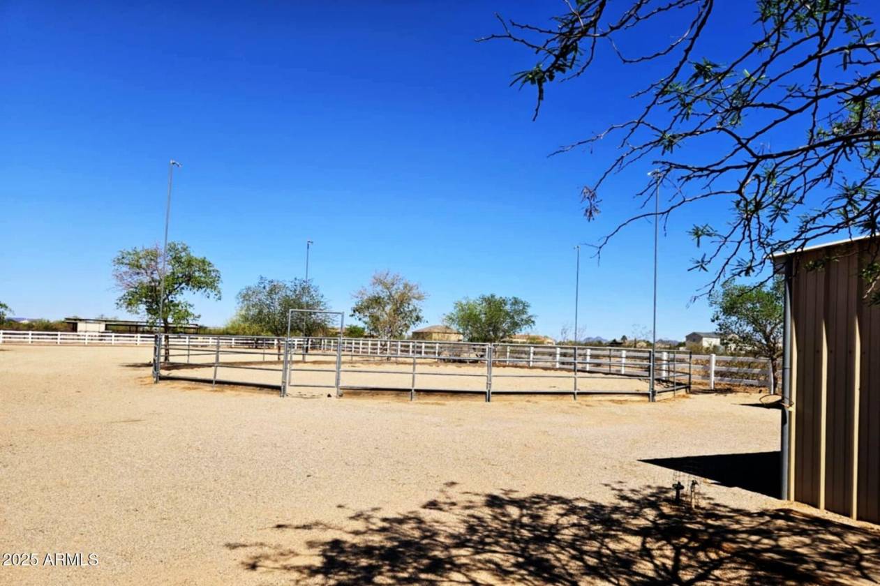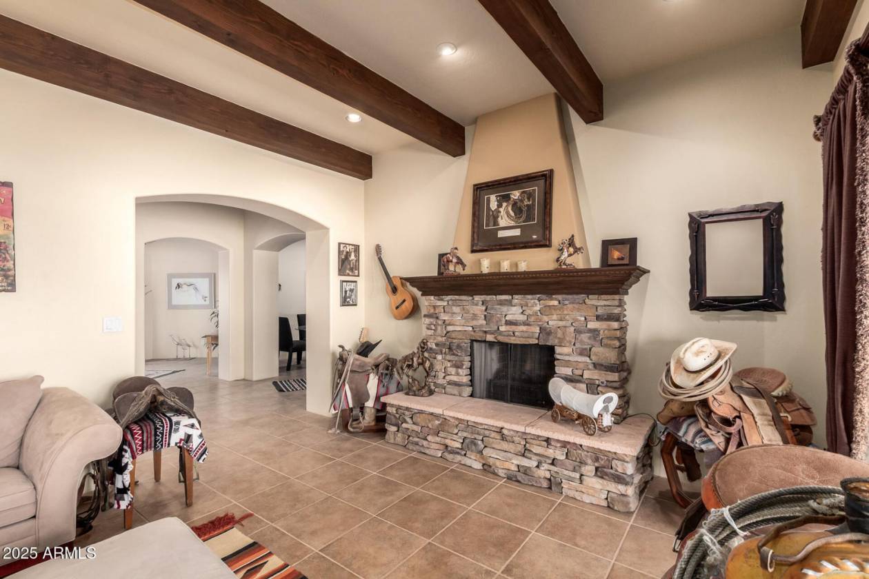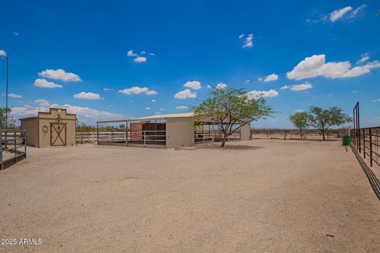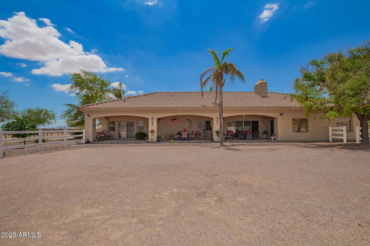 A rare find! Remarkable 4-bed, 2.5-bath masterpiece, situated on 7.5 ac of PRIME land, is an equestrian enthusiast's dream come true! Captivating interior boasts a bright living room w/a stone fireplace & a family room ideal for gatherings. Timeless details like an inviting foyer, tile flooring, exposed ceiling beams, graceful archways, & plantation shutters elevate the elegance throughout. Gourmet eat-in kitchen is a cook's delight, fully equipped w/recessed lighting, ample cabinetry topped w/crown molding, granite counters, a center island w/a breakfast bar, & high-end SS appliances such as a wall oven, cooktop electric, & range hood. Retreat to the grand owner's suite featuring plush carpet, outdoor access, a walk-in closet, & a spa-like ensuite w/dual vanities & a jetted tub. Movin outside, relax under the covered patio & take in the beauty of your expansive backyard. where you can observe your 4 stall barn with oversized covered 16x24 stalls. The barn is equipped with automatic waterers and a wonderful paver ally way. There is a wash rack right outside, and a dog kennel for your pups. The all pipe riding arena (150x220) has great footing, and there's a handy lighted 60 foot round pen. Put your tack in the country western themed tack room or use the spacious storage conex box for all your equipment. Tons of room for pulling in horse trailers and RV's in the large drive. Fully pipe fenced 2.5 acre pasture is zoned to allow agricultural buildings. Many team ropers and horse owners in the area. Horses will love to roam, and so can you, with wide open spaces great for riding in the surrounding the area. Don't let this incredible opportunity slip away!