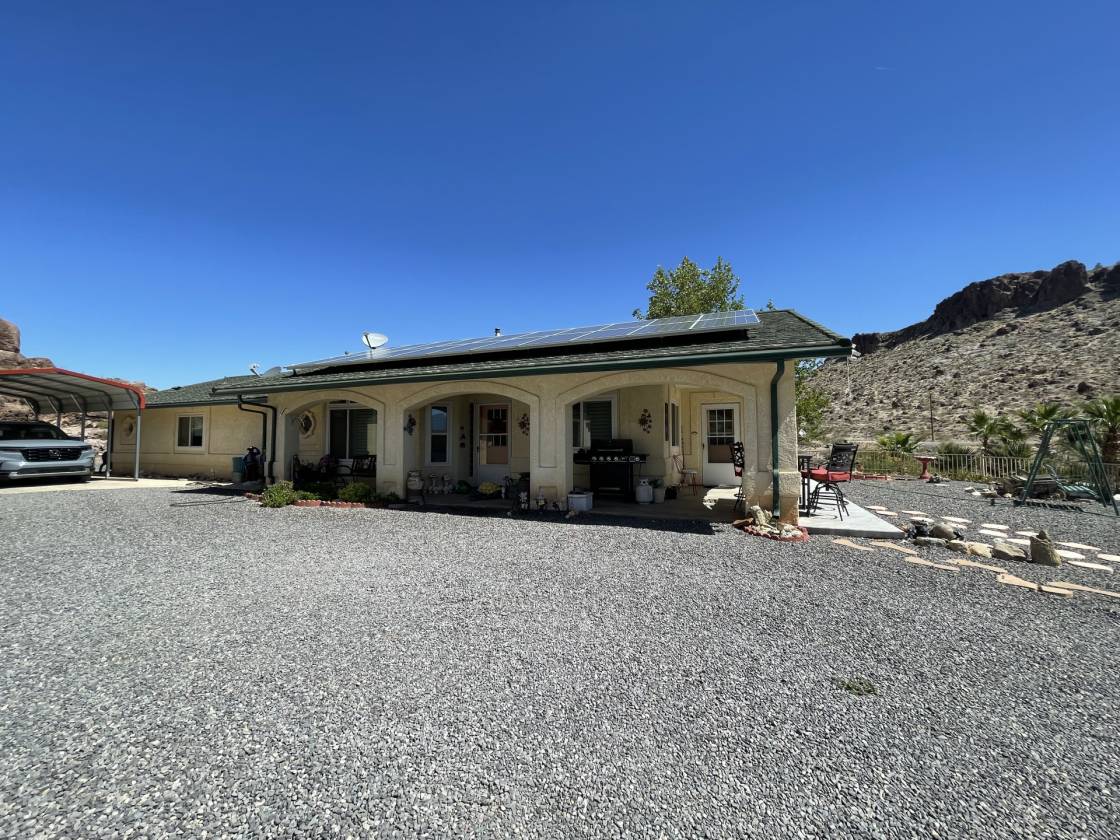 AMAZING POOL HOME that has it all! Over 1 acre with a well, this 3 bedroom + Bonus room home sits amongst the bluff of the mountains. With these breathtaking views, you can enjoy the morning sunrises from your covered Trex deck and have the privacy you need...yet only 10 minutes to town. Solar Home offers a bonus bedroom/office, separate dining room, indoor laundry, vaulted ceilings, skylights, pellet stove, newer windows with plantation blinds and more! Inground Gunite POOL is heated and has a spa/jacuzzi area, a slide and includes waterfalls and lighting. Waterfall stream also runs down the rocks to a 5 ft pond area with palm trees. 30 X 18 Detached Garage has 2 parking areas, plus a Casita/Guest Quarters that has already been started for you. The horse barn has shade covering and tack shed/storage. Owned solar with 14 roof panels keep utility bills lower. Property is completely fenced for privacy and has a solar powered electric gate. Additional sheds boast plenty of room for tools and storage with electric/power. Property has 2 water wells, only one being used. Kingman is 1 1/2 hour from Las Vegas for all your shopping and entertainment. This property is ready to be toured!