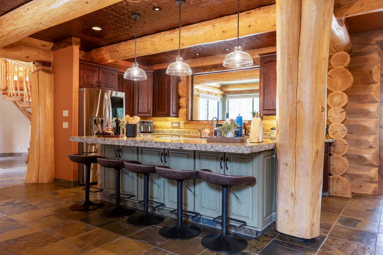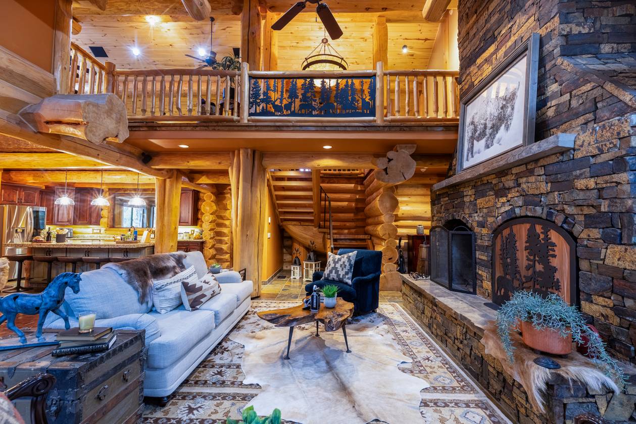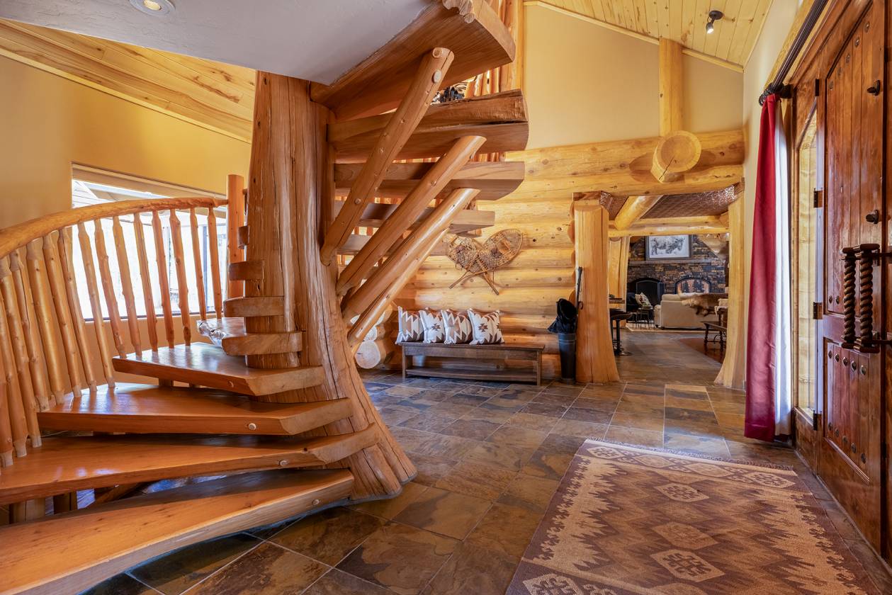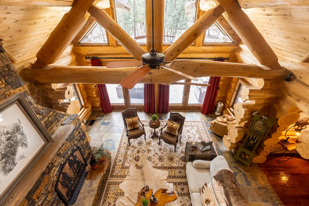 - The main house sits on a 2.79-acre lot that is Gated into a private estate. Upon entering the home, you'll be greeted by a spectacular custom log, spiral staircase leading to an ensuite bedroom that is equipped with a king bed, built-in twin beds, a gas-woodstove, a beautiful bathroom, a dining area, kitchenette, and a private exit/entrance to the front of the home. If you turn to the right upon entrance, you will find an open-concept great room that boasts exquisite details, including dramatic log pillars, a custom one-of-a-kind fireplace, a sculpted copper ceiling, and large windows that flood the space with natural light. The chef's dream kitchen comes with high-end appliances, including an induction cooktop, an ice maker and warming tray! From the grand great room, you can either into the Primary Suite or up a 2nd set of stairs. The downstairs primary bedroom features a massive room with a private exit outside to a 2nd hot tub, a gas-woodstove, and huge closet(s) and bathroom - the laundry room is attached to the primary bedroom and allows a secondary entrance into the AZ Room. If you decide to venture up the 2nd set of stairs, off to the left you will find a 3rd oversized bedroom with tons of space, a private balcony, ensuite bathroom, and gas-woodstove. To the right you will find the Billiard room which could be used as a living room, game room, kids space, or more! It also features a separate space for an office, a half bathroom, a gas-woodstove, ice maker + fridge - don't forget TONS of storage.