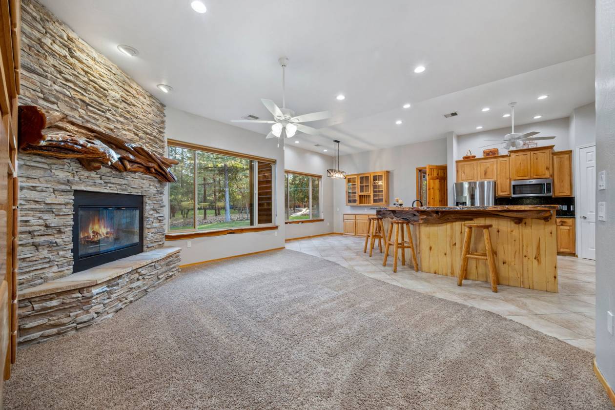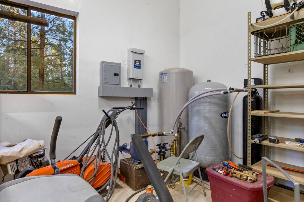 Step outside to discover 12,000 SqFt of manicured lawn, a greenhouse, raised garden beds, and corral panels with water troughs, ideal for horse lovers. The property includes a detached RV garage, additional garage bays, a horse tack/feed area, and a heated 2-car garage with three storage rooms. A private well tapping into the Coconino Aquifer provides an abundant supply of pure mountain water, supported by a 10,000-gallon storage tank and automatic sprinklers. The home and shop are also connected to public water for added security. A backup generator, fueled by one of two owned 500-gallon underground propane tanks, ensures uninterrupted power during winter storms. The kitchen stove, fireplace, and water heater are also propane-powered for efficient year-round use. Additional amenities include a seven-person jacuzzi, adjustable basketball hoop, and a suite of equipment for property maintenance and recreation such as a New Holland skid steer, dump trailer, Husqvarna riding mower, side-by-side ATV, and commercial air compressor. The workshop is outfitted with a full array of tools including a table saw, drill press, band saws, metal chop saw, and more. Recent upgrades include brand-new roofs, lighting, and interior/exterior paint and stain, plus eight new windows.