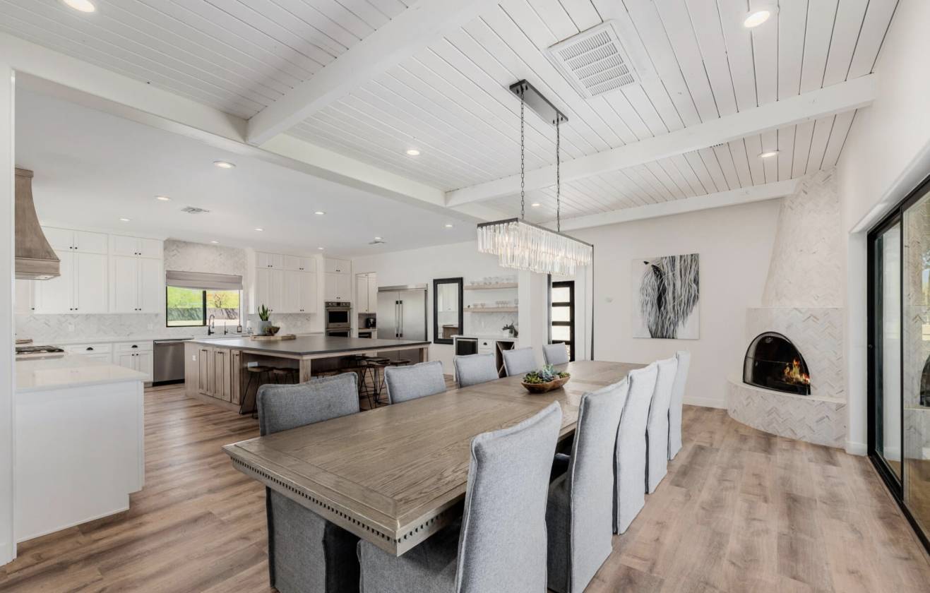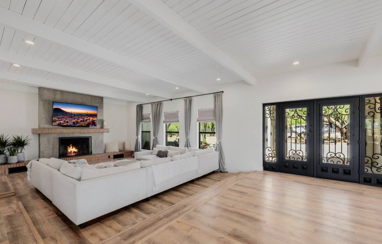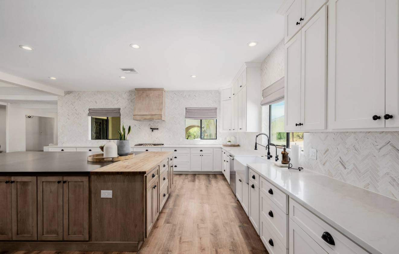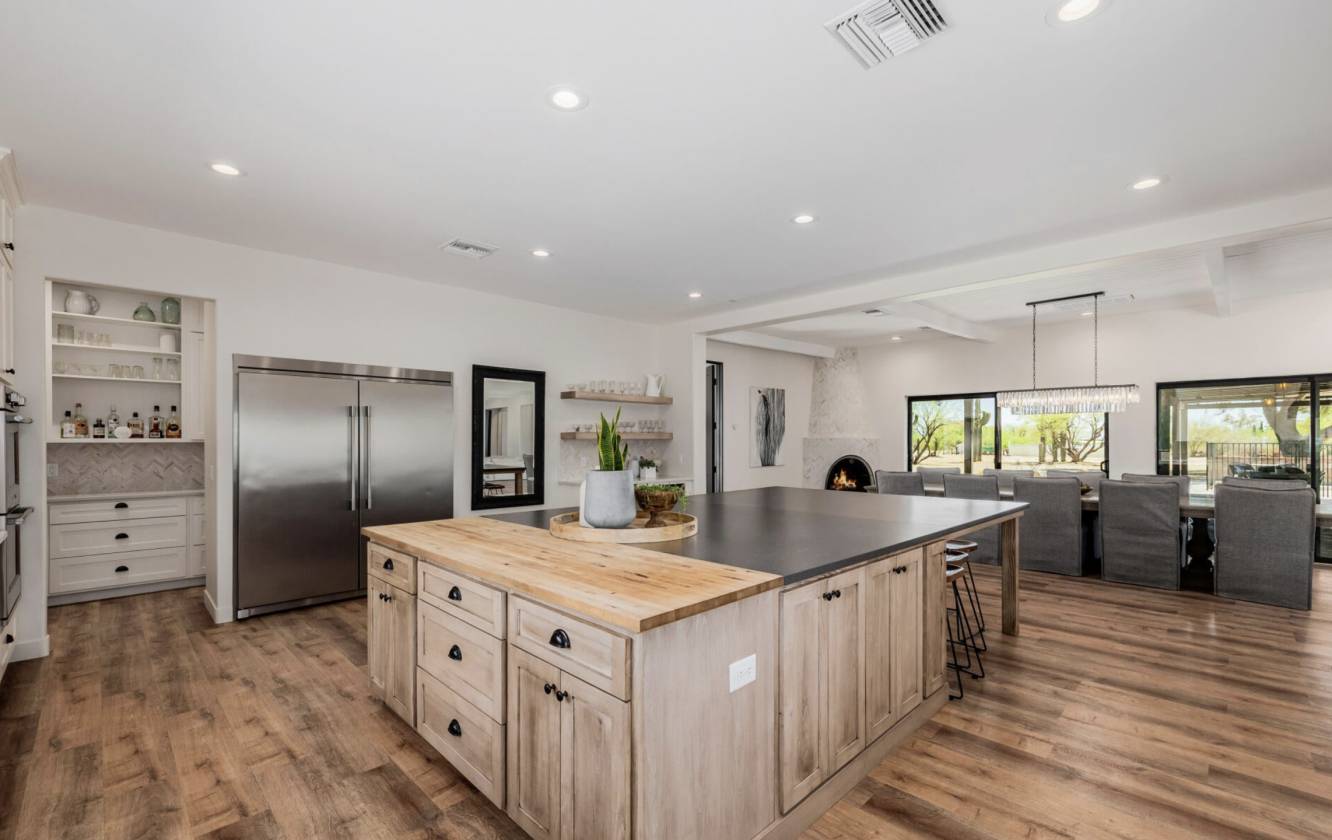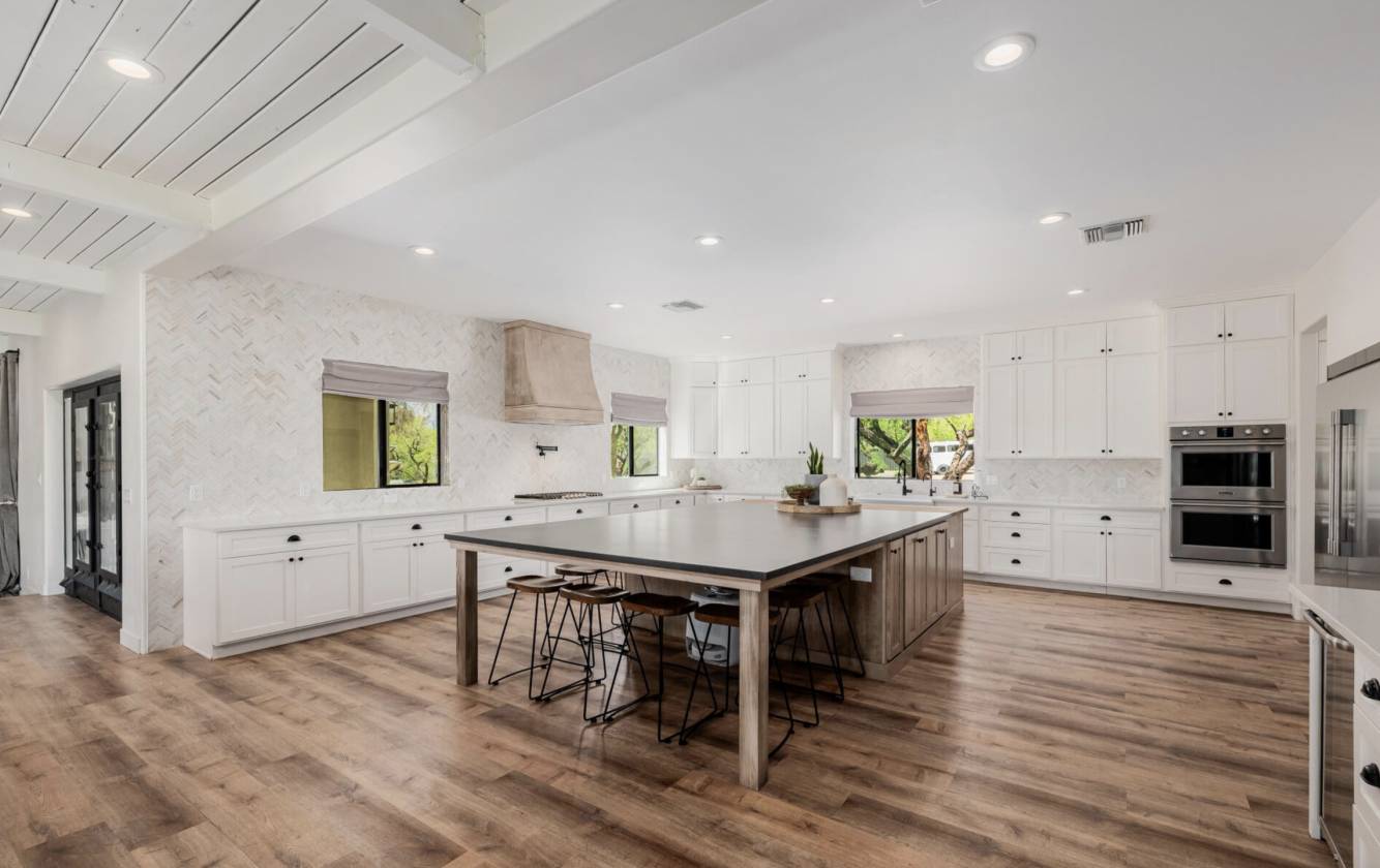 - Gourmet kitchen, oversized quartz island with breakfast bar, premium stainless steel appliances, wrought iron double doors , luxury flooring, exposed wood-beamed ceilings,