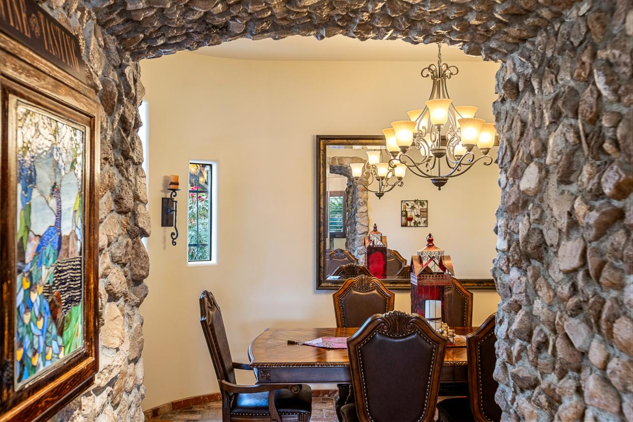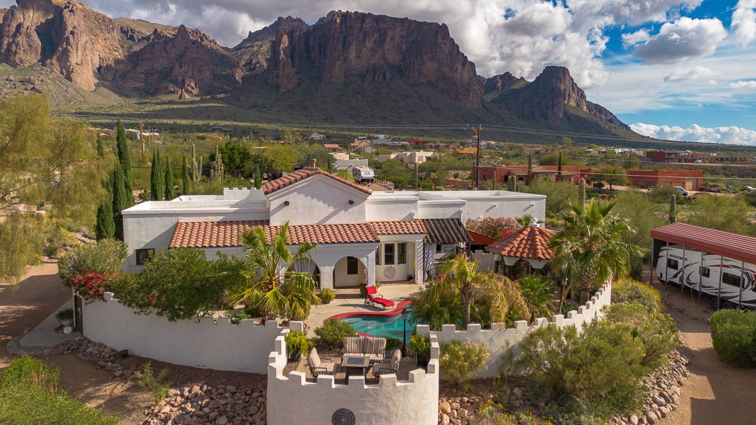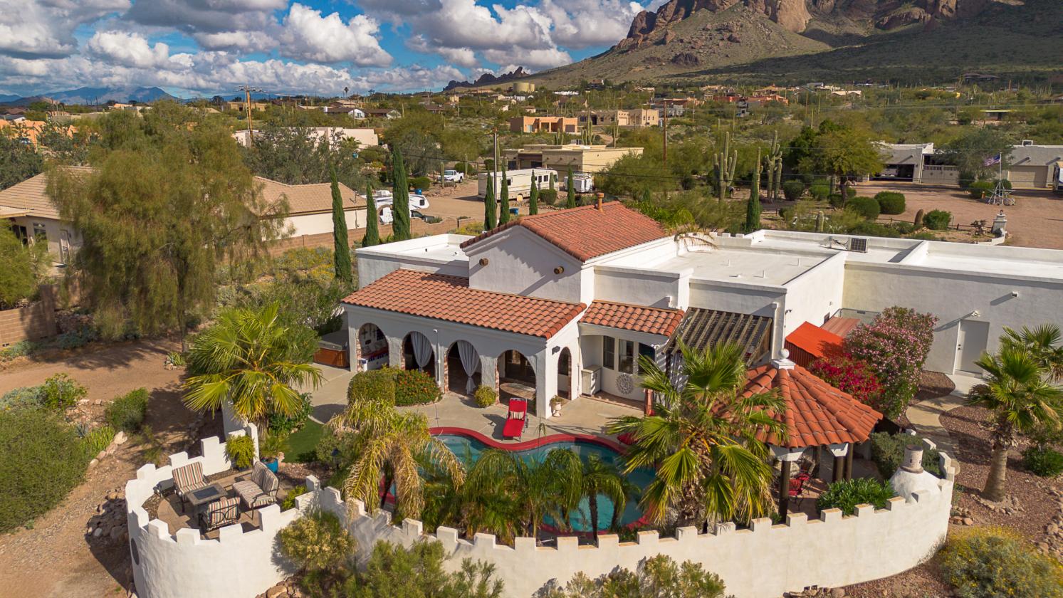 Discover your own private desert retreat on 1.21 acres in Apache Junction, where exceptional craftsmanship, purposeful design, and panoramic mountain views define everyday living. This Spanish style custom home (built in 2004) blends thoughtful architectural details with functional amenities tailored to both relaxed desert living and active lifestyles. Inside, the home’s 2,806 sq ft of living space features 3 bedrooms and 2.5 bathrooms with spacious room flows and memorable design touches. Vaulted ceilings, skylights, and extensive stone, tile, and brick flooring add warmth and character throughout. The living spaces are anchored by a handcrafted stone fireplace, while interior finishes like brick flooring and custom stamped concrete surfaces showcase the intentional quality found throughout the home. Rooms are bright and accommodating, with spaces thoughtfully designed for both daily living and entertaining. The primary suite includes dual vanities and a separate shower and tub, while the interior’s layout supports modern comfort with classic desert charm. Step outside and experience your own resort style backyard oasis, complete with a private pool, water feature, and a high end outdoor kitchen, perfect for gatherings under Arizona skies. A serene courtyard with a fountain captures both sunrise and sunset views of the Superstition Mountains, creating a backdrop that feels like art in motion. Equestrian enthusiasts will appreciate the property’s horse friendly features, including a riding arena, tack room, and direct access to nearby riding trails. No hauling required, just saddle up and ride straight from home. Additional property amenities include a large workshop, RV covered parking, a custom 2 car garage, and a private dog run for your four legged companions. Located with convenient access to local dining, shopping, and outdoor recreation, and just minutes to Phoenix Mesa Gateway Airport, this one of a kind property offers privacy, functionality, and stunning desert views, all in one unforgettable package.
