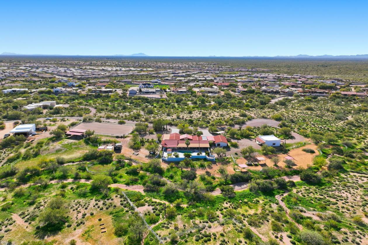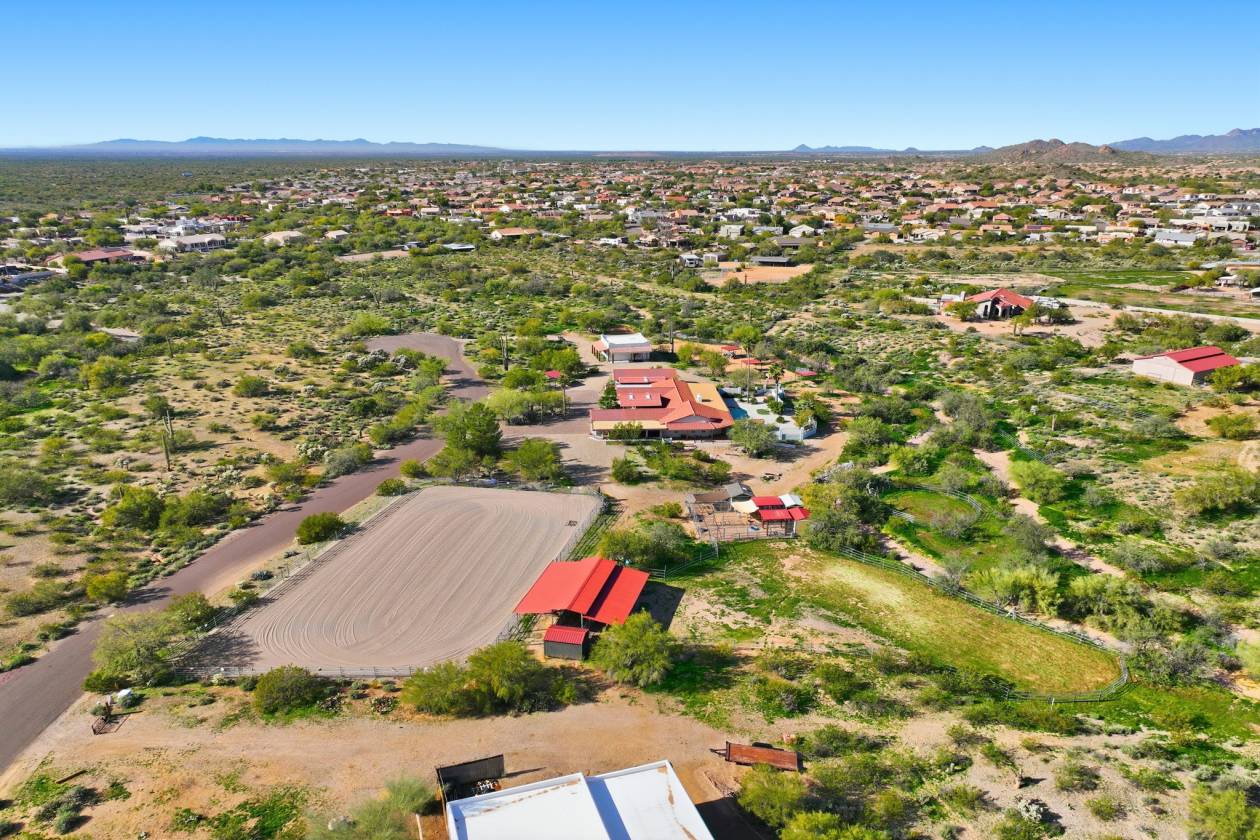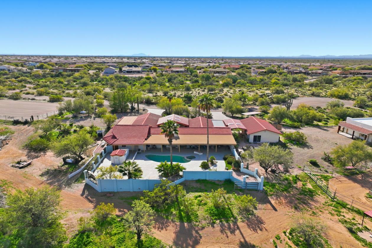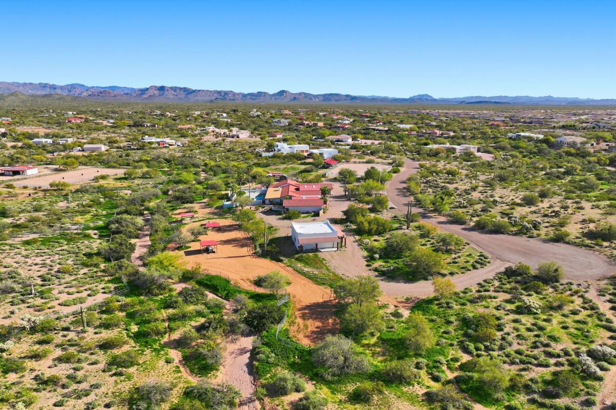 Set on almost 4 acres with sweeping panoramic Superstition Mountain views and a heated pool, this horse property delivers the full equestrian lifestyle. Built for 8+ horses, the setup includes a large sand arena, lit and covered stalls, paddock, turnout, a dedicated tack room and a round pen. Riding trails connect directly to the property, eliminating the need for any trailering. The main home offers 2,650 sq ft, updated (new roof 2025), single-level with a gourmet chef's kitchen featuring a giant quartz island, bright led lighting and a walk-in pantry. Open great room concept. Formal sunken living room with a fireplace. indoor workshop. The primary suite showcases an updated bathroom and giant walk-in closet. Guest house is 1,024 sq ft. New 32x32 Detached Garage. End of Cul-de-sac.