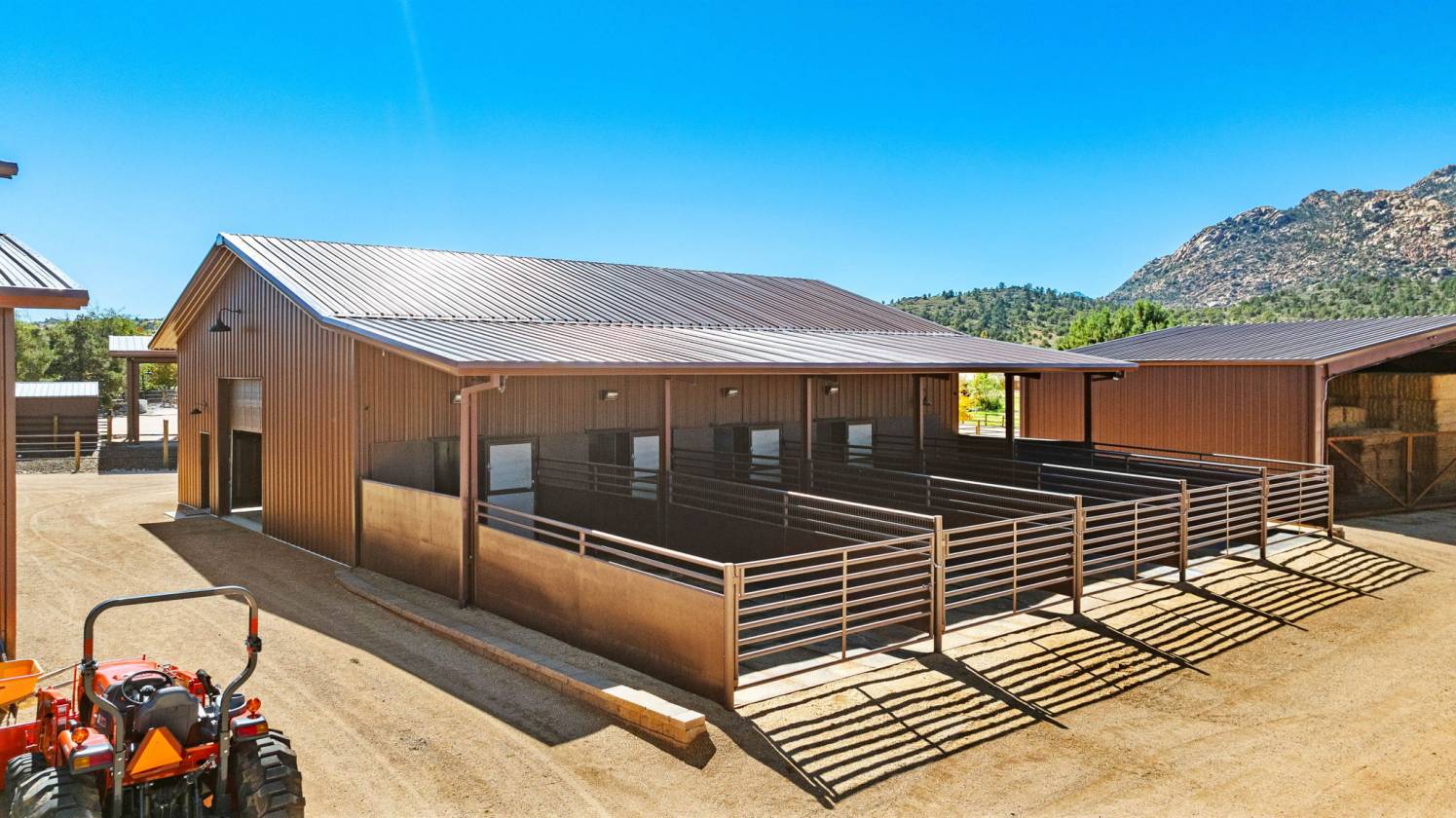 - 5-stall horse barn with tack and wash area, vet room, bathroom, office