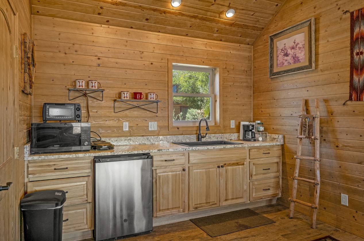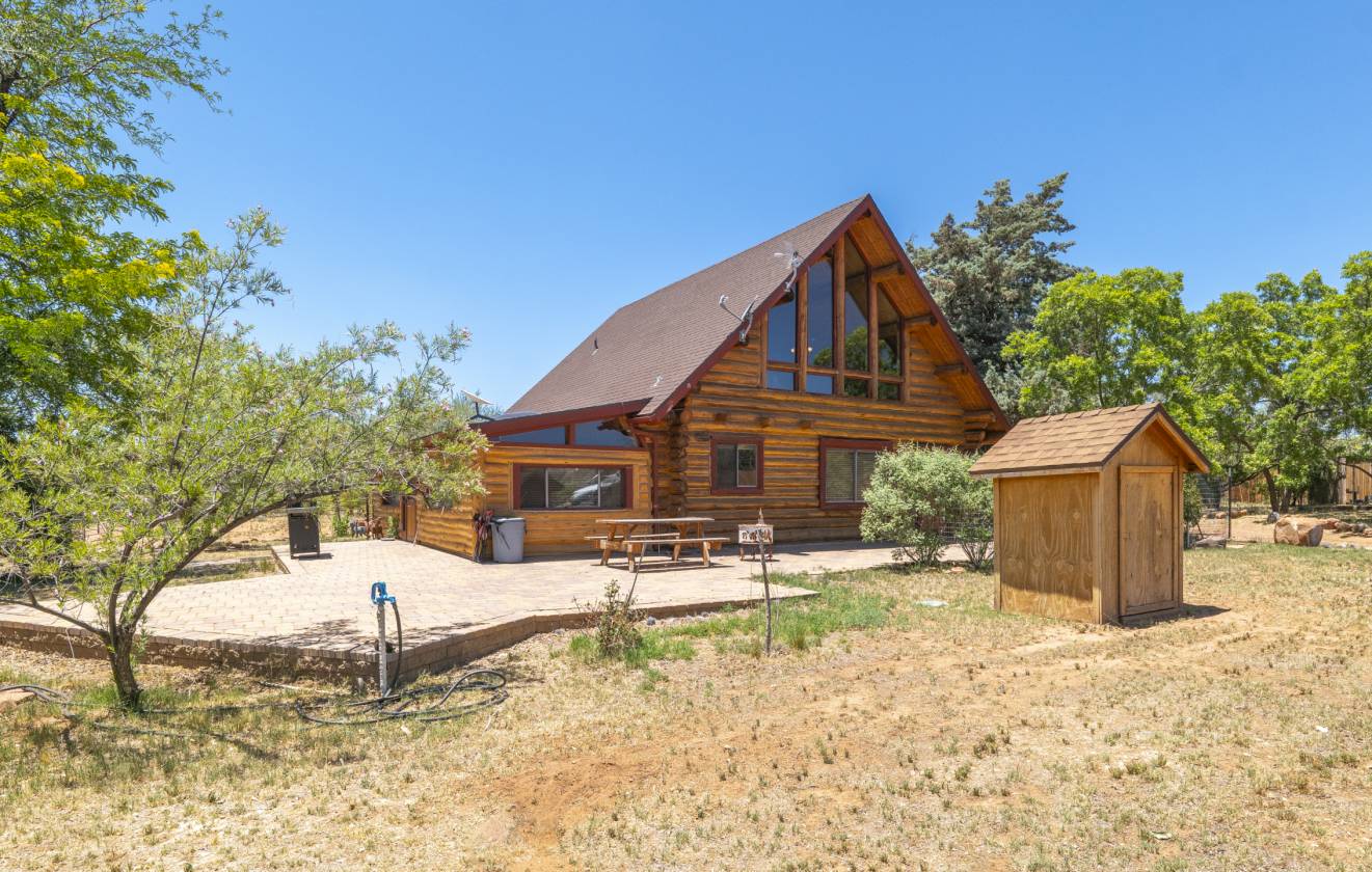 - The charming main log home (1BED/1BA + loft) features soaring ceilings, large windows that flood the home with natural light, and a warm, rustic feel. The gourmet kitchen is complete with stainless steel appliances, granite countertops, filtered water, a walk-in pantry, and a spacious island/breakfast bar. Step outside to the paved back patio, ideal for barbecues, soaking up the Arizona sunshine, or stargazing under Sedona’s clear night skies.