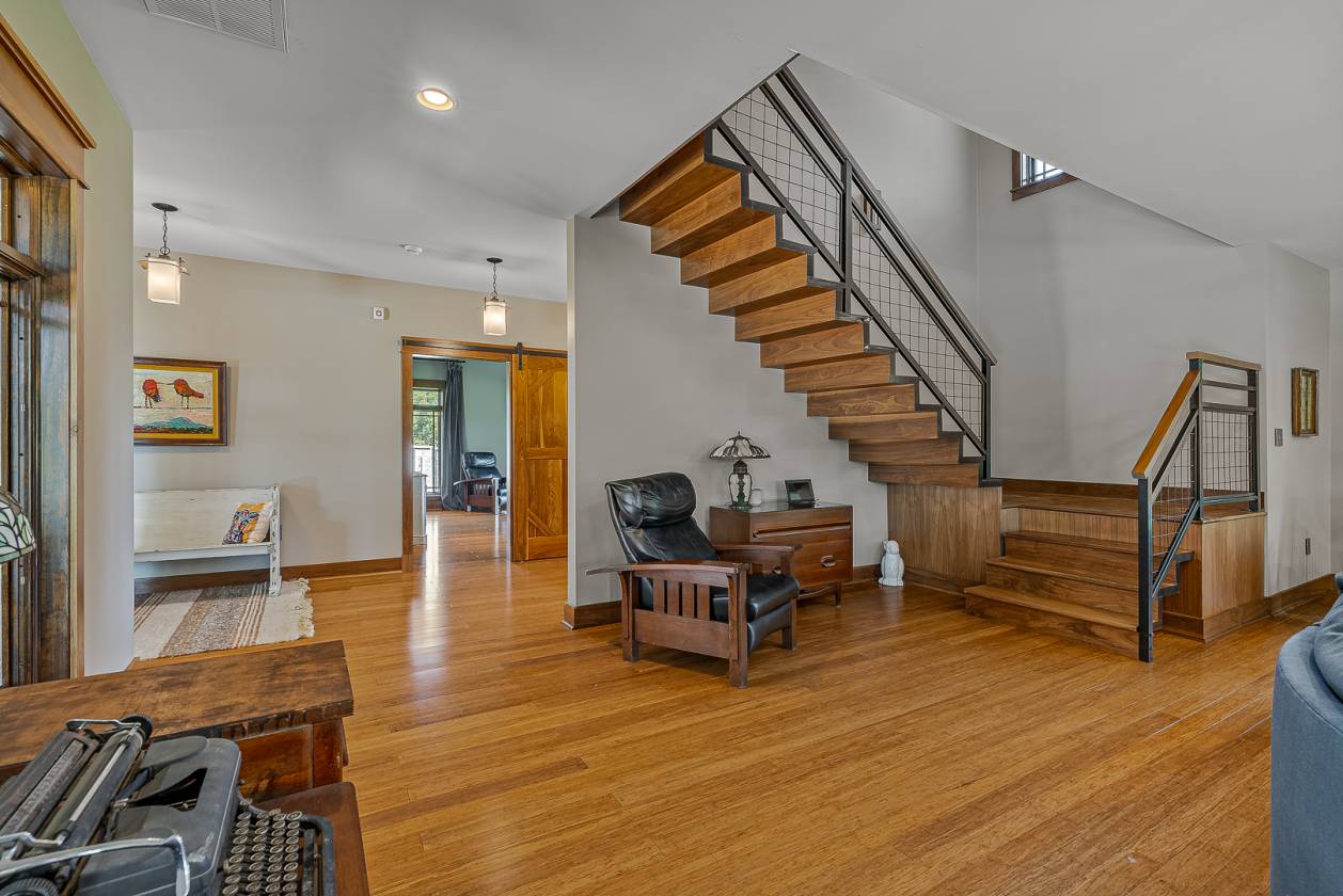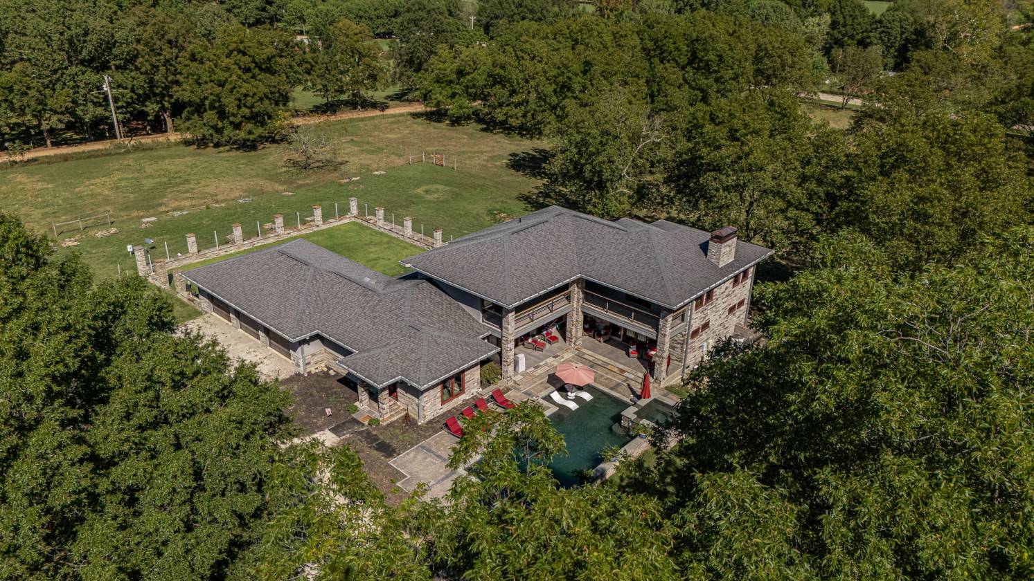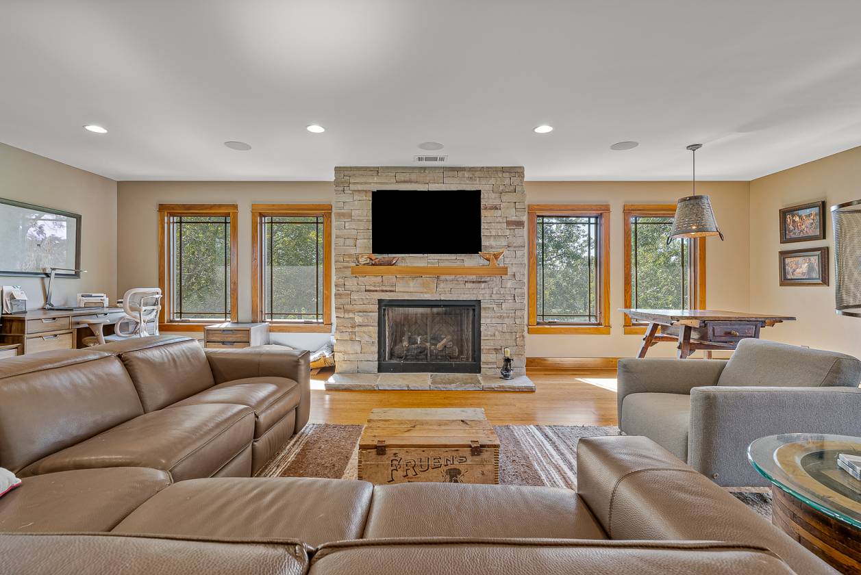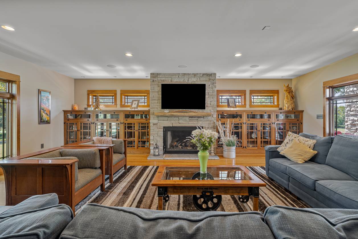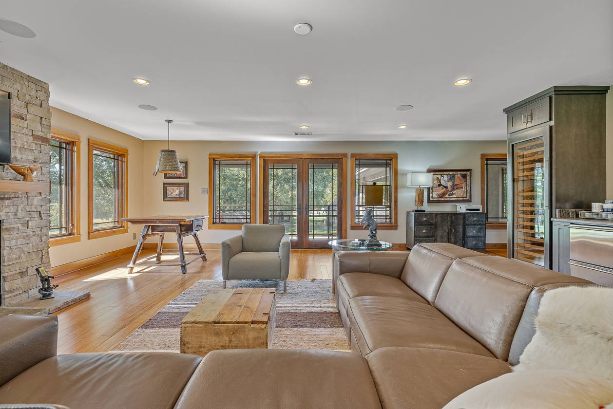 Set on 26 scenic acres, this stunning modern prairie–style home is a showcase of craftsmanship, detail, and timeless beauty. Every element was thoughtfully designed—from the milled black walnut trim to the heated tile floors and inviting wood-burning fireplace. The gourmet kitchen impresses with quartzite and Corian countertops, an oversized island, double fridge, warming drawer, pantry freezer, and crushed ice maker. The primary suite offers radiant heat floors, a soaker tub, dual sinks, an in-suite washer and dryer, and a spacious custom closet. A floating steel-framed staircase highlighted by a stained-glass chandelier leads to a second living space with fireplace and a full bar featuring a wine cooler, sink, and ice maker. The fully finished heated and cooled garage also includes a snow-melt system. Outside, enjoy a resort-style inground pool with spillover spa, a two-bedroom guest house with full kitchen and dual living areas, a large shop, and a picturesque pond with fountain—an extraordinary blend of luxury, comfort, and craftsmanship.