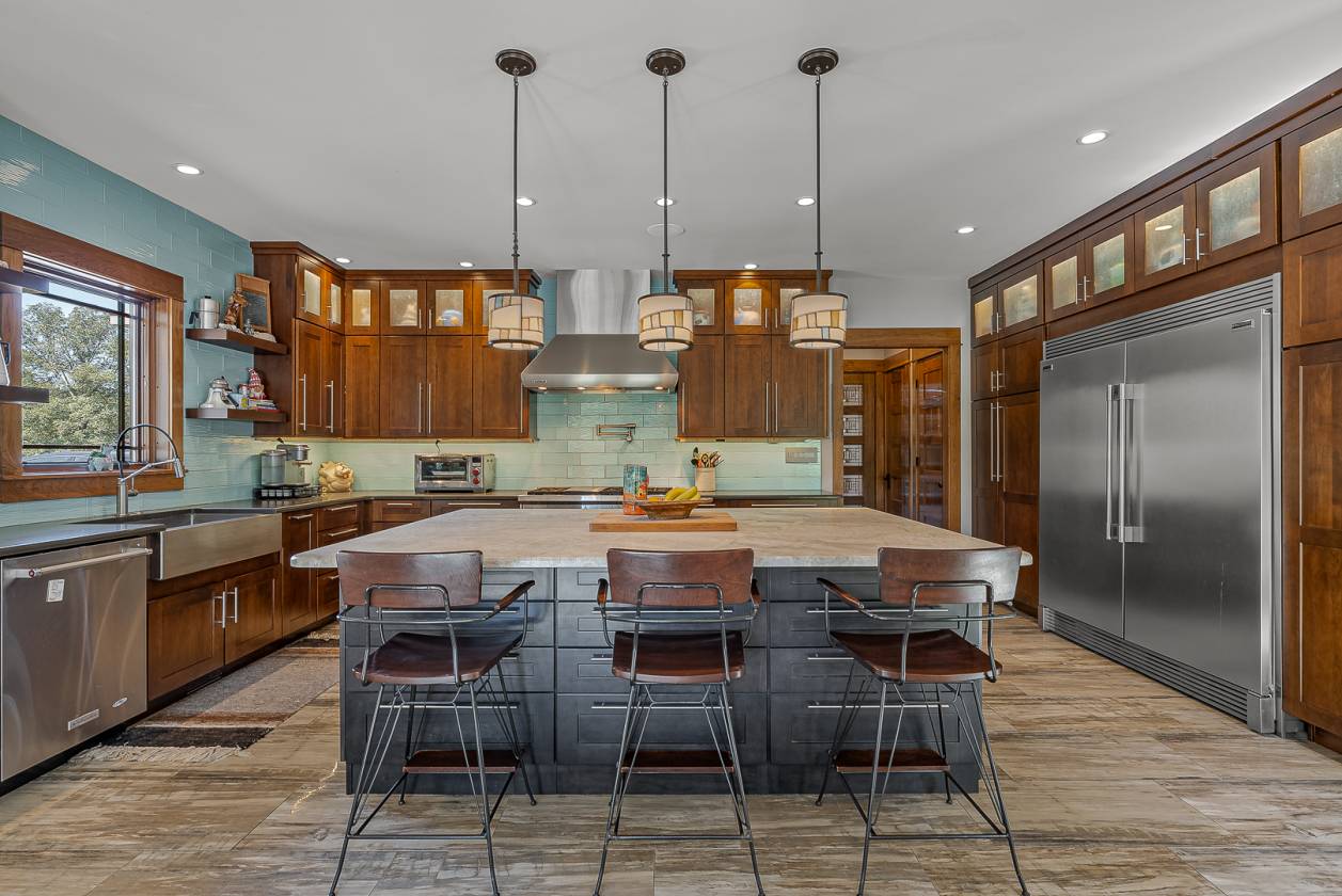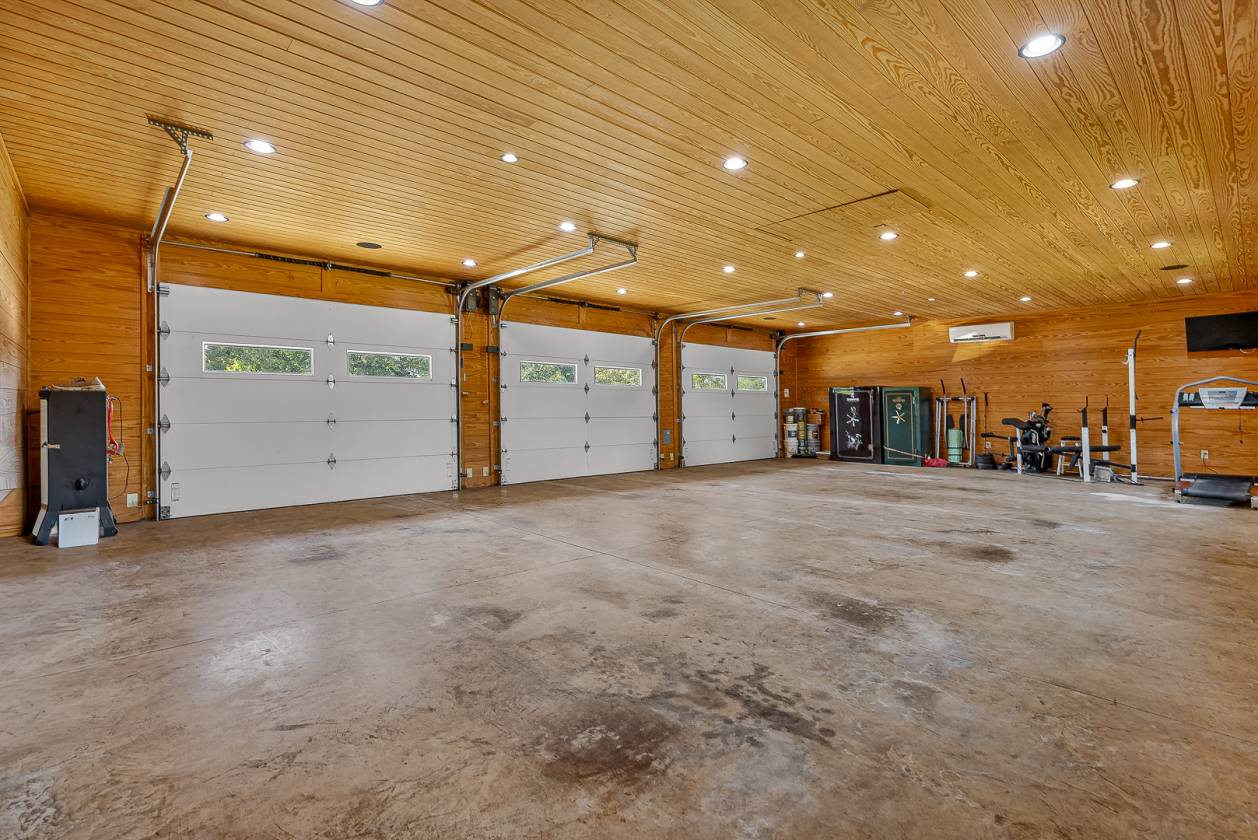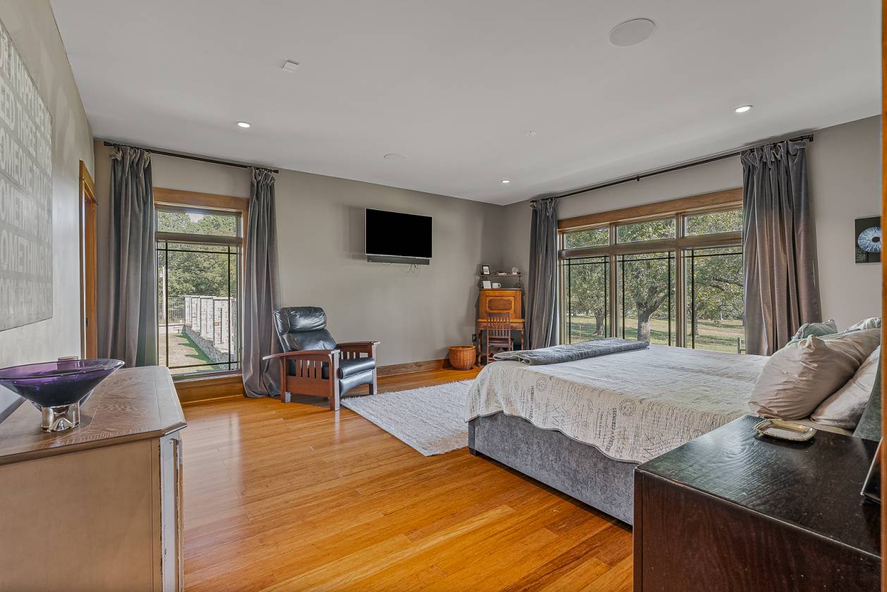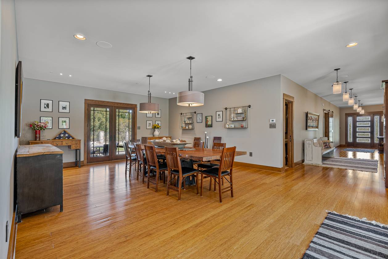 Set on 26 scenic acres, this stunning modern prairie–style home is a showcase of craftsmanship, detail, and timeless beauty. Every element was thoughtfully designed—from the milled black walnut trim to the heated tile floors and inviting wood-burning fireplace. The gourmet kitchen impresses with quartzite and Corian countertops, an oversized island, double fridge, warming drawer, pantry freezer, and crushed ice maker. The primary suite offers radiant heat floors, a soaker tub, dual sinks, an in-suite washer and dryer, and a spacious custom closet. A floating steel-framed staircase highlighted by a stained-glass chandelier leads to a second living space with fireplace and a full bar featuring a wine cooler, sink, and ice maker. The fully finished heated and cooled garage also includes a snow-melt system. Outside, enjoy a resort-style inground pool with spillover spa, a two-bedroom guest house with full kitchen and dual living areas, a large shop, and a picturesque pond with fountain—an extraordinary blend of luxury, comfort, and craftsmanship.