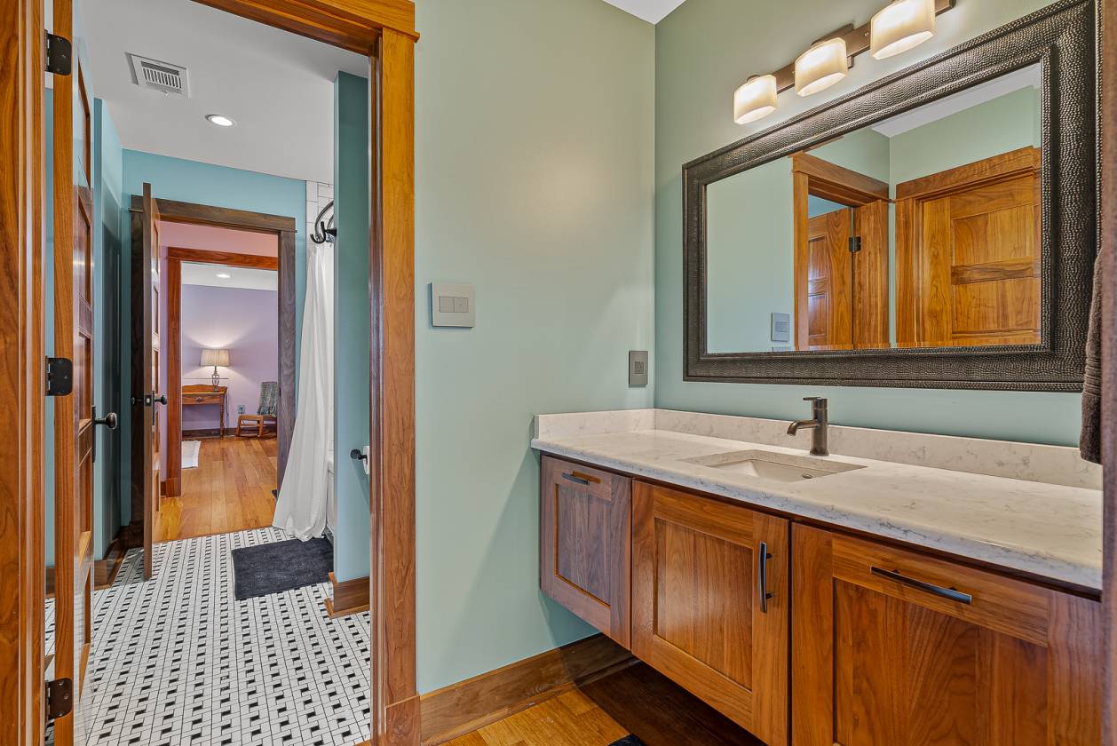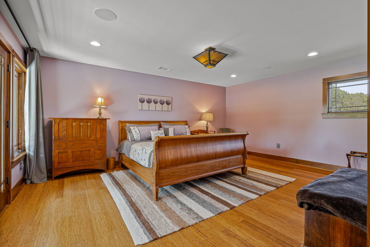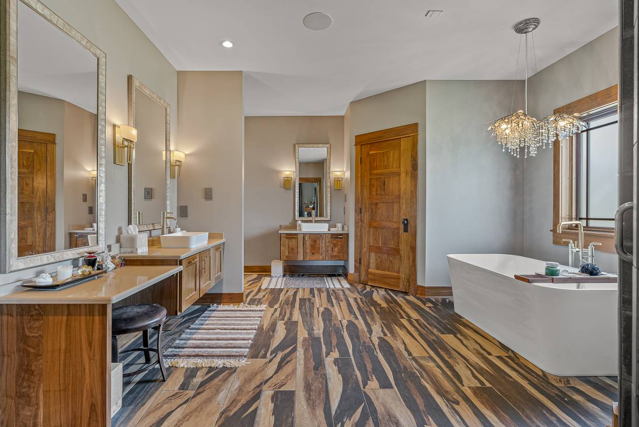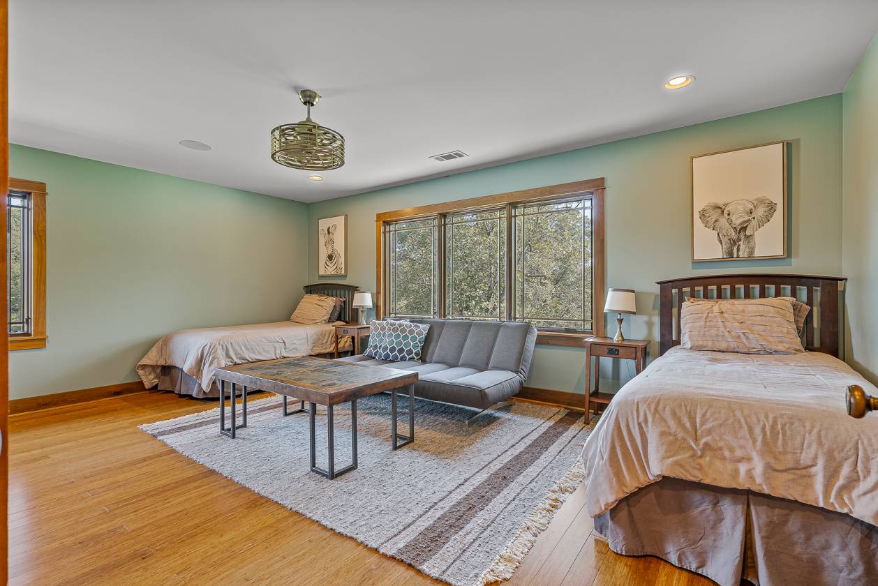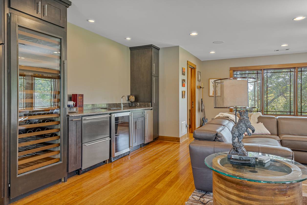 Set on 26 scenic acres, this stunning modern prairie–style home is a showcase of craftsmanship, detail, and timeless beauty. Every element was thoughtfully designed—from the milled black walnut trim to the heated tile floors and inviting wood-burning fireplace. The gourmet kitchen impresses with quartzite and Corian countertops, an oversized island, double fridge, warming drawer, pantry freezer, and crushed ice maker. The primary suite offers radiant heat floors, a soaker tub, dual sinks, an in-suite washer and dryer, and a spacious custom closet. A floating steel-framed staircase highlighted by a stained-glass chandelier leads to a second living space with fireplace and a full bar featuring a wine cooler, sink, and ice maker. The fully finished heated and cooled garage also includes a snow-melt system. Outside, enjoy a resort-style inground pool with spillover spa, a two-bedroom guest house with full kitchen and dual living areas, a large shop, and a picturesque pond with fountain—an extraordinary blend of luxury, comfort, and craftsmanship.