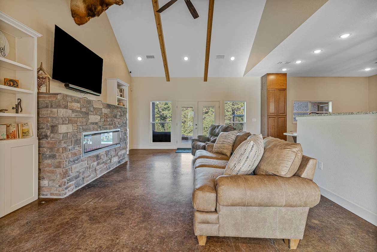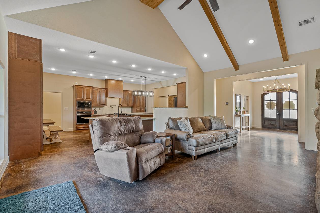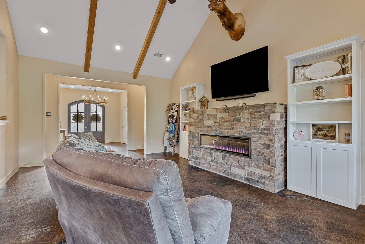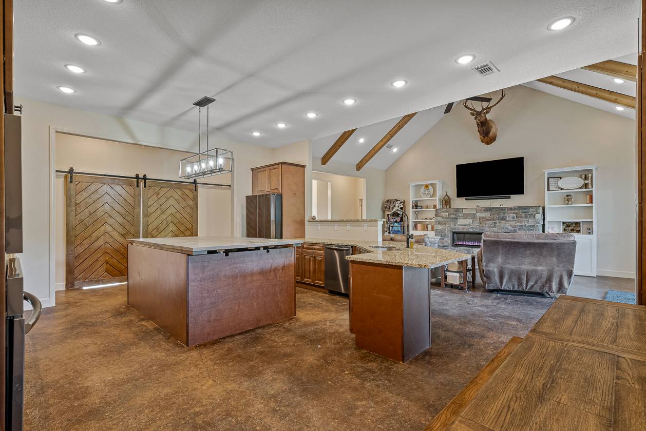 Welcome to Woodland Hills Estates - a stunning custom-built home on approx. 20 acres in a country setting just outside city limits. Built in 2024, this open-layout home features 10-ft ceilings throughout, creating a bright, spacious feel. Enjoy unmatched privacy with plenty of room to roam, yet stay minutes from town. Designed with comfort and security in mind, the home includes a hidden entrance in the kitchen island that leads to a downstairs safe room with a separate gun vault and lift-assist stairs. A unique blend of modern living and country charm.