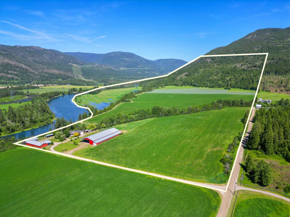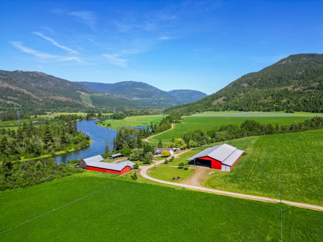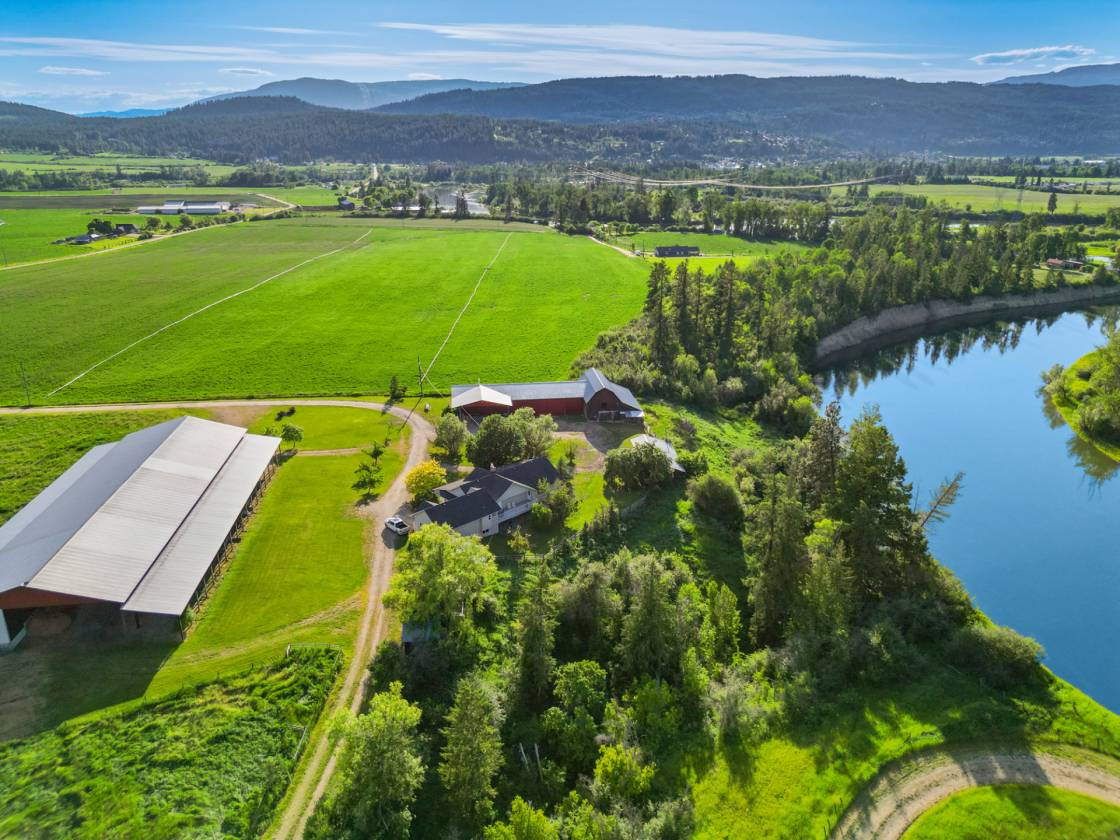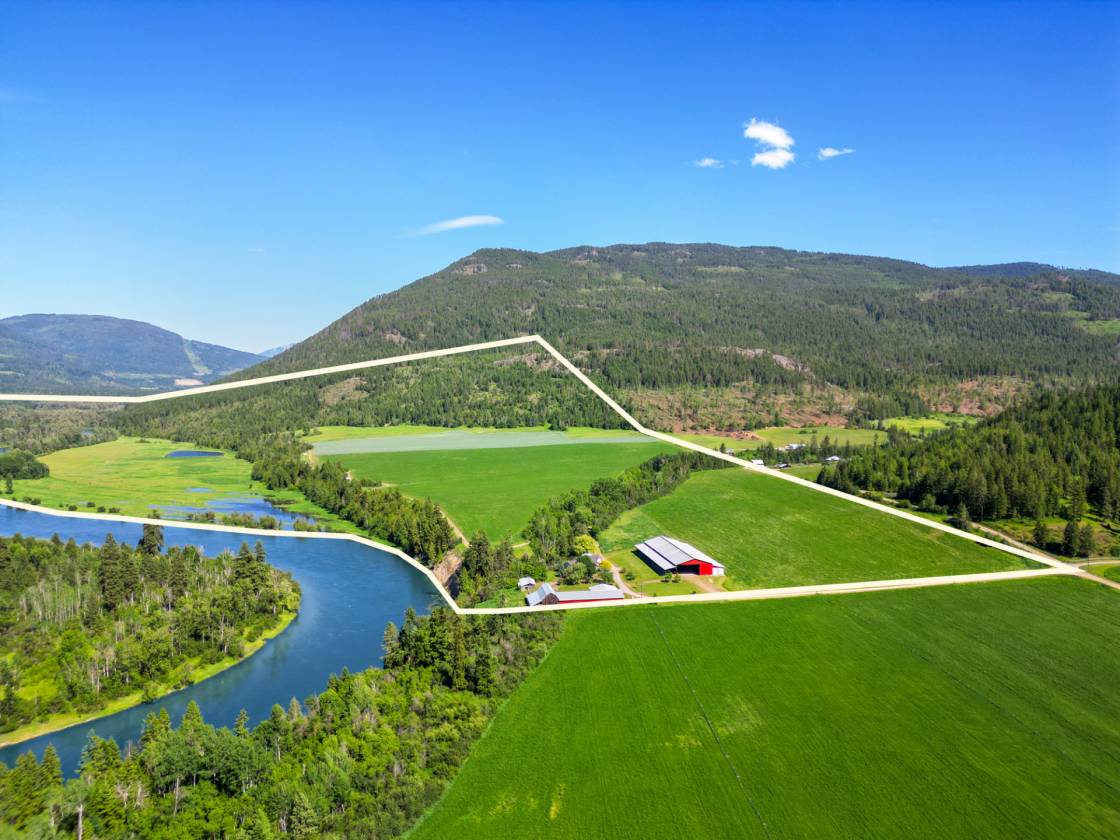 Exceedingly rare legacy holding - over 320 acres of prime farmland fronting on the Shuswap River, just 5 minutes from downtown Enderby and 30 minutes from Vernon Hospital. This exceptional estate offers scale, natural beauty, agricultural productivity, and equestrian potential—all in a highly accessible yet private setting, removed from major highways and thoroughfares. A spacious walk out rancher with potential for nearly 4600 sf & 429 sq ft attached garage, offers comfortable living with room to grow. Outbuildings include a 4000 sf shop with an attached vintage prairie barn and pole barn (approx 207' x 122' ft), ideal for variety of farming ventures, hay storage, or equestrian use. More than 100 acres of cleared, arable fields with an additional 75 acres available seasonally, primarily in hay production. Ricardo Creek also meanders through. The balance of the property is treed, much of it still accessible, and a significant portion of the hillside lies outside of the Agricultural Land Reserve (ALR). Rolling pastures framed by breathtaking river and mountain views, will leave you thinking you are gazing at a National Geographic spread. The majority of the property is in the ALR, which allows for a 2,000 sq ft secondary homes on parcels of this size, making it ideal for multi-generational living or future expansion. This is a once-in-a-generation opportunity to acquire a property of this scale, calibre, and proximity to services. Backs onto thousands of acres of crown land.