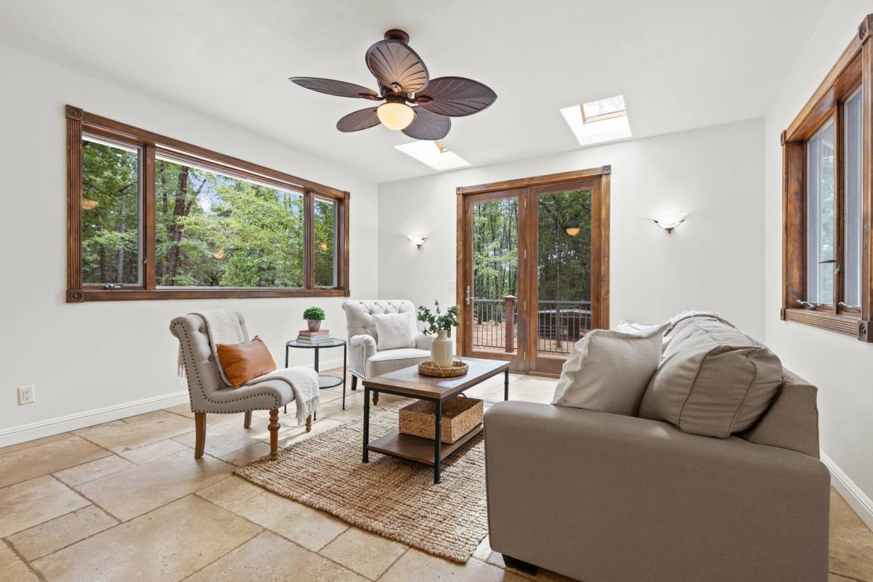 This property was designed to be a sanctuary inside and out, with so much space and light throughout. The front living area off the entryway offers numerous windows with endless views of trees.