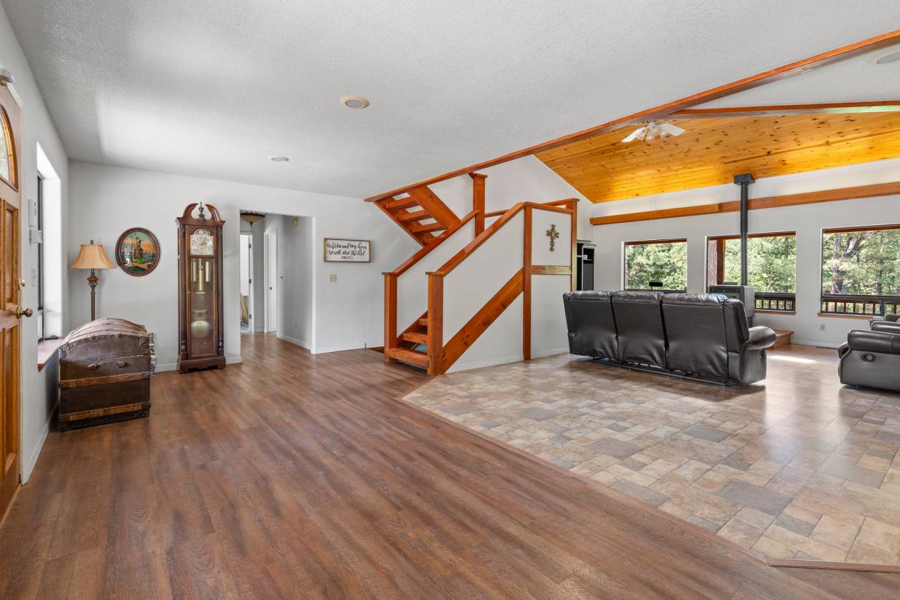 Lake House Dream! Welcome to your mountain escape in the exclusive Miner's Lake HOA. A quiet community of just a few homes sharing access to a private, amenity-rich lake. Enjoy 20 acres of outdoor recreation, including two private docks, a large BBQ area with picnic tables, and a lake stocked with largemouth bass perfect for swimming, kayaking, and fishing. Trail riding is welcomed and other trail rides within the area. The home itself is spacious and inviting, featuring vaulted wood-clad ceilings, abundant natural light, and a full wrap-around porch for year-round enjoyment. The main level offers a formal entry, a large living room, a primary suite, an additional bedroom, and a conveniently located kitchen with generous cabinetry and adjacent laundry. The lower level has a bedroom, bathroom, and a multi-use open area. Upstairs, a bright open loft includes its own private balcony where you'll enjoy breathtaking sunset views you'll never grow tired of. Plus, a whole-house Generac propane generator keeps things running smoothly no matter the weather. The HOA permits two horses per private acre. This property has 4 private acres for a maximum of 8 horses allowed. Other livestock are welcome as well, with a charming red stable and small pasture ready to go. Whether you're looking for a full-time residence or a mountain getaway, this is a rare opportunity to enjoy comfort, beauty, and lake life all in one place!