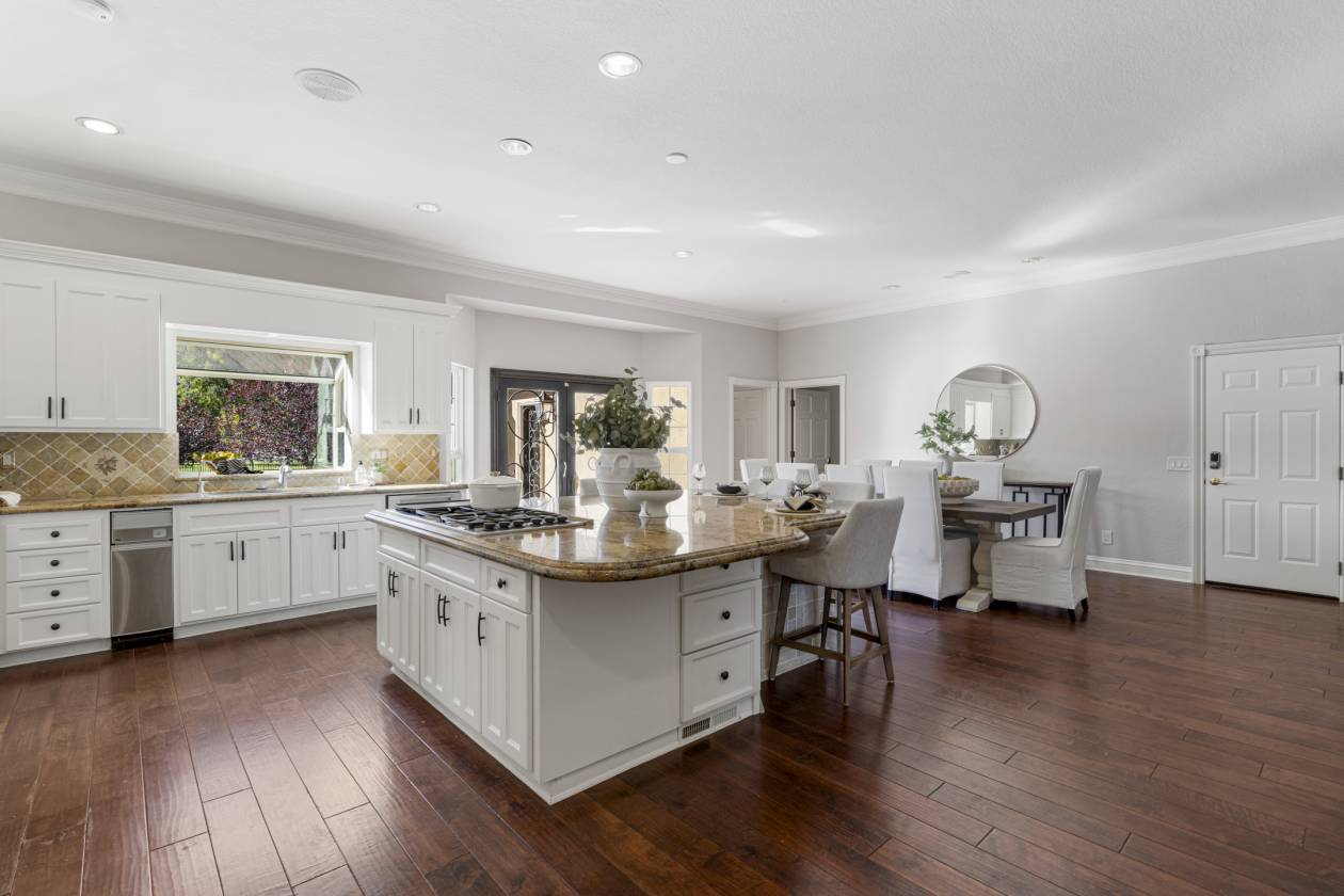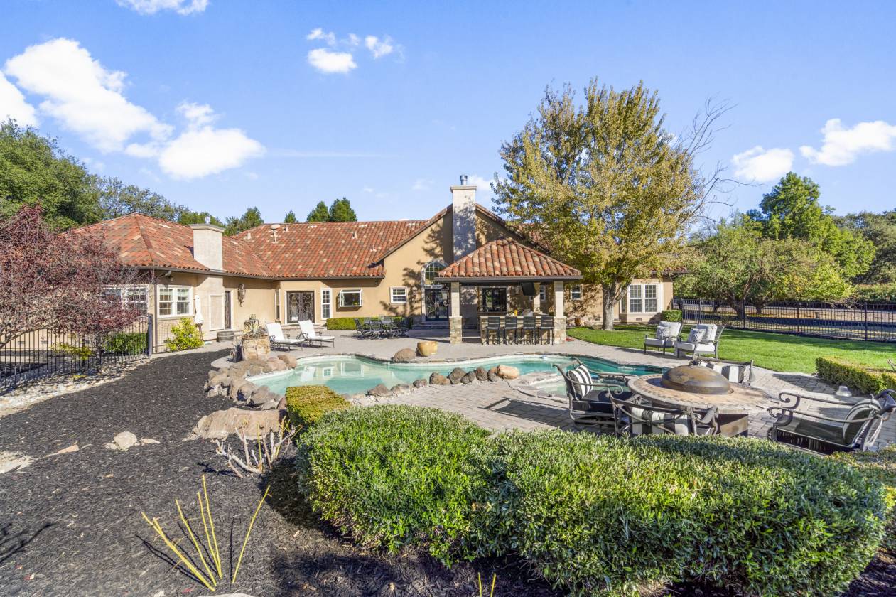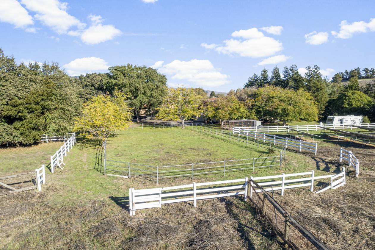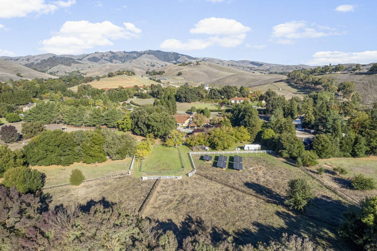 Welcome to Danville’s Tassajara Valley, where 5655 Bruce Drive offers the perfect blend of country serenity and refined living. Set on a flat 5.35-acre lot, this single-story estate spans over 5,373 square feet with six bedrooms, a bonus room, and 3.5 baths — offering flexibility for family and guests alike. The chef’s kitchen is the heart of the home, featuring high-end stainless steel appliances, a spacious center island with seating, walk-in pantry, and large casual dining area. The spacious formal dining room can host large family get togethers and the living room intimate gatherings, while the family room showcases soaring ceilings, a fireplace, wraparound bar, and space for a large media setup. The primary suite and a secondary bedroom sit on one side of the home, with additional bedrooms (including a junior suite) on the other. A mudroom, bonus room, and large laundry area complete the thoughtful floor plan. Outdoors, enjoy resort-style living with a covered pavilion and full outdoor kitchen, pool and spa, and expansive grounds lined with peach, apricot, plum, olive, walnut, and almond trees. Additional features include hardwood flooring, new carpet and paint, dual water heaters, two fireplaces, security system and owned solar with dual Tesla Powerwalls, dramatically reducing energy costs while providing backup power. For the equestrian enthusiast there is a six-stall barn with birthing stall, tack room, storage area, and full bath, plus multiple fenced pastures and space for an ADU or additional outbuildings. Private, and surrounded by natural beauty — all just minutes from top-rated Danville schools, shopping, and dining — 5655 Bruce Drive offers the best of luxury country living in the heart of Tassajara Valley.