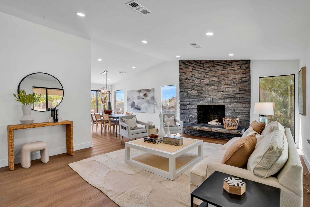 - Spacious living room with fireplace and large picture windows framing the scenic backdrop