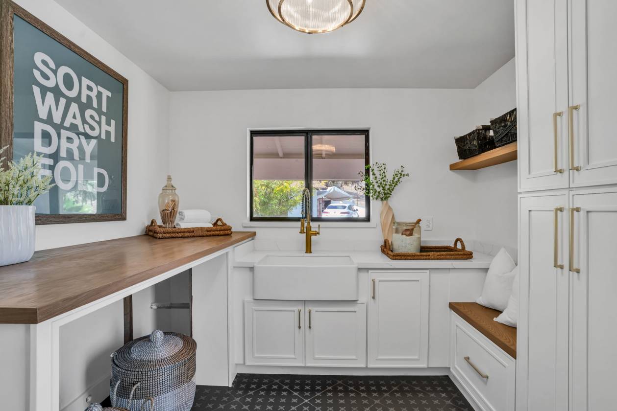- Spacious with folding station, farm sink, cabinetry, and separate exterior entrance