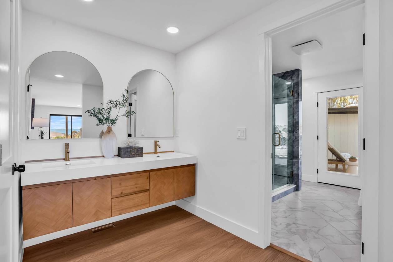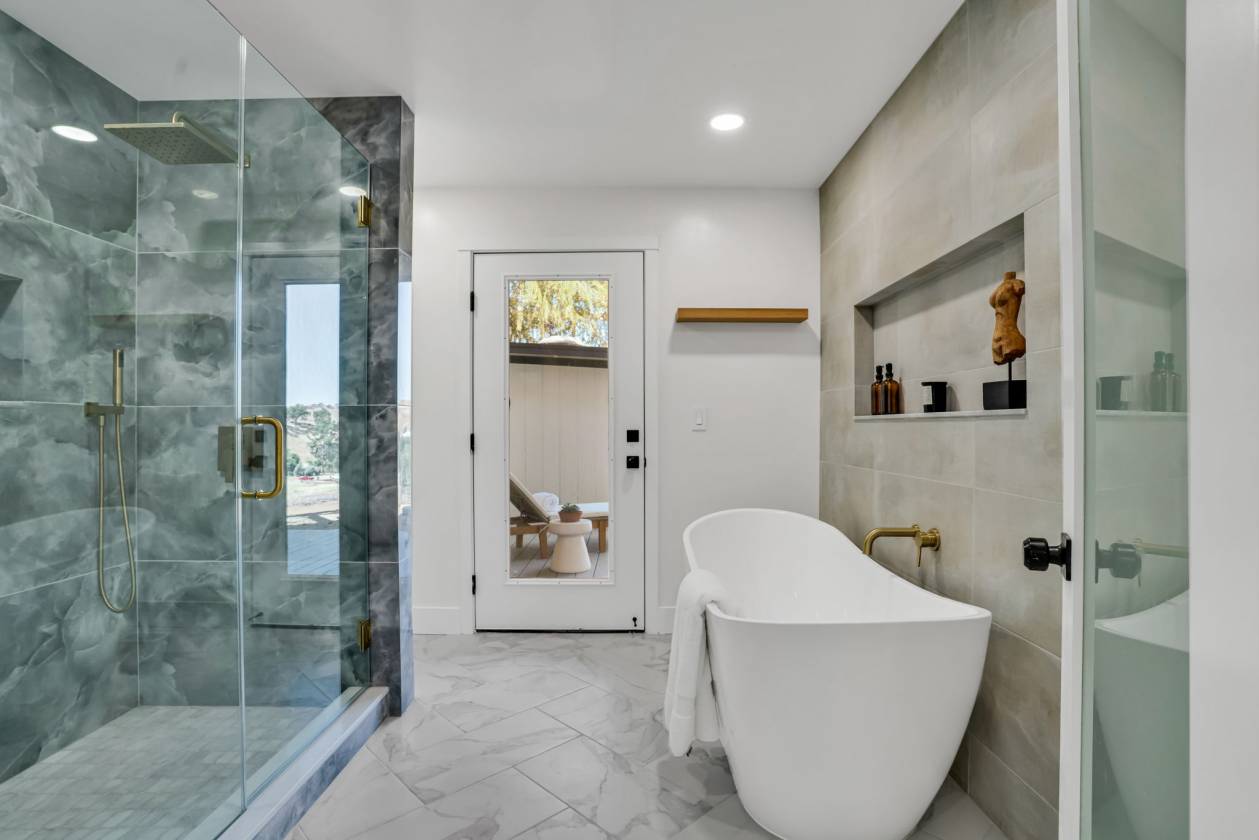 - Spa-inspired ensuite bath featuring a floating dual vanity, freestanding soaking tub, and glass-enclosed walk-in shower
