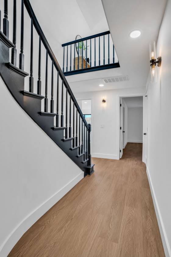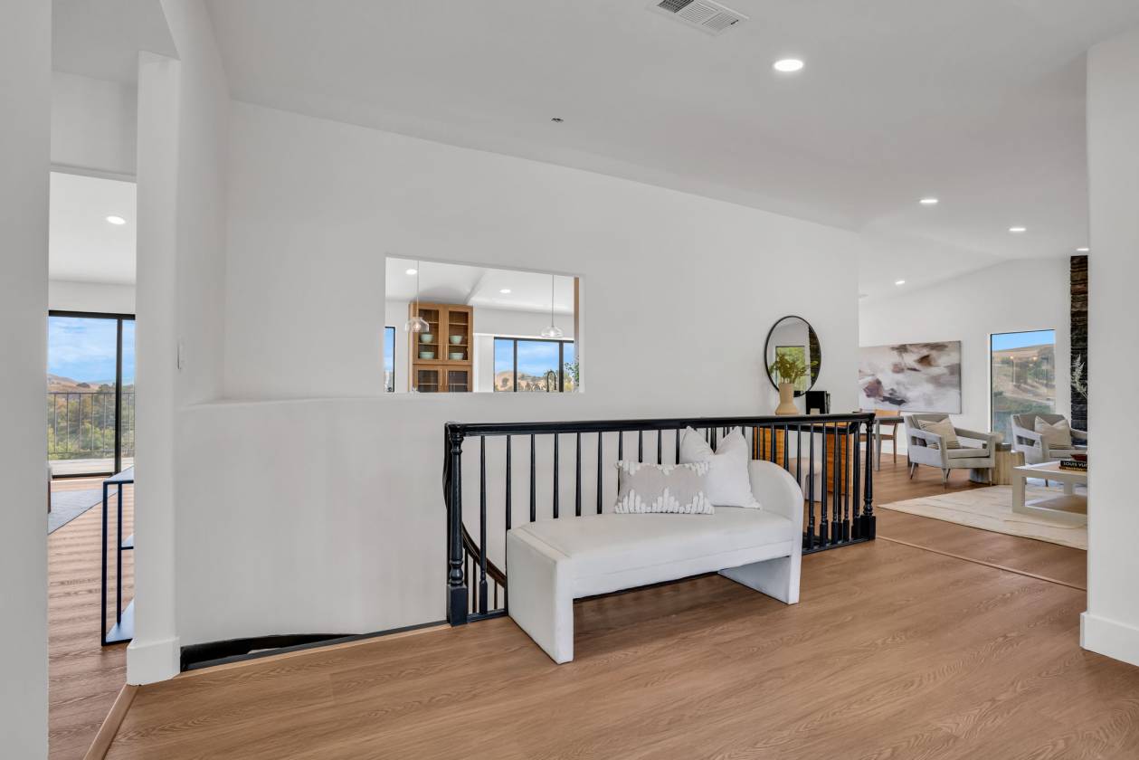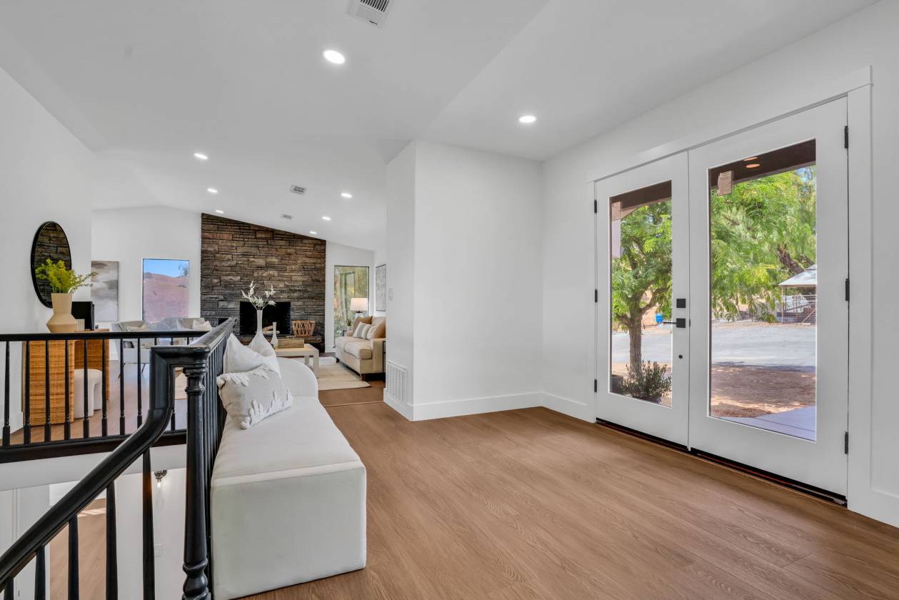 - Elegant double-door entry opens to a light-filled foyer with sweeping views