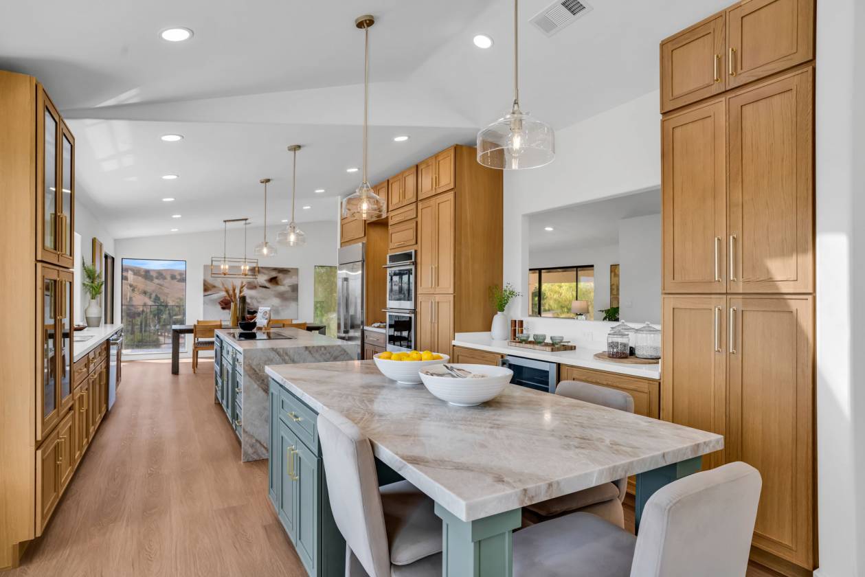- Dual oversized islands — one with waterfall quartz countertops, the other with bar seating