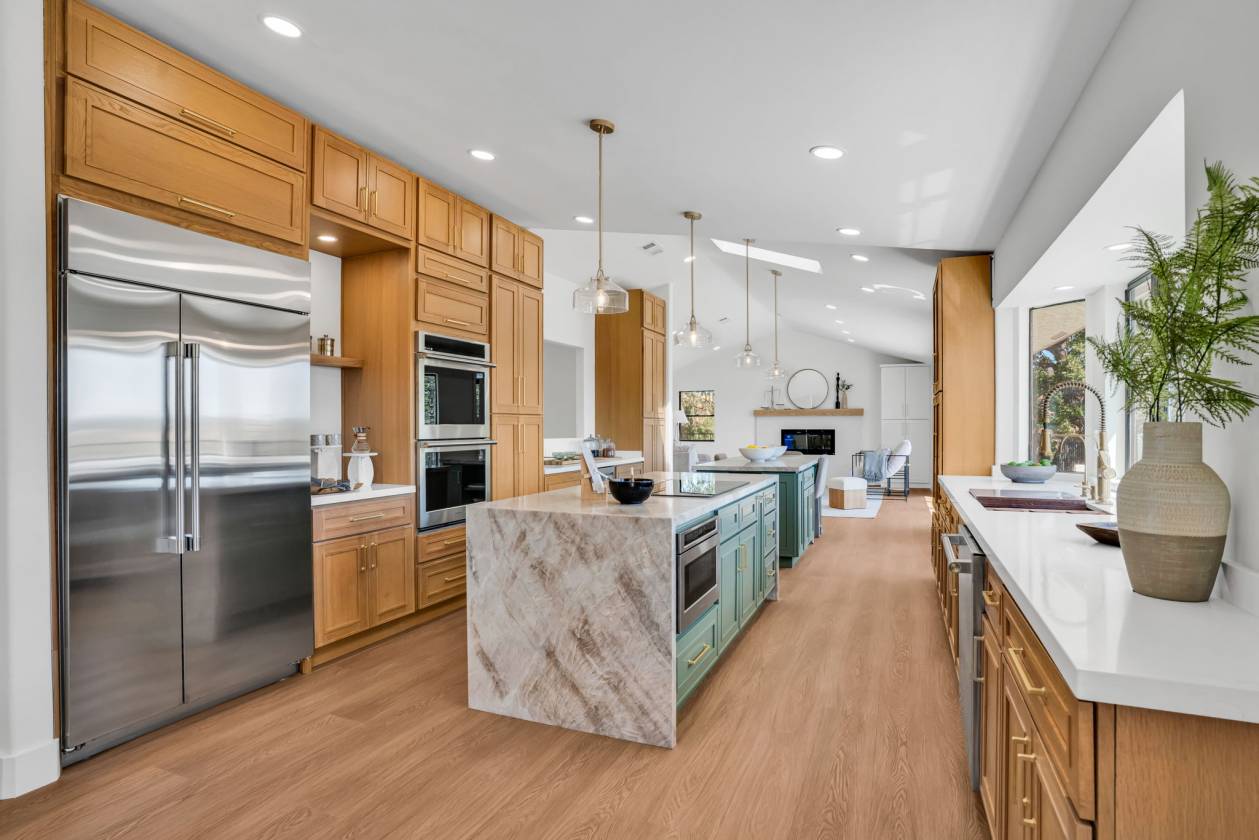 - Built-in refrigerator, double ovens, and custom cabinetry