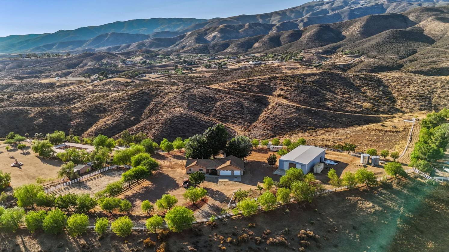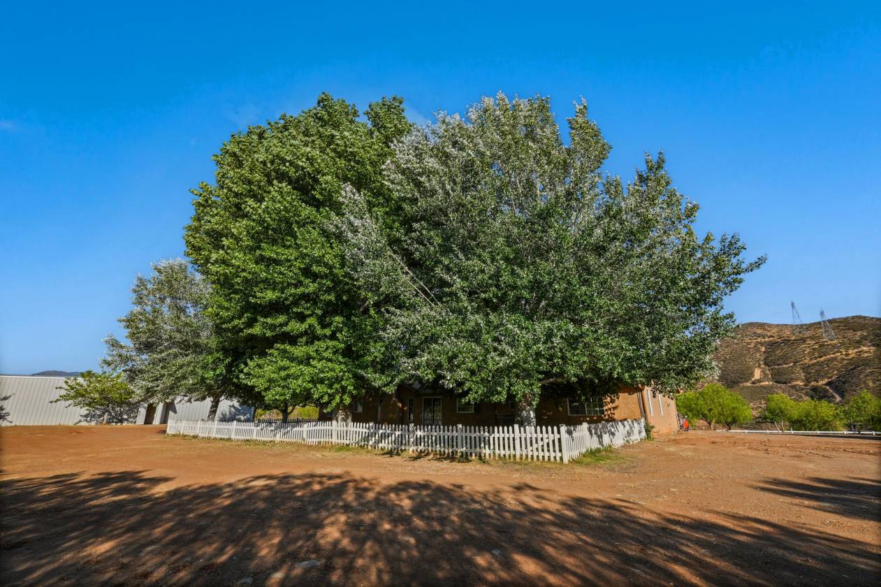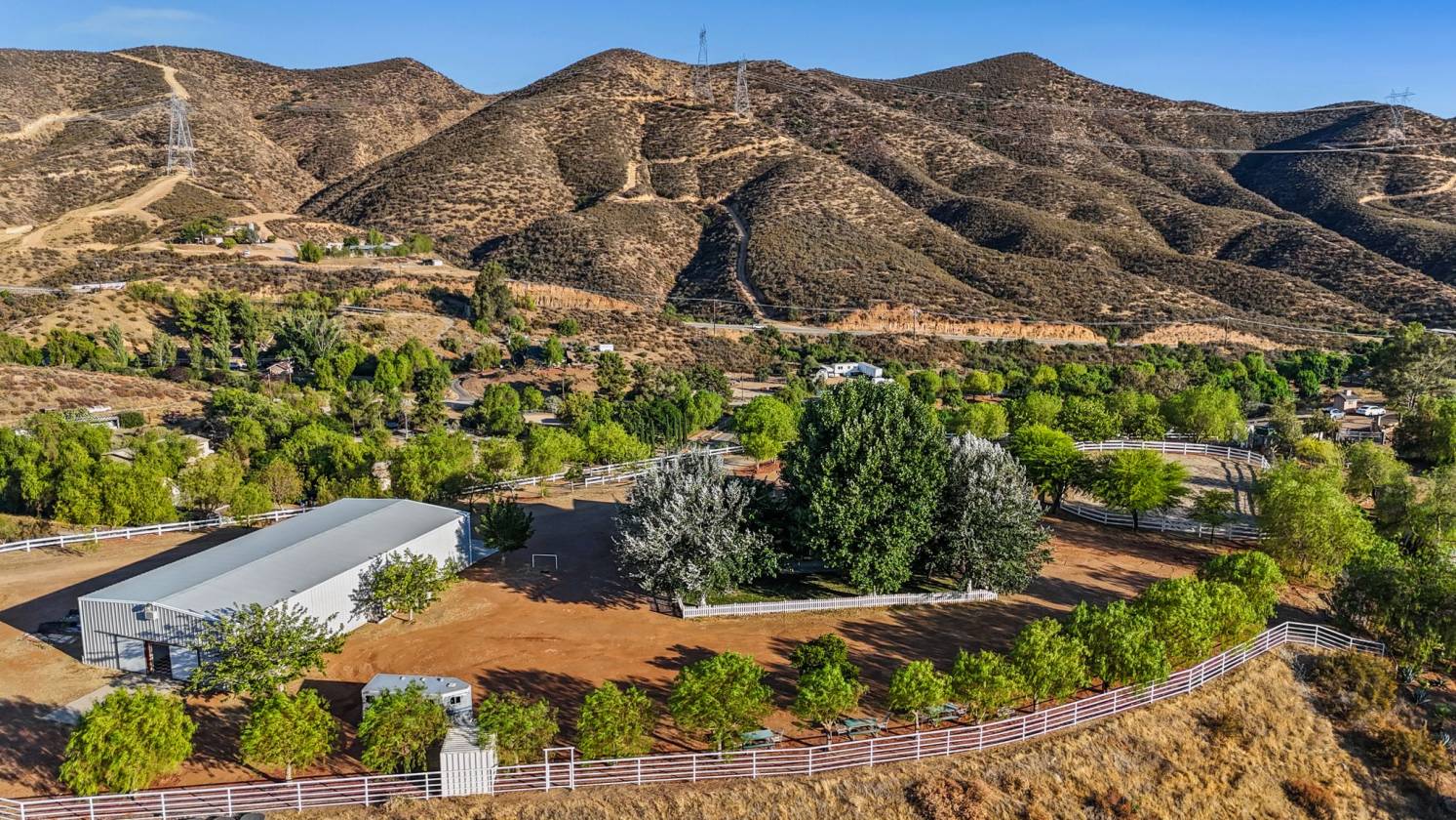 Rare Hilltop, Equestrian Estate with an Industrial-Scale Workshop. This spectacular hilltop estate —comprised of two parcels (APNs: 3214-018-027 & 3214-018-029) totaling over 17.5 acres—combines a spacious custom home, 360-degree panoramic views, a fully permitted industrial-scale workshop, and an adjacent lot, creating a parklike sanctuary with room to grow. A gated, private driveway leads into the approx. 1,800 sq. ft. residence which is designed to maximize privacy while showcasing the stunning natural landscape. It features three bedrooms, three bathrooms, and an office with a private entrance—perfect for working from home. Additional highlights include a 3-car garage, recently serviced septic system, new HVAC, new kitchen appliances, and exterior lighting on the buildings and driveway. The fenced backyard has lush grass, mature shade trees. The crown jewel of this estate is the fully permitted workshop—an incredibly versatile facility ideal for a variety of interests. The building is currently being used as a soundstage and includes two private offices, a bathroom, a spacious second-story storage loft, full 220-amp power, and an oversized RV door. For equestrian enthusiasts, the property features a riding arena, paddock, and ample space for horses to roam. Water resources include two 7,500-gallon storage tanks and a private well. This remarkable property is more than a home—it’s a park, ranch, equestrian facility, hobbyist playground, film location with soundstage, and business opportunity. A rare offering where space, nature, and opportunity come together to support the lifestyle you've been looking for. Saddle up and let’s go. Make your dreams come true.