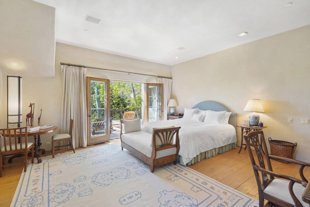 - There are two additional en-suite guest bedrooms, a gym with a sauna, and a den with a kitchenette, all with access to tranquil outdoor spaces surrounded by mature trees.