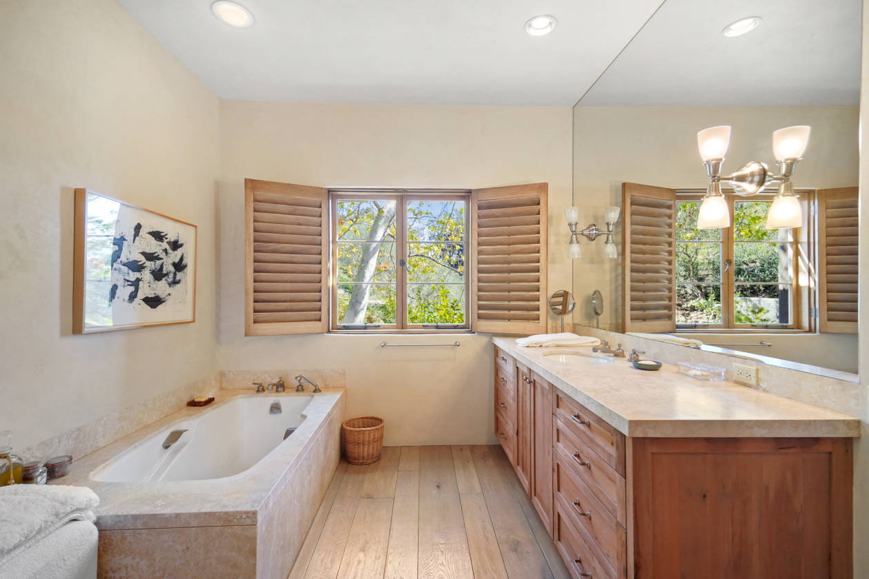 - Downstairs, the second primary suite has access to a ground-level terrace with a water fountain.