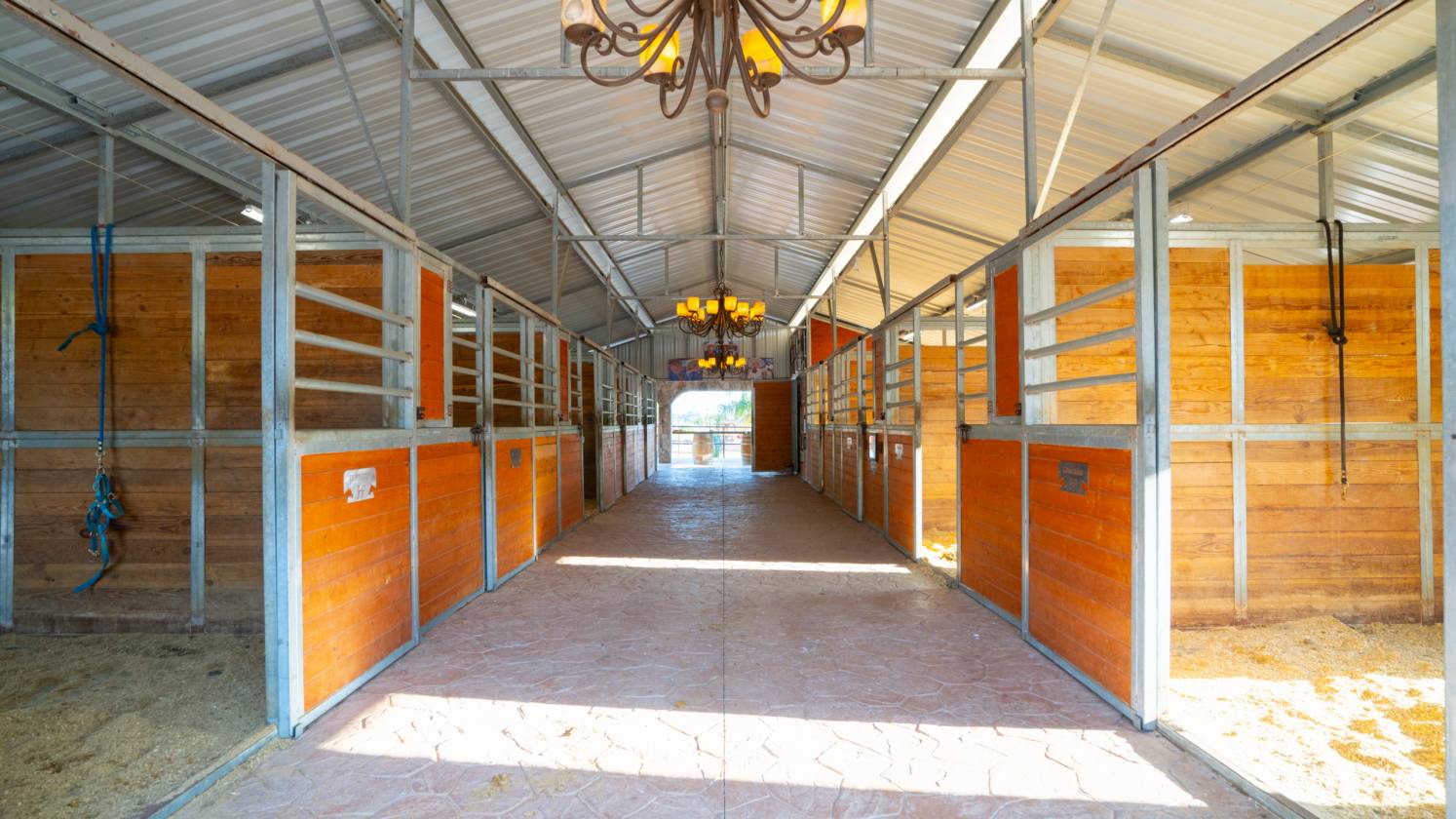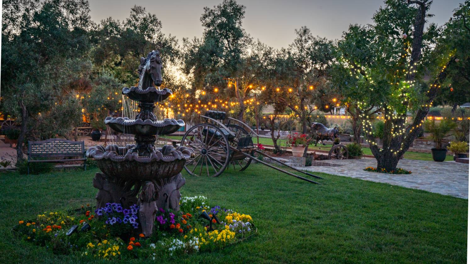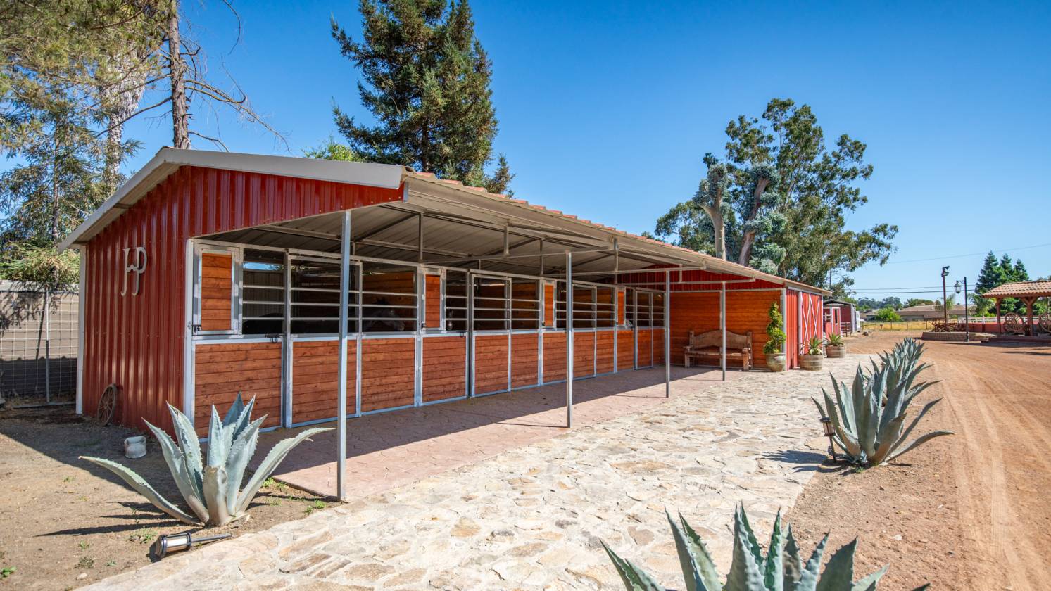 Set on beautifully landscaped grounds, the property includes 4 acres of mature olive trees, sparkling water features, twinkle lights, bocce ball, and a pizza oven—perfect for gatherings after a day with the horses.