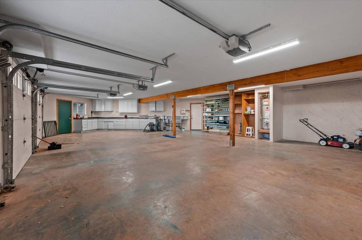 - Lower level: oversized 3-car garage with workshop area, metal & wood shelving, built-ins