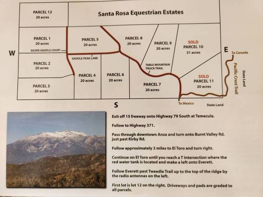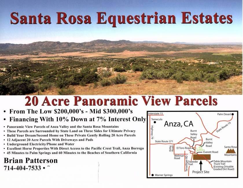 - Owner financing - 360 degree Panoramic views of Anza Valley and San Jacinto and Santa Rosa Mountains. Come build your home on this gently rolling 20 acre parcel. 700 ft Well and underground electricity, 2 water tanks . 20 acres for Sale or lease Possibly. lot 7 of 12 lot subdivision at Santa Rosa Estates. 700 ft well with Crystal clear water, Underground electricity, Anza Connect for Internet, great cell service. Bring your horses and farm animals. There is no house on this parcel. There is 100amp electric hookup, well. PCT trail close by for horse back riding , trail riding and exploring. Bring your dirt bikes or Quads to ride. Available for Nursery, Farming, keeping animals. Astronomer's dream? This 20 acre parcel in Santa Rosa Subdivision in Anza is super unique and private beyond belief. Surrounded by stunningly beautiful and serene landscapes. The lot sits on the edge of a wilderness canyon of Anza State Land. High desert flora and fauna await you along with dark starry nights and fresh clean air. The lot has plenty of usable land and is mostly Flat. Wonderful views of the mountains abound. Smooth Dirt Road accessible for all cars and trucks